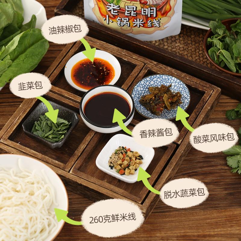 鲜米线包、香辣酱包、酸菜风味包、脱水蔬菜包、韭菜包、油辣椒包