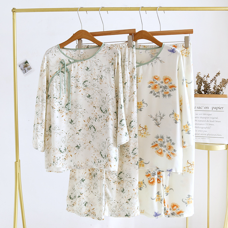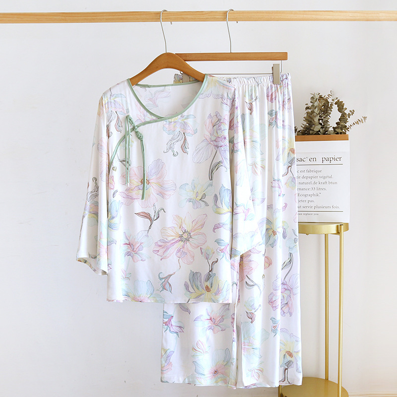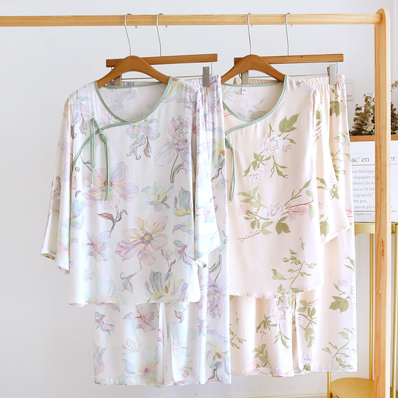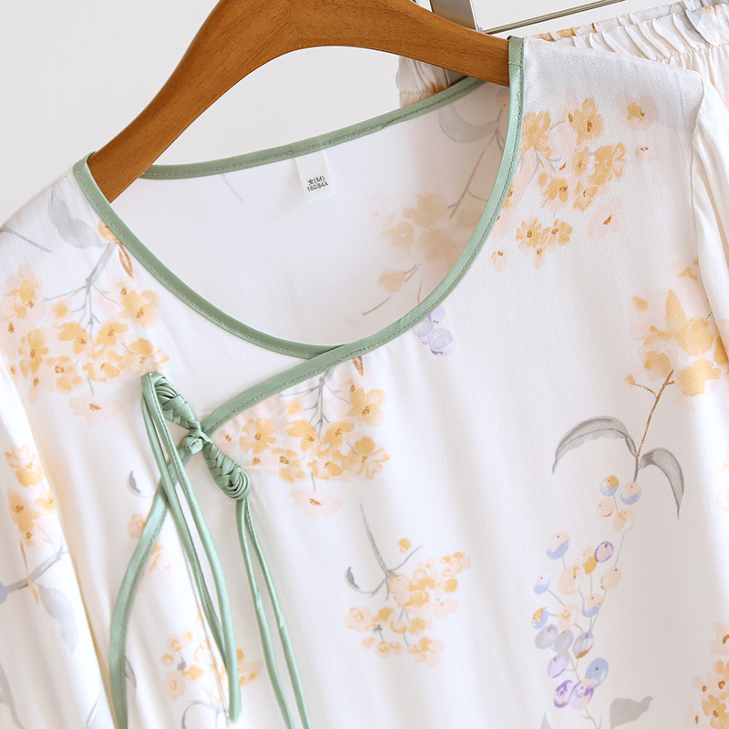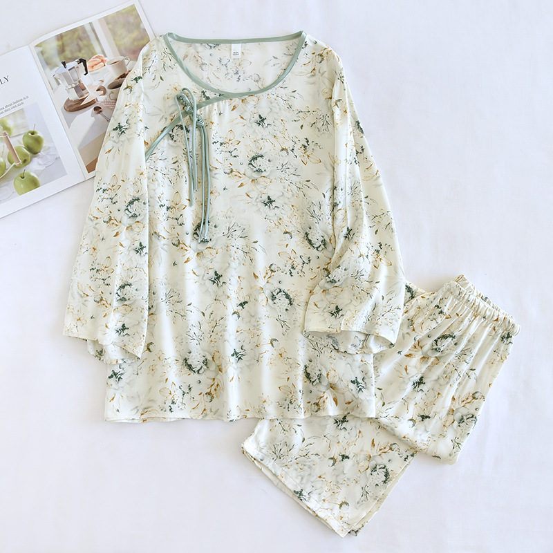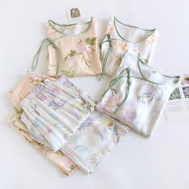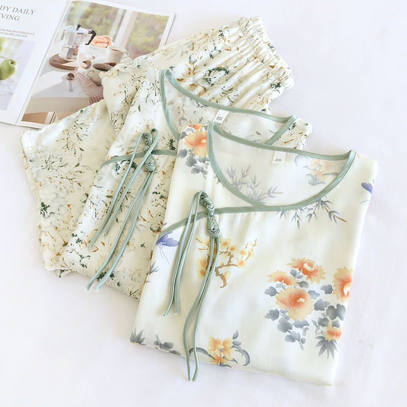雀说贡缎棉绸睡衣女春夏中式盘扣家居服套装薄款印花空调服中国风AL