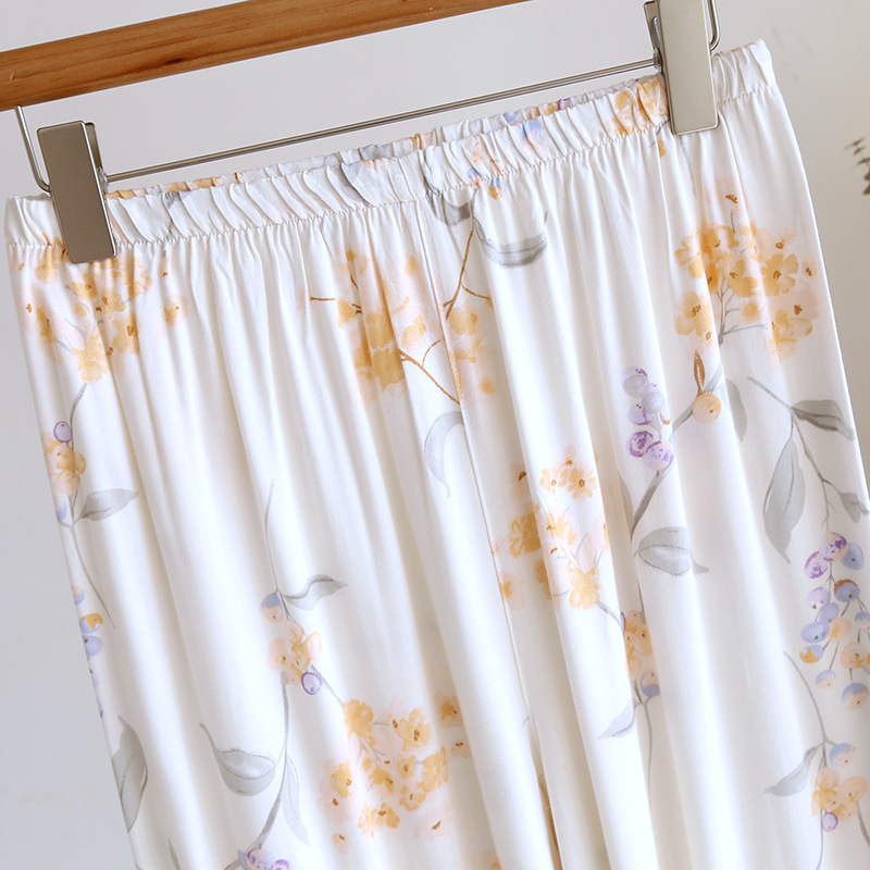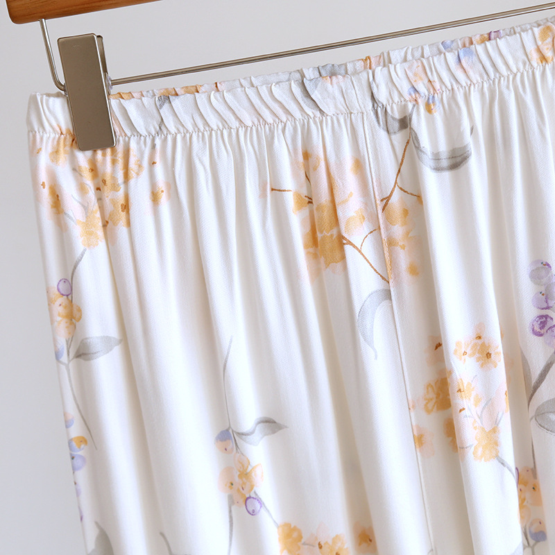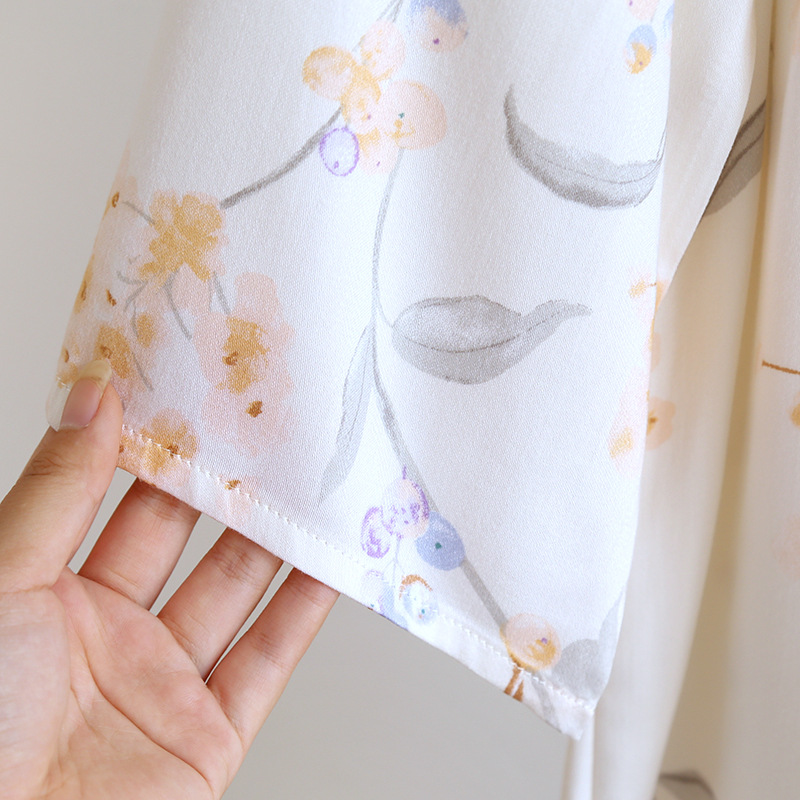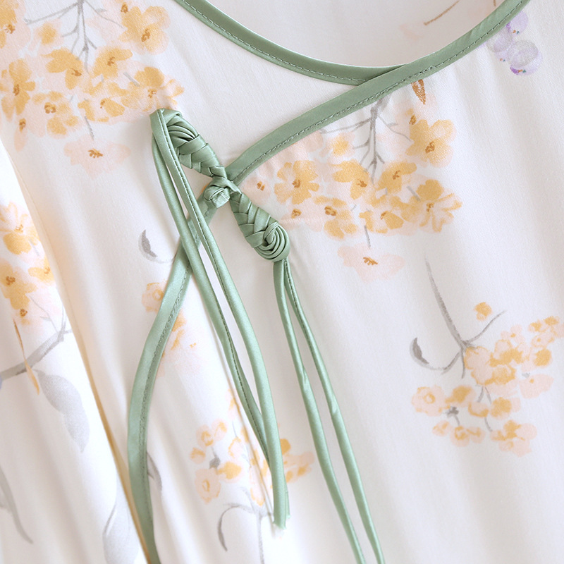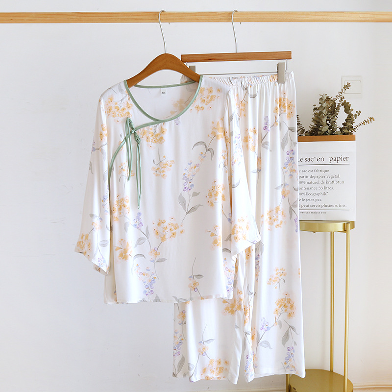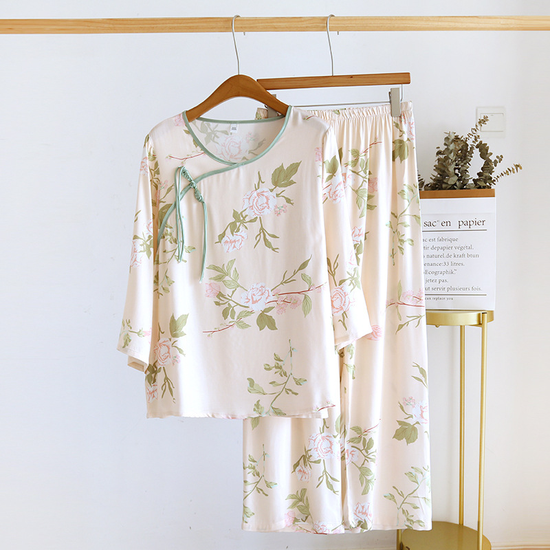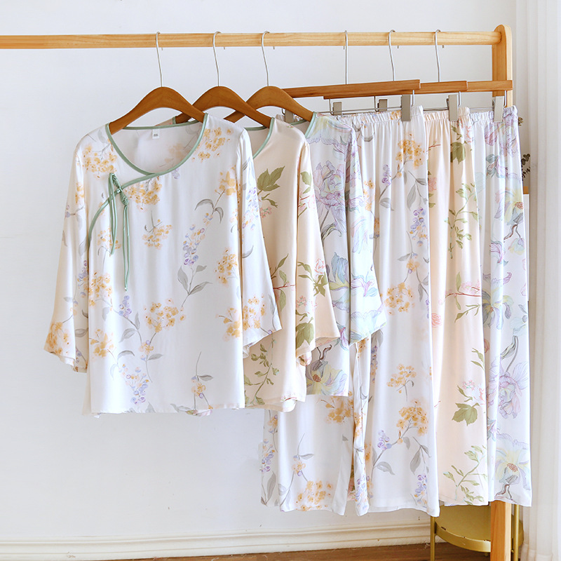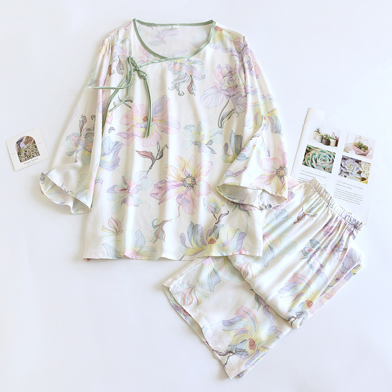 雀说贡缎棉绸睡衣女春夏中式盘扣家居服套装薄款印花空调服中国风AL