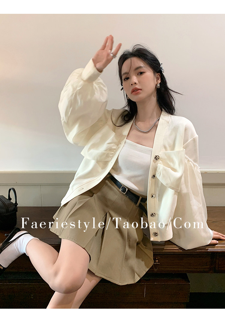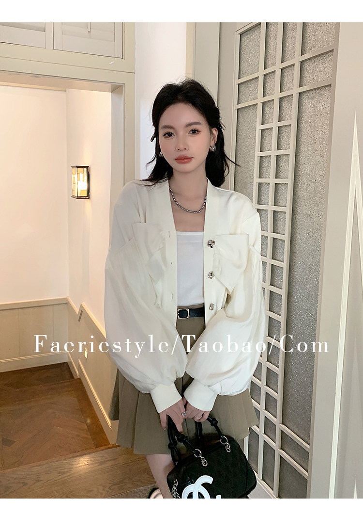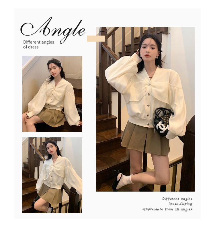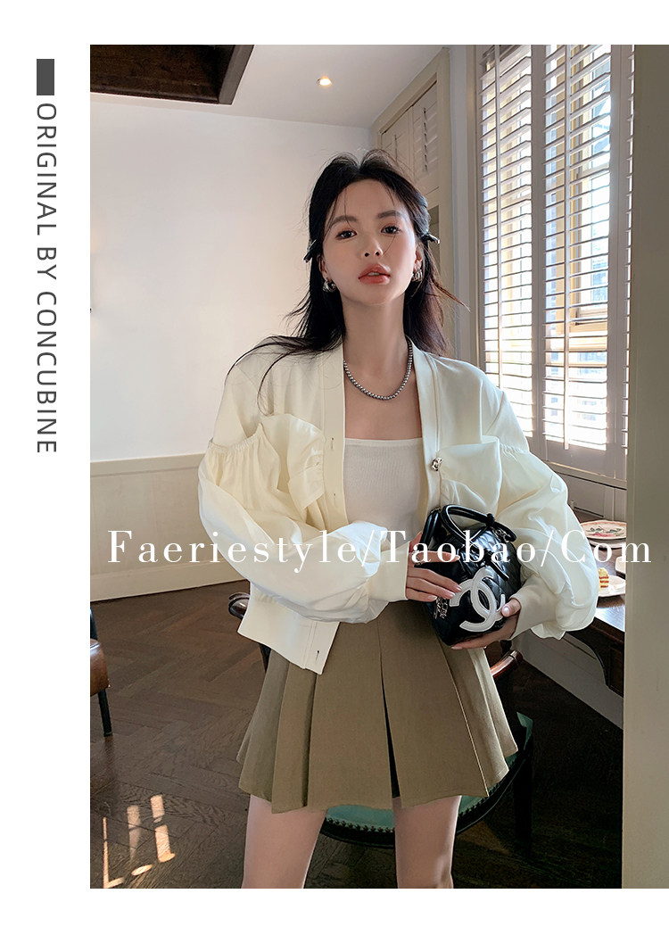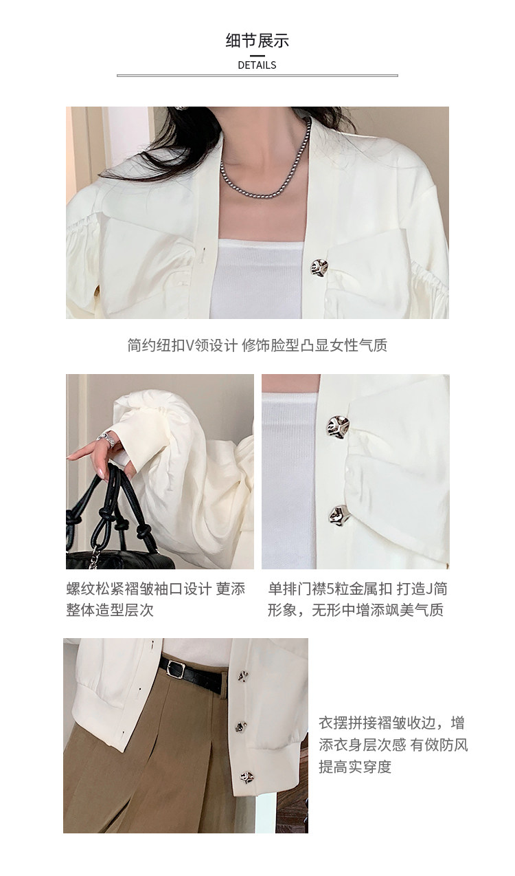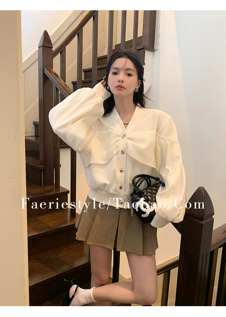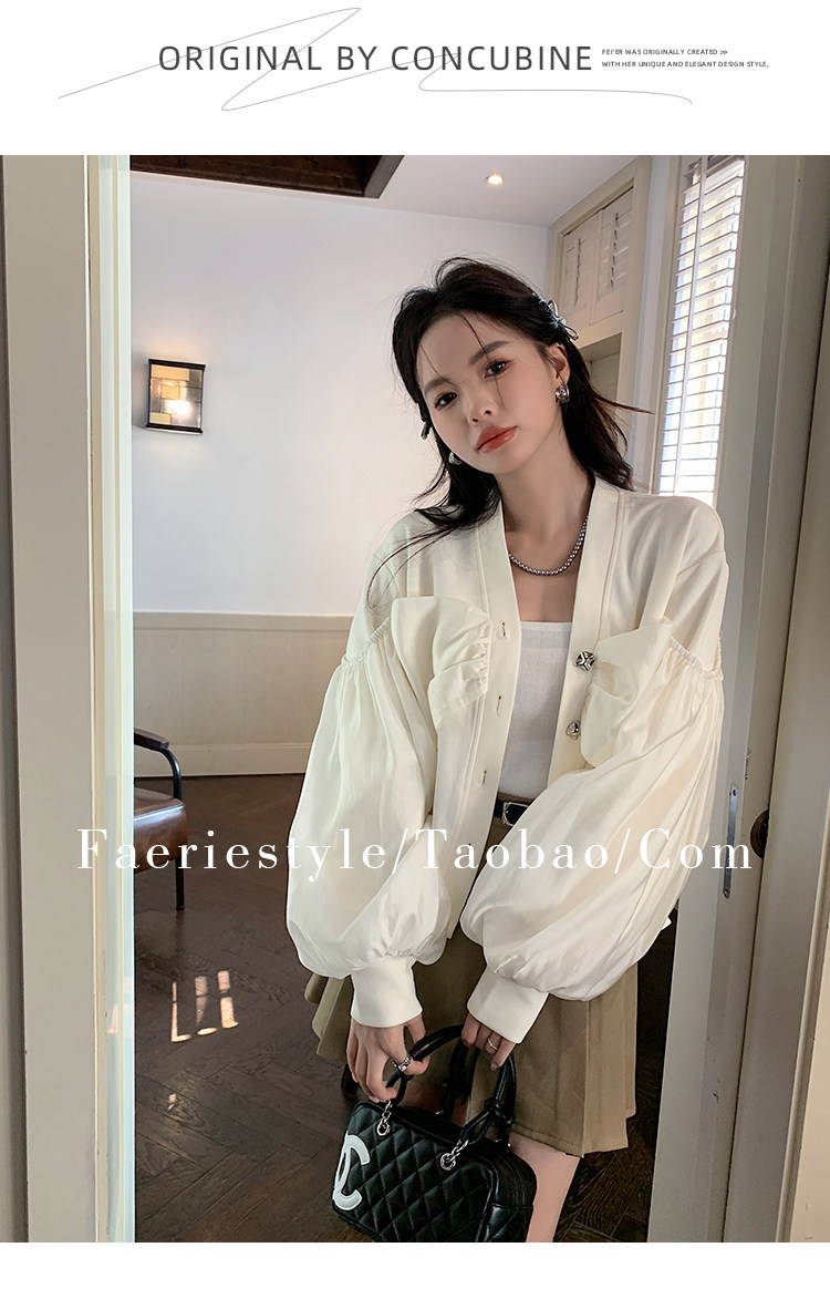 【设计师定制款】2928小香风外套女白色短款针织拼接泡泡袖V领高级感气质别致上衣-喜出