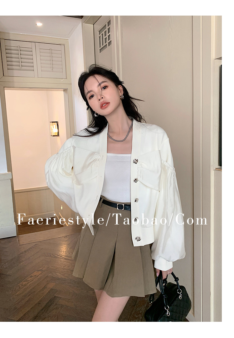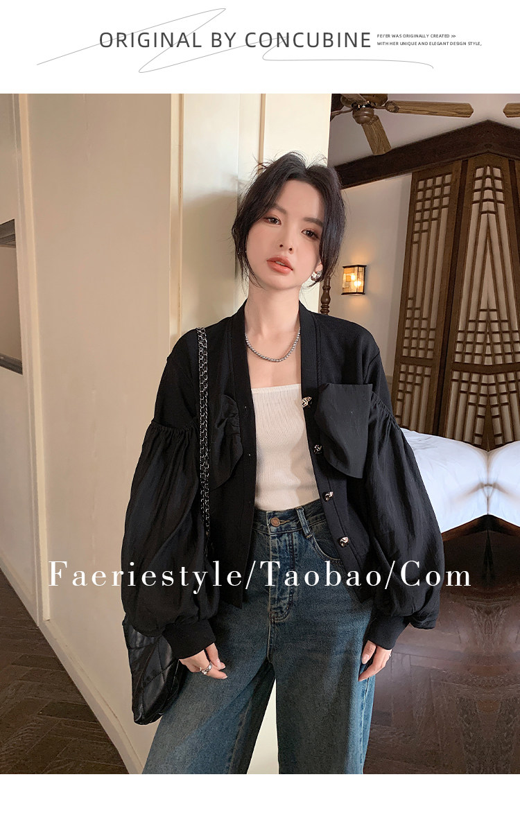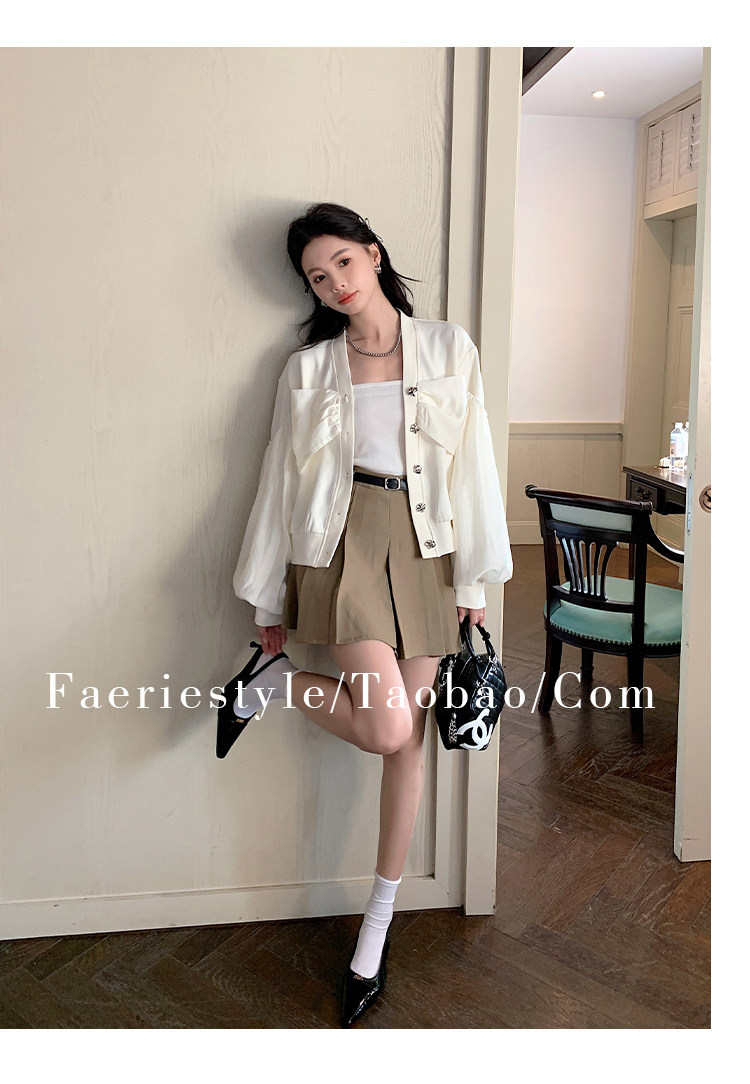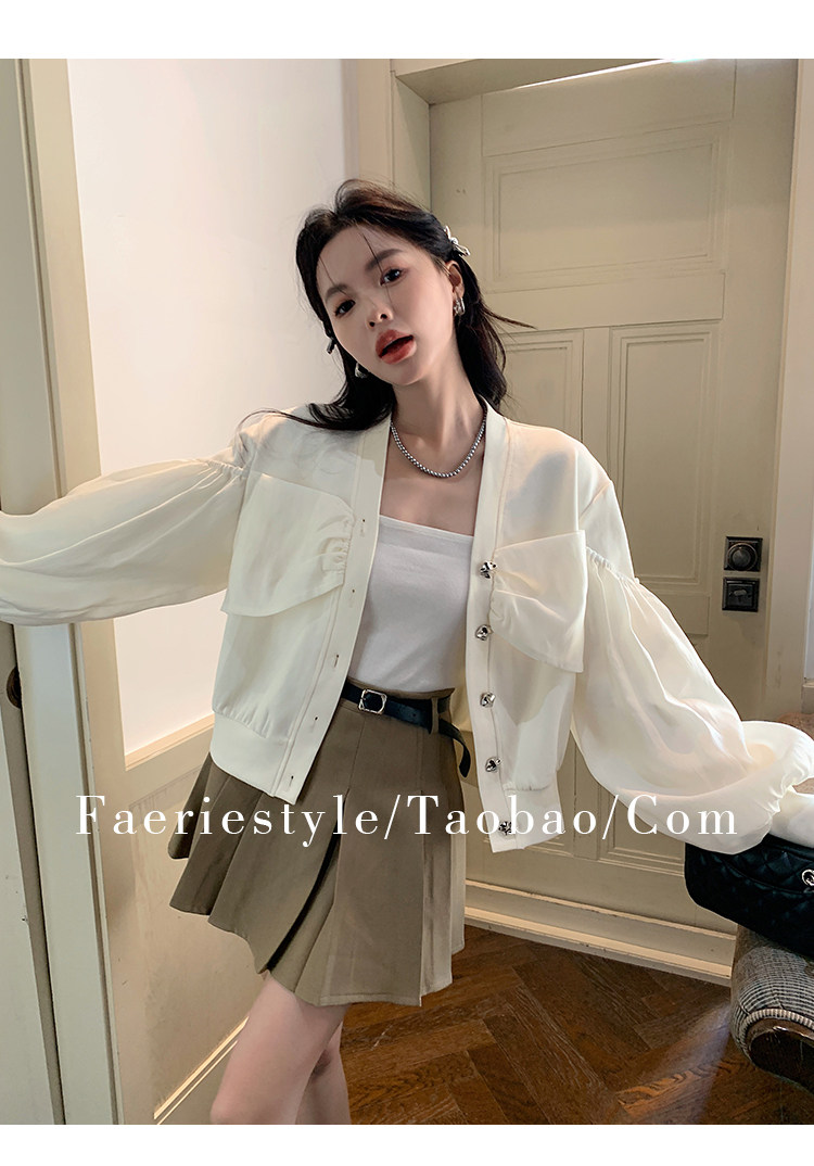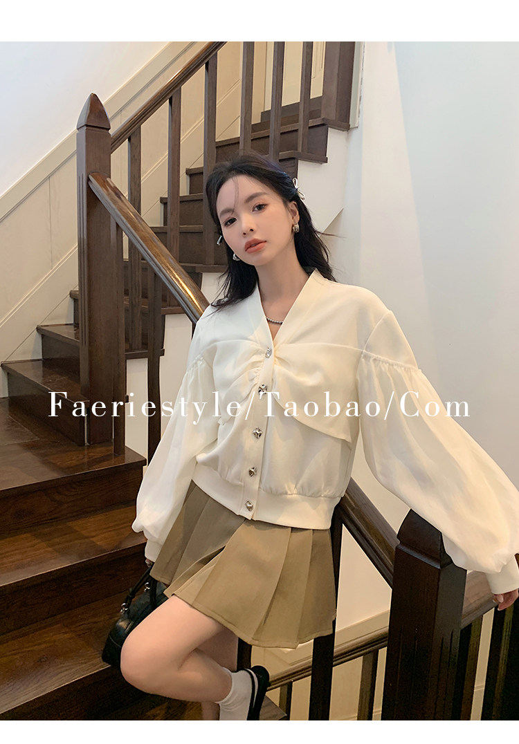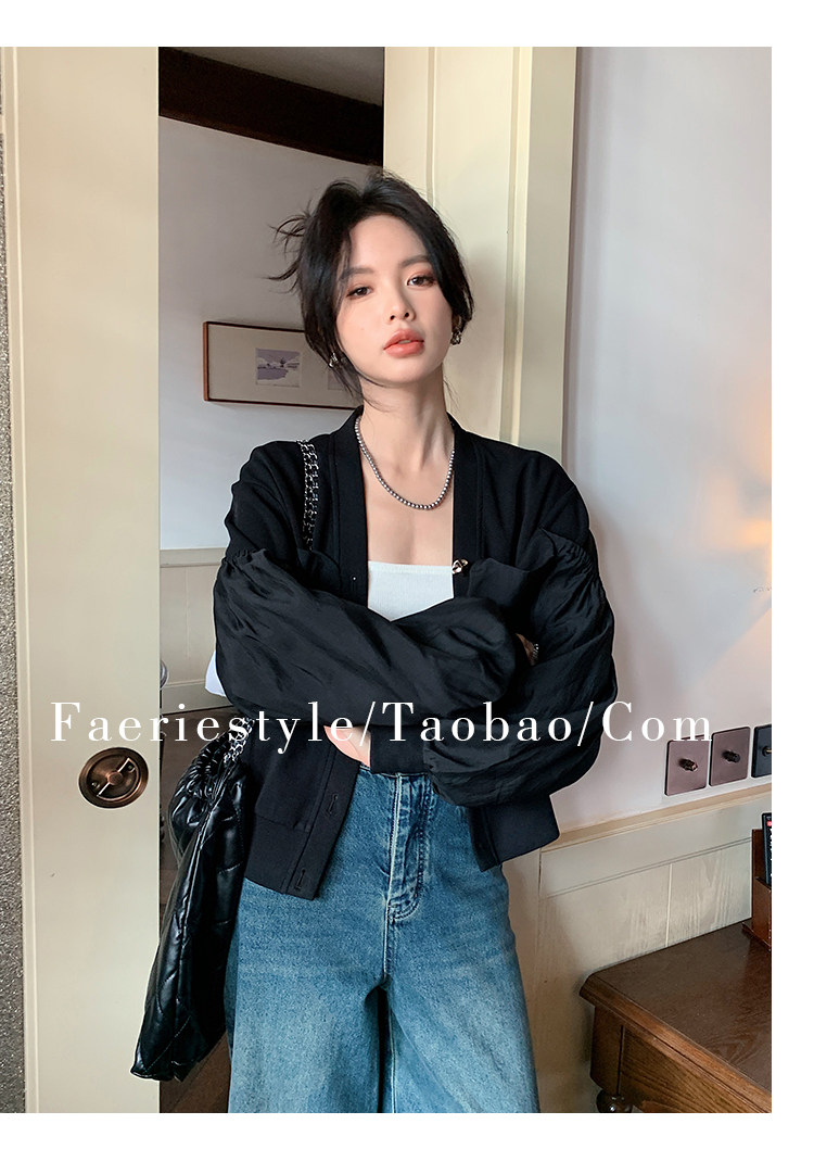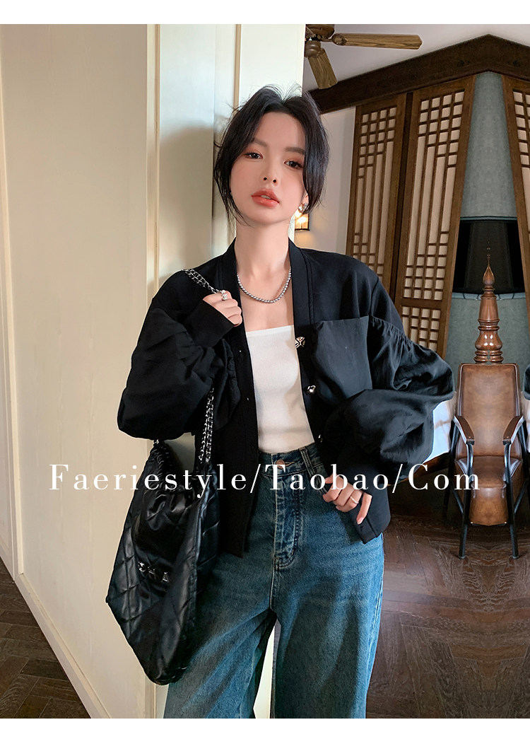 【设计师定制款】2928小香风外套女白色短款针织拼接泡泡袖V领高级感气质别致上衣-喜出