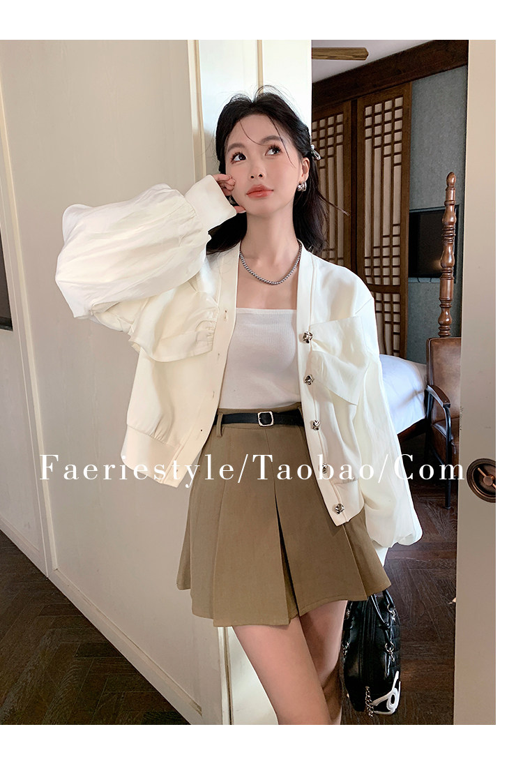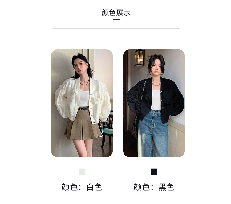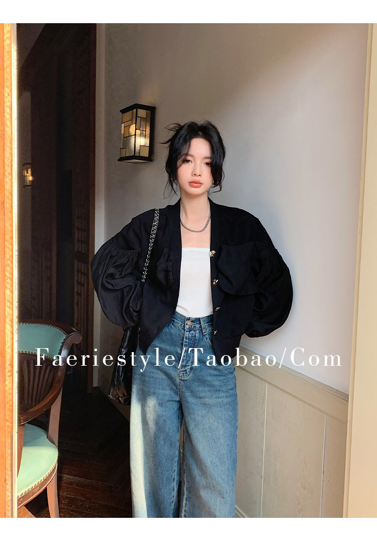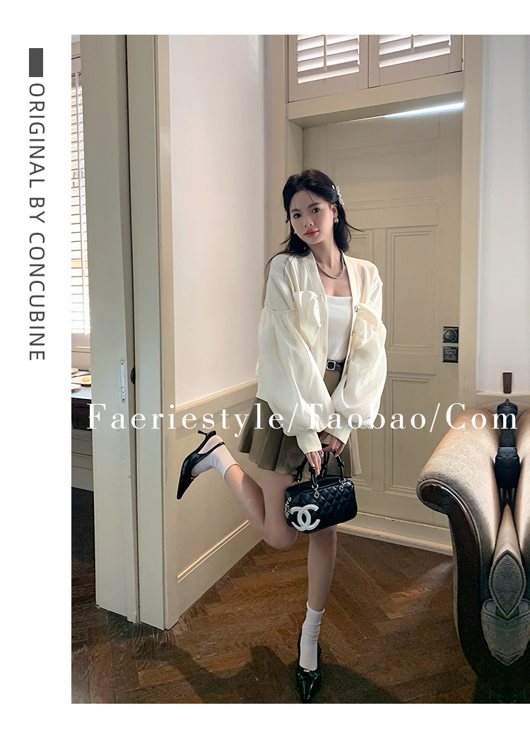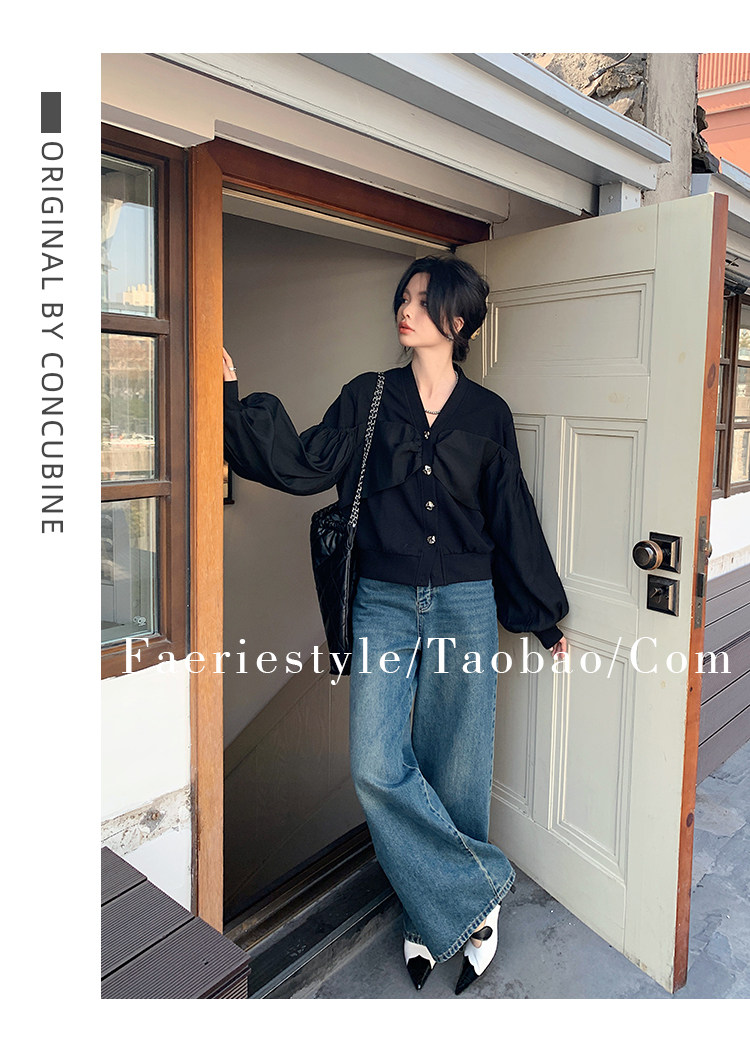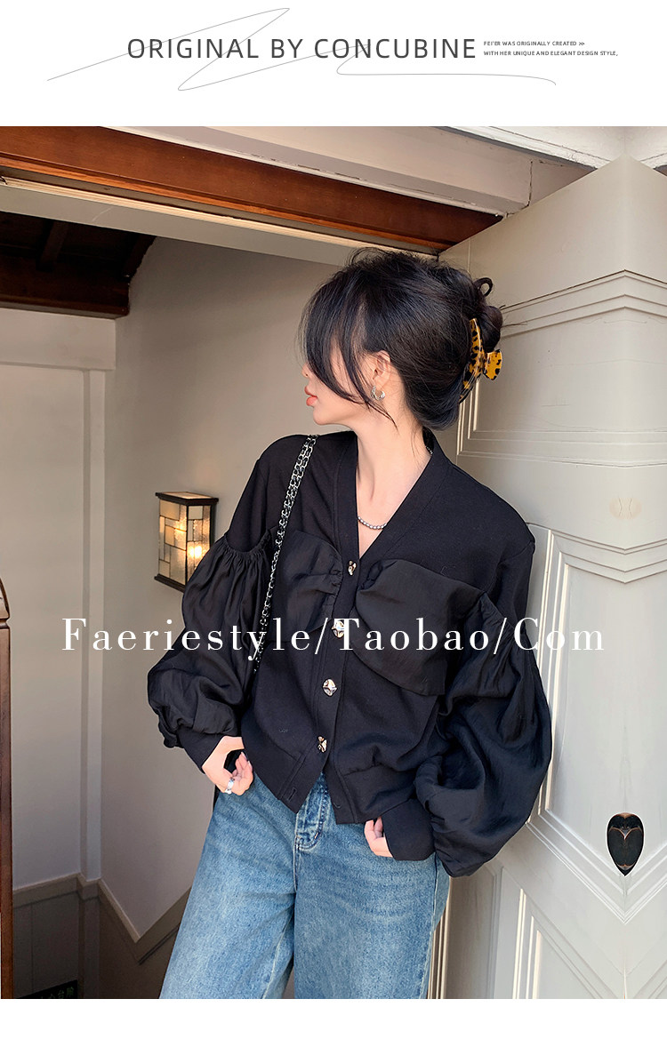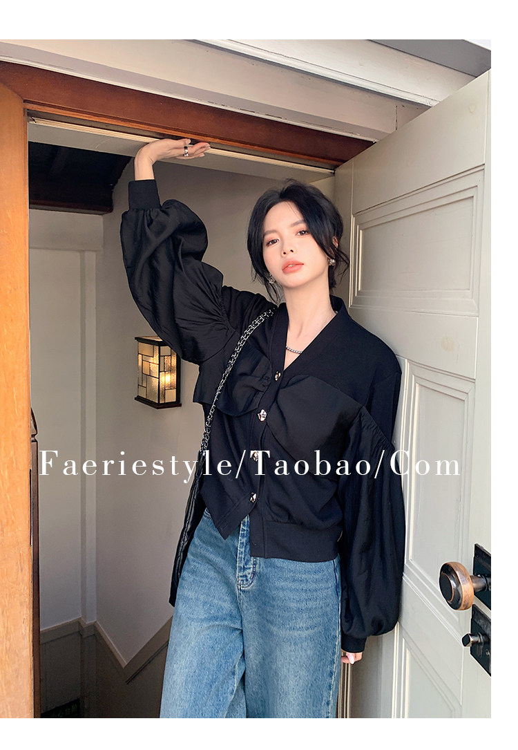 【设计师定制款】2928小香风外套女白色短款针织拼接泡泡袖V领高级感气质别致上衣-喜出