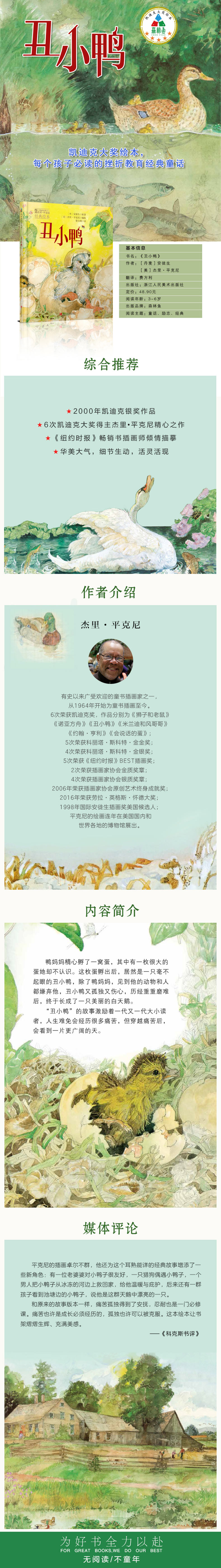 鸭妈妈精心孵了一窝蛋,其中有一枚很大的蛋她却不认识。这枚蛋孵出后,居然是一只毫不起眼丑小鸭,除了鸭妈妈,见到他的动物和人都嫌弃他,丑小鸭又孤独又伤心,历经重重磨难后,终于长成了一只美丽的白天鹅。“丑小鸭”的故事激励着一代又一代大小读者,人生难免会经历很多痛苦,但穿越痛苦后,会看到一片更广阔的天。