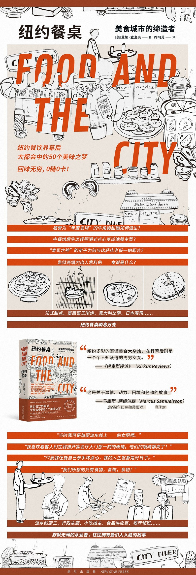 从星级酒店到街边小吃摊,从餐厅老板到食品供应商、糕点师傅、侍者……来自各种文化背景、各个行当的人们讲述着他们与美食、与纽约结缘的故事:入行契机、厨室机密、难以忘怀的味道,个中苦辣酸甜。