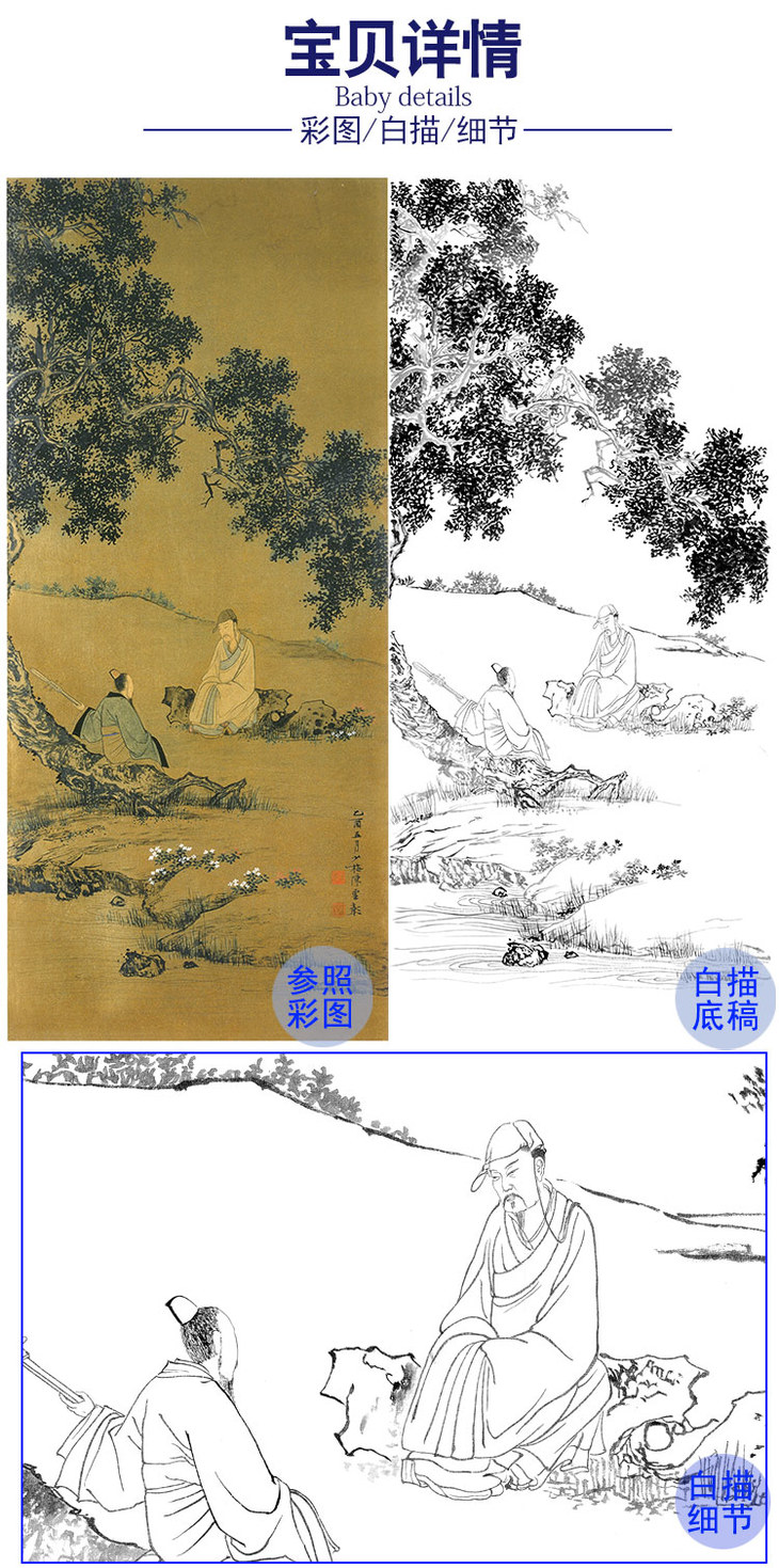 陈少梅竖幅工笔山水人物白描底稿-《听琴》-多种白描尺寸可选-CR68