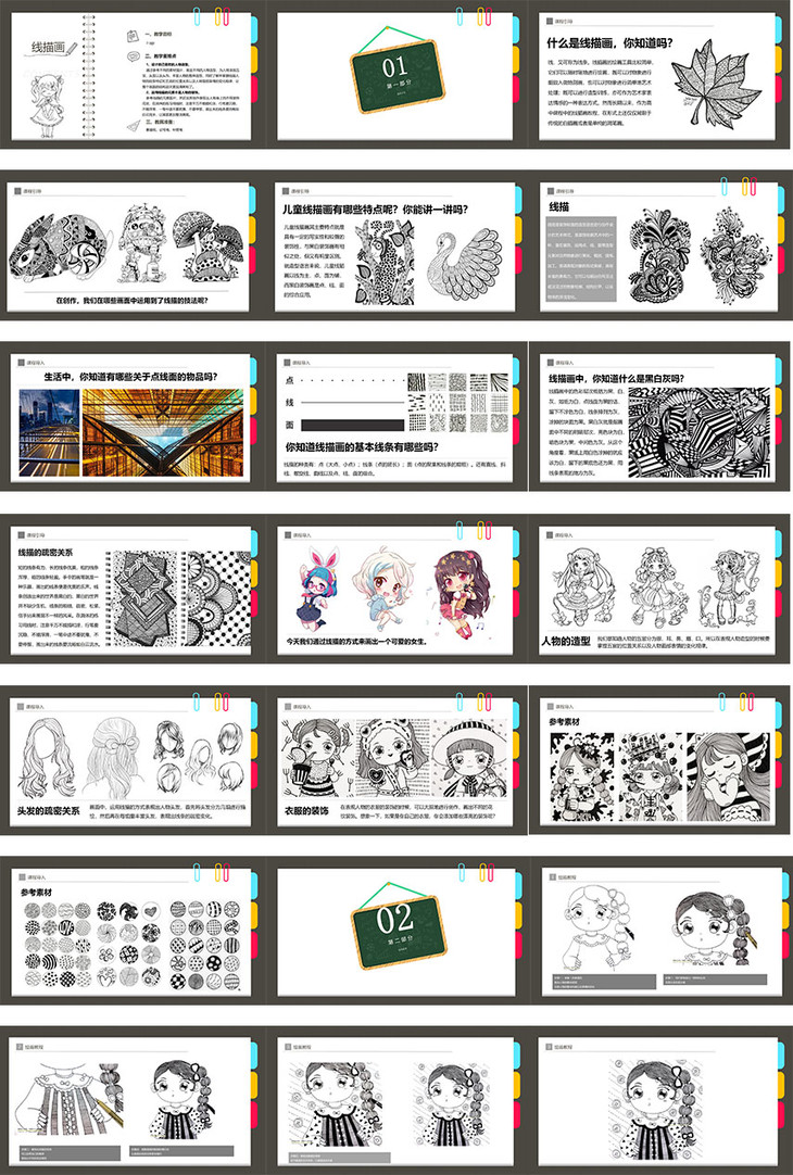 通过参考不同的素材图片,画出不同的人物造型,为人物添加五官、头发以及头饰,丰富人物的整体造型,同时了解并掌握线描人物的脸型特征和五官的位置关系以及人物面部表情的变化规律,让整个画面的结构层次更加清晰明了。