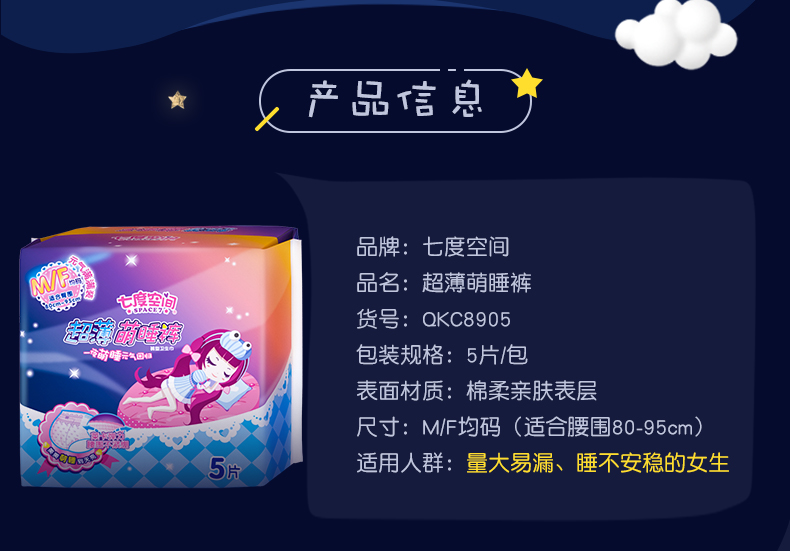 七度空间 (SPACE7)少女萌睡裤系列 萌睡安心裤 超薄超长夜用裤型卫生巾(M/F码*5片)