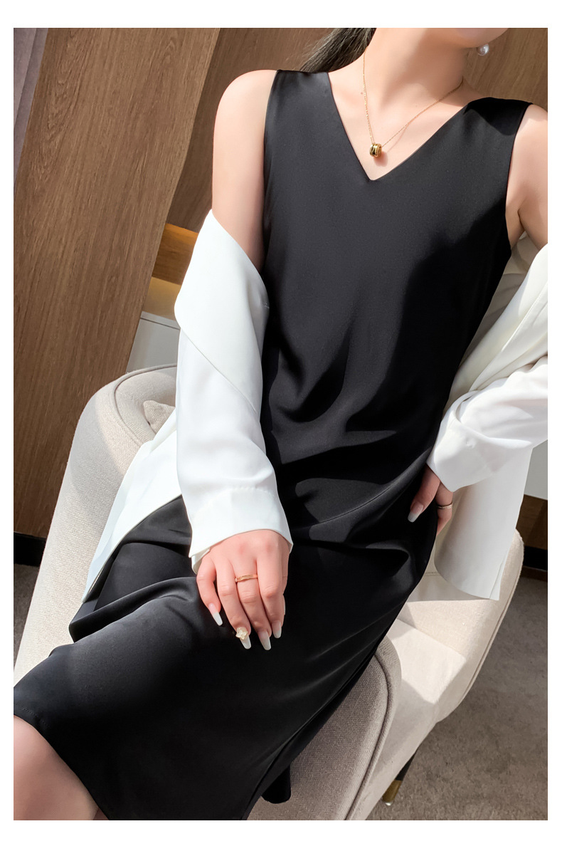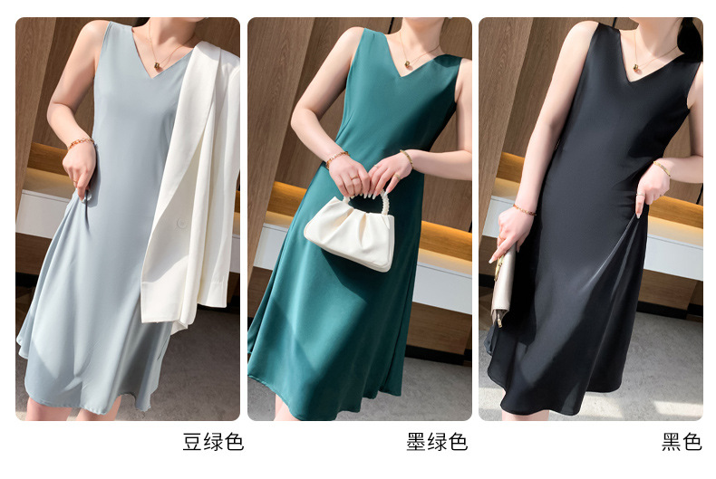 QHJY-JY2292夏装缎面吊带裙女式时尚连衣裙前后V领内搭外穿中长款背心裙