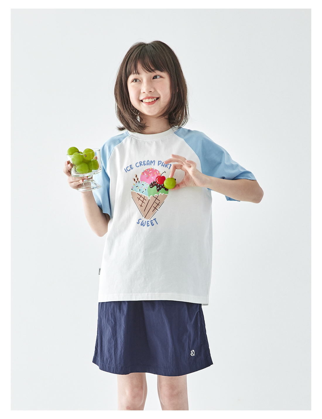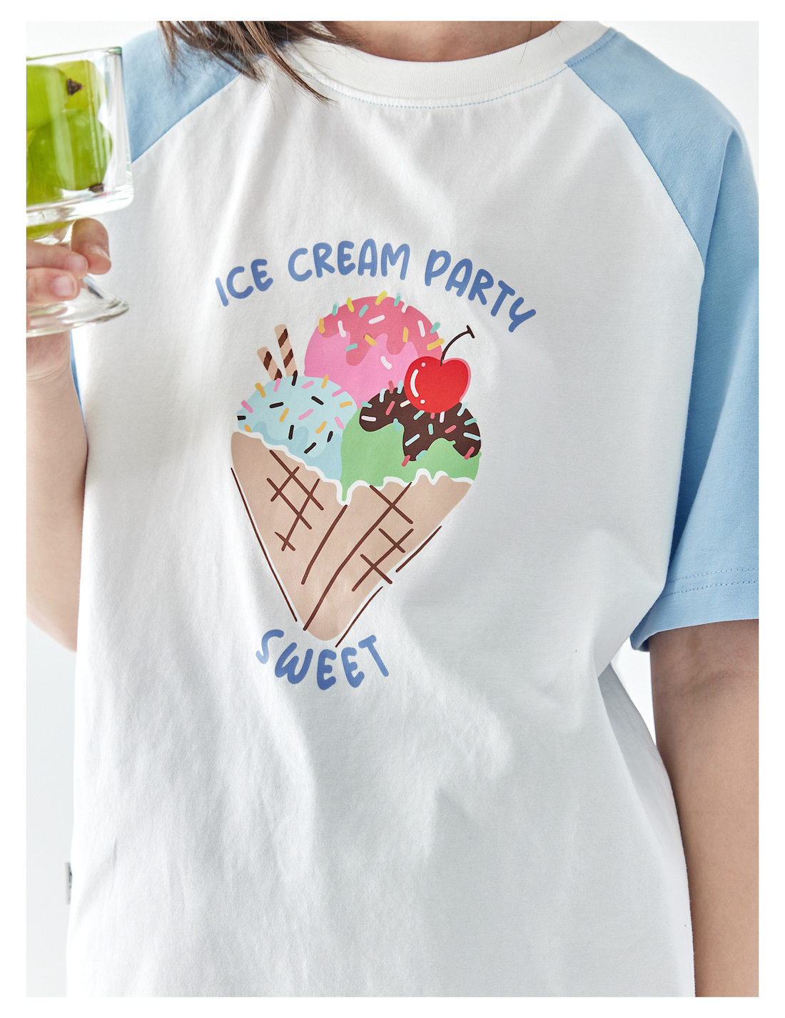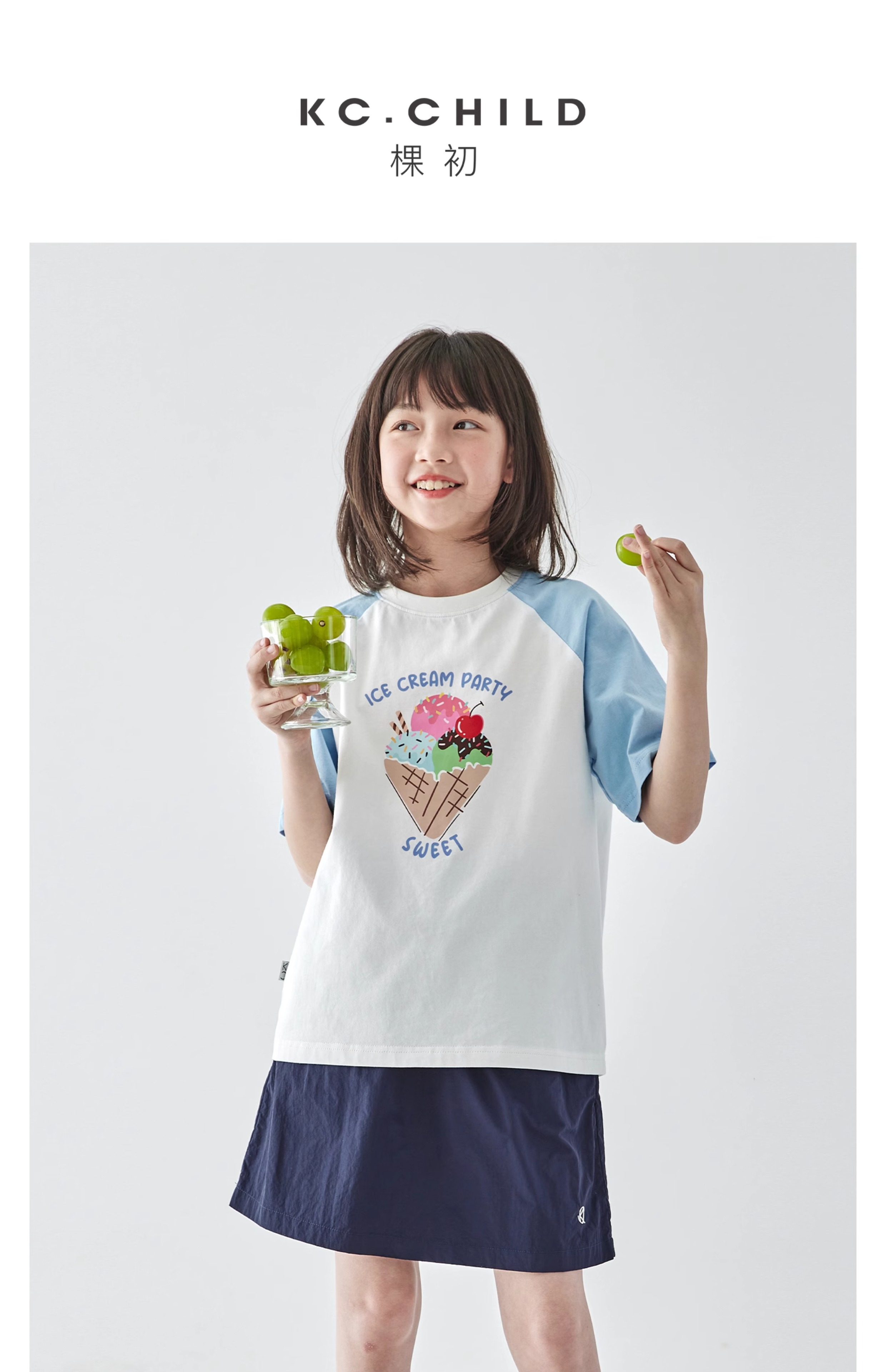 棵初2025年夏季新款亲子中大女童插肩拼色印花短袖T恤纯棉