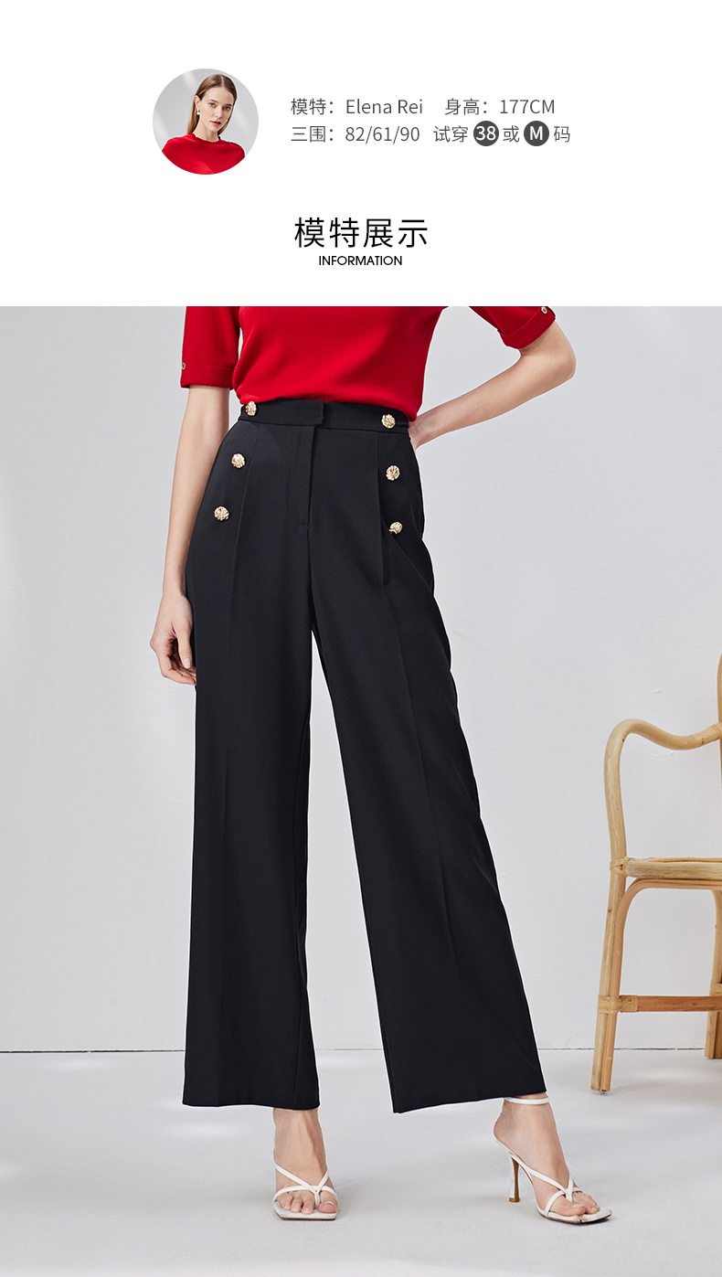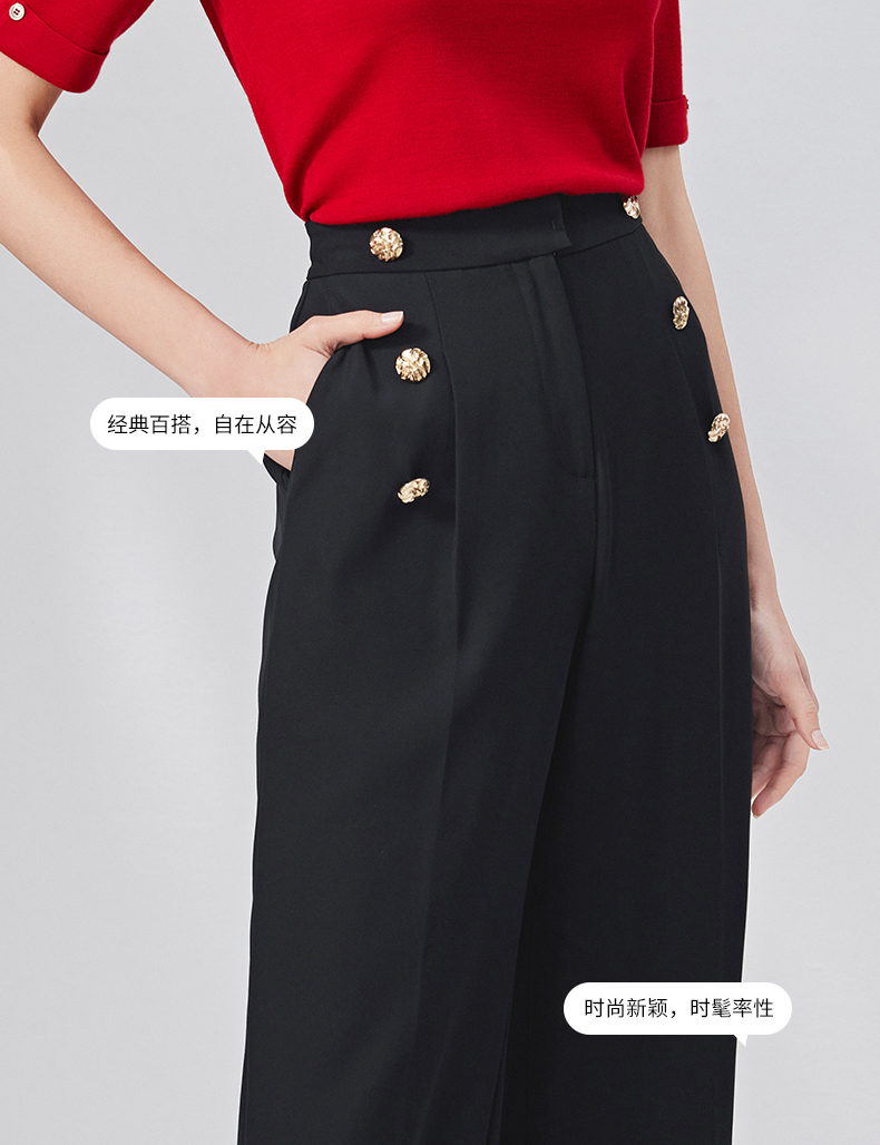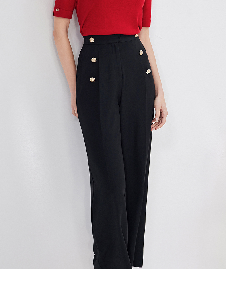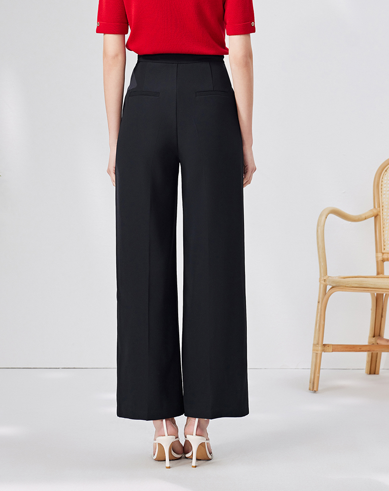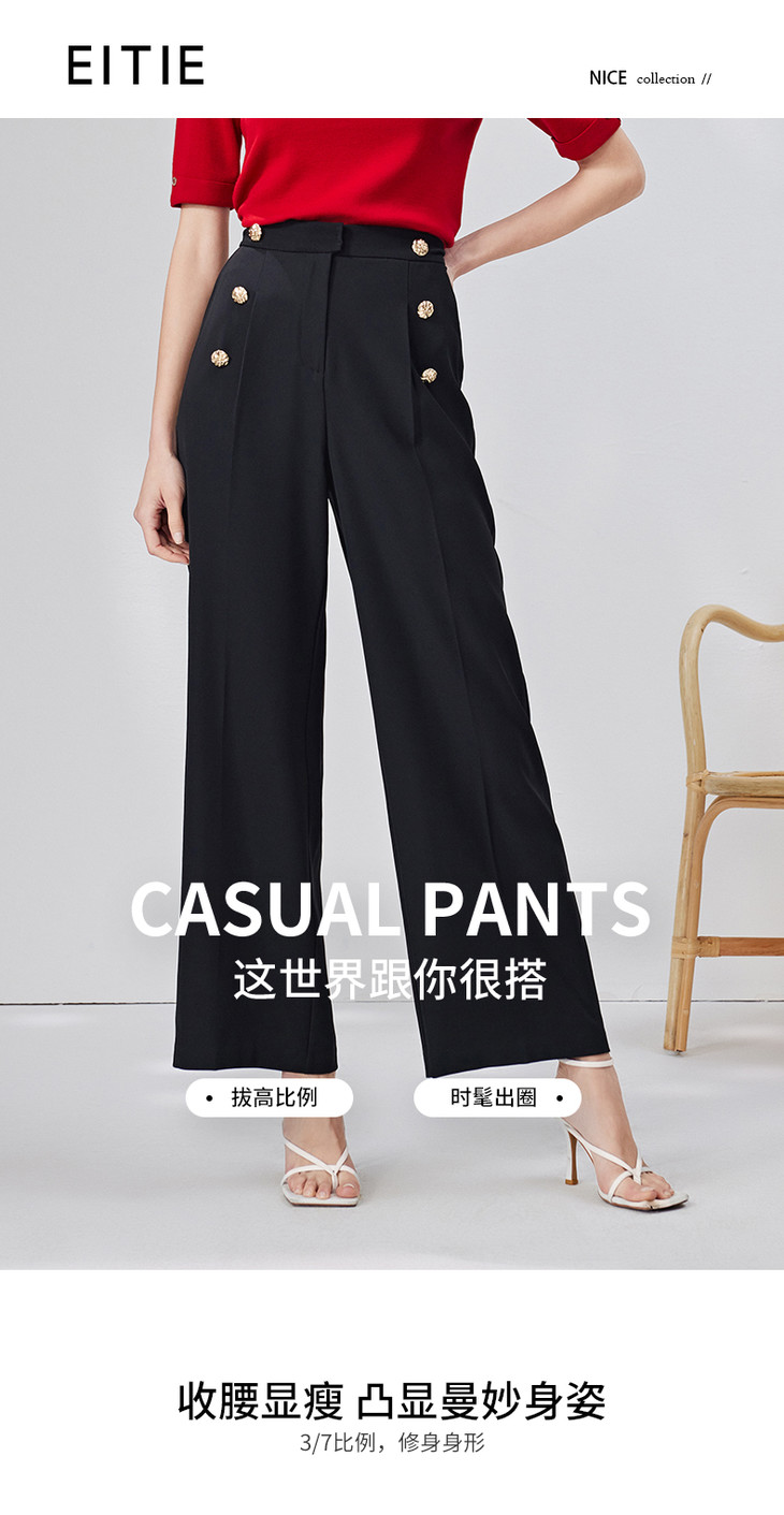 EITIE爱特爱春季新款高腰显瘦黑色微喇休闲裤女气质通勤时尚裤子A2205907