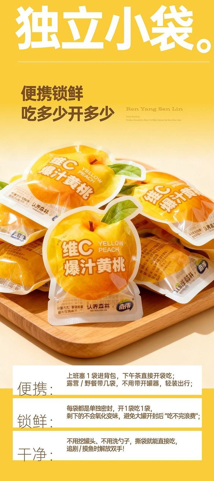 💛 独立小袋密封锁鲜 牢牢锁住黄桃🍑的水分和香气 拆开还是刚采摘般的新鲜口感💦 ✔️ 不管是放包里当下午茶、塞口袋当运动补给 ✔️ 还是给孩子当健康零食 都干净又方便,随时随地实现黄桃自由~