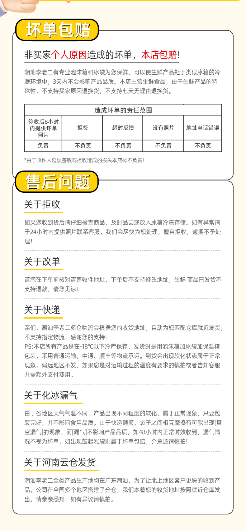 1.冻品收到些许化冻正常现象,及时冷冻起来不影响食用,介意慎拍! 2. 生鲜食品不支持7天无理由退换,介意慎拍! 3. 请勿拒收!出单号后不可撤单,拦截,签收后请及时验货,如遇发错/漏发请在签收后24小时内,将快递面单+商品实图同框拍照,加上订单信息一起发给客服,超过24小时不做任何售后处理!