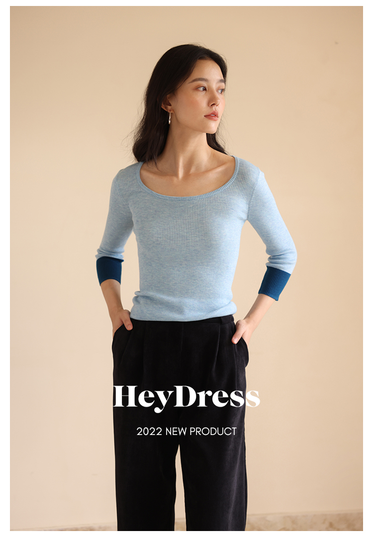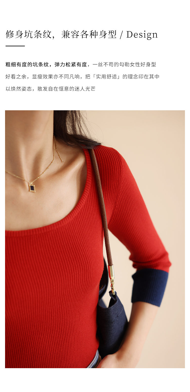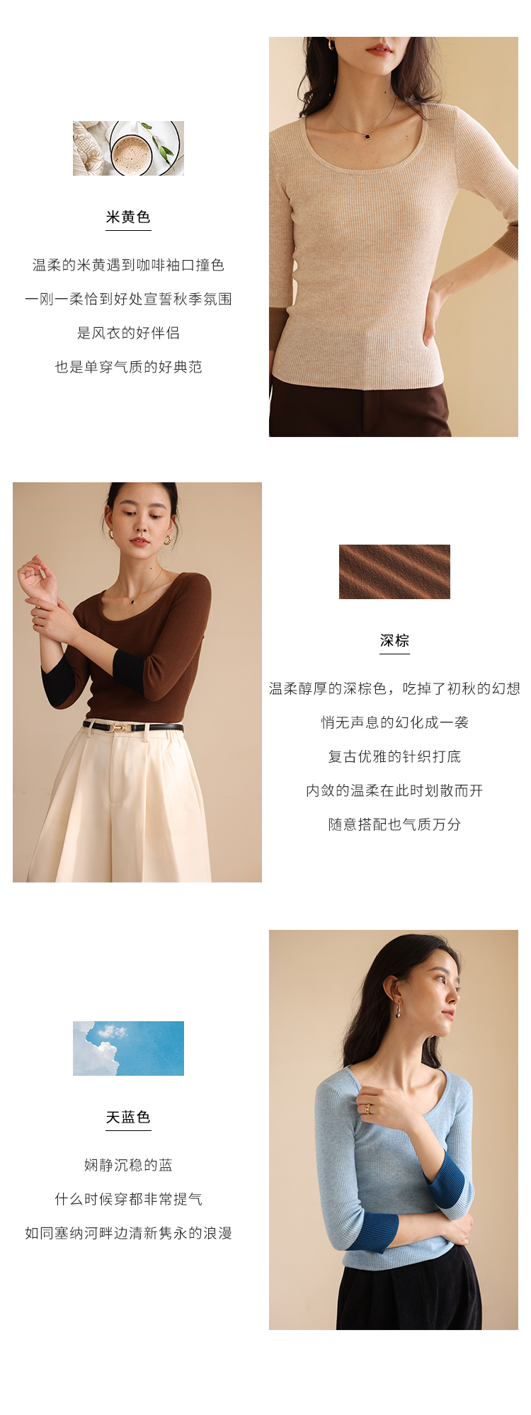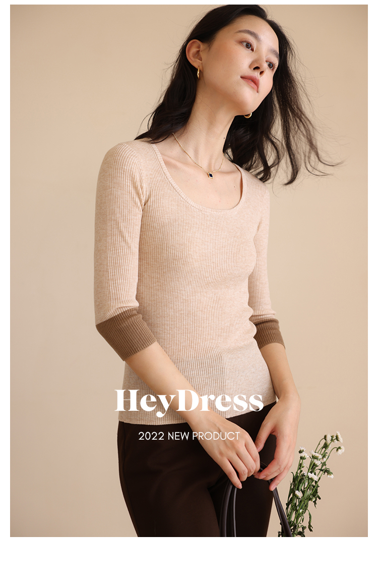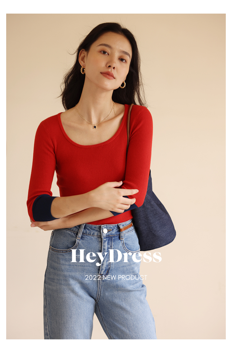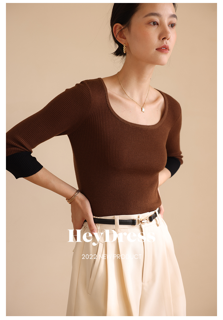 HeyDress法式圆领针织衫女秋季撞色九分袖设计打底衫修身别致上衣