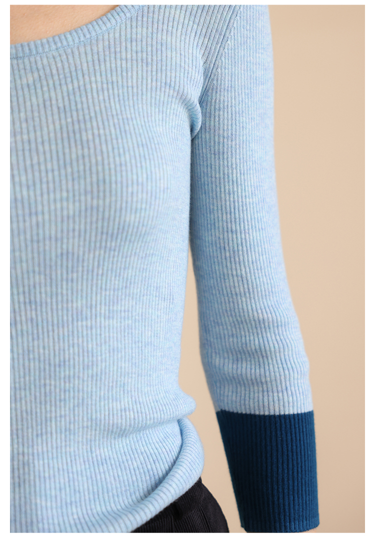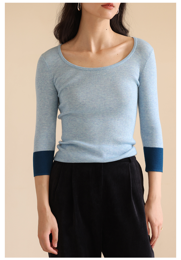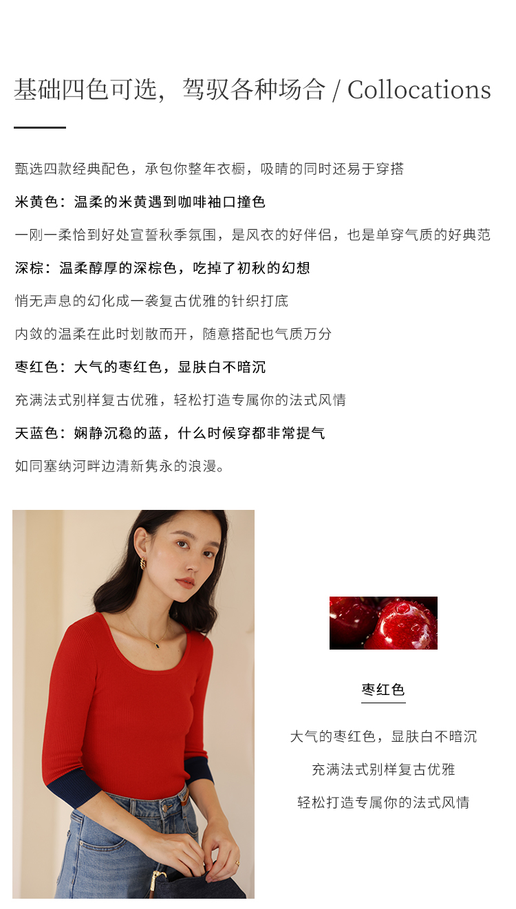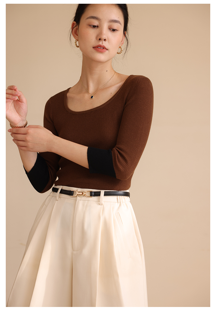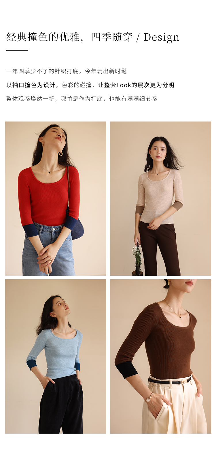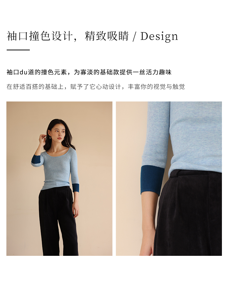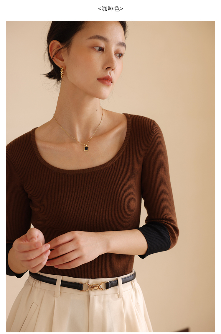 HeyDress法式圆领针织衫女秋季撞色九分袖设计打底衫修身别致上衣