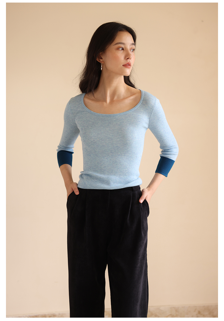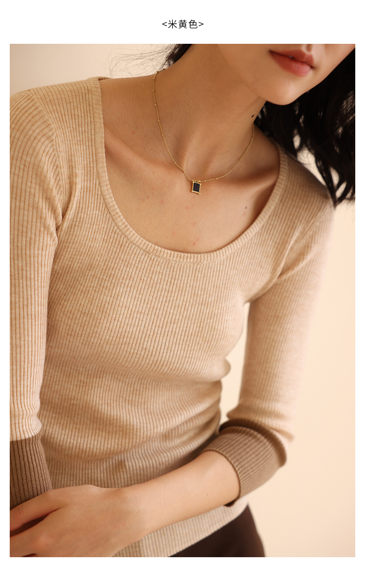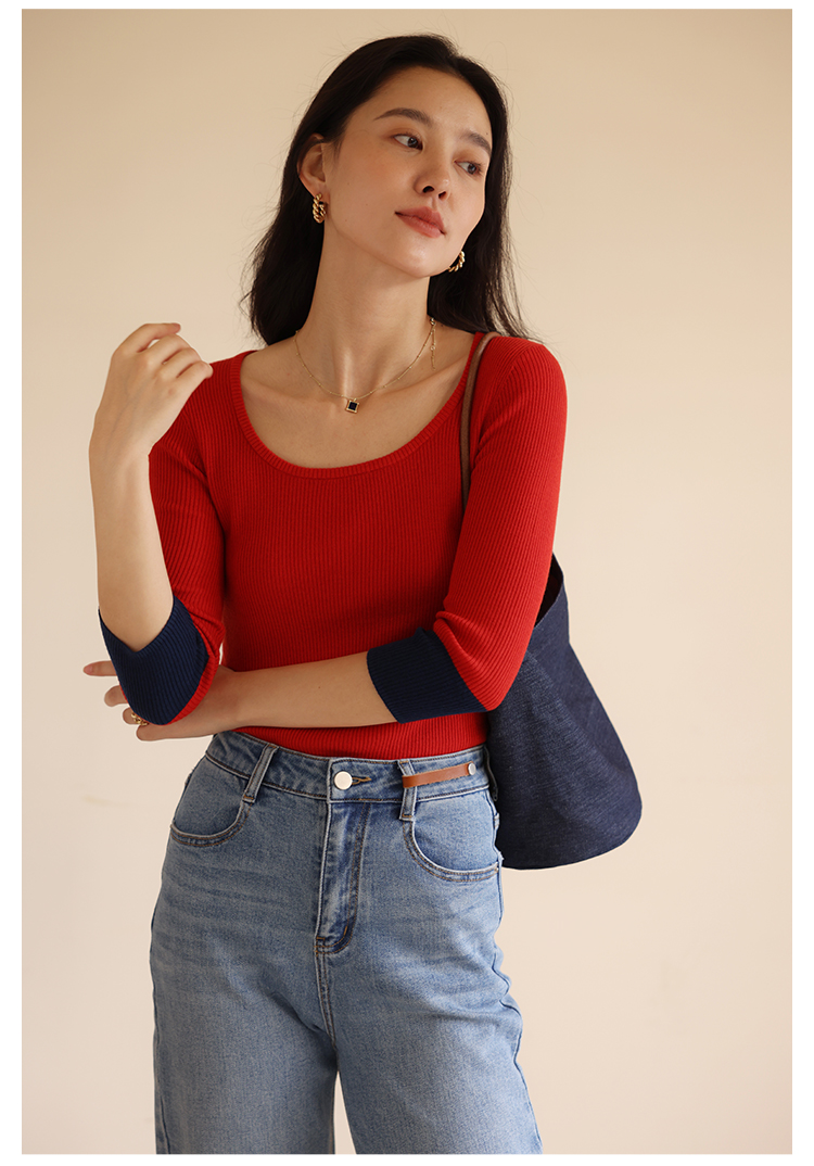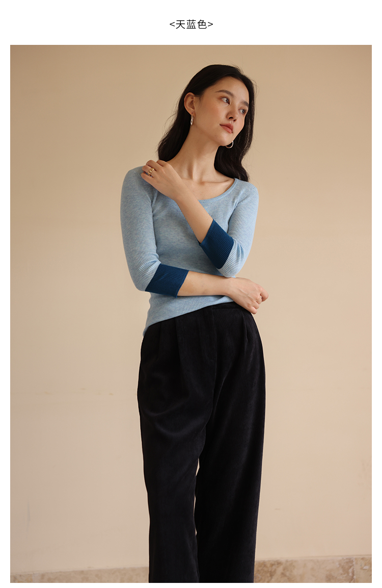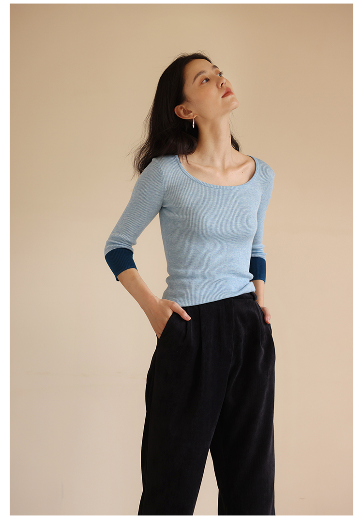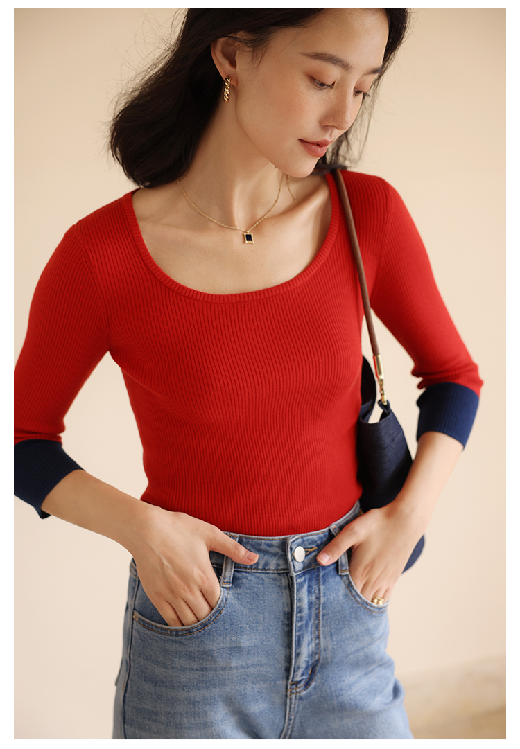 HeyDress法式圆领针织衫女秋季撞色九分袖设计打底衫修身别致上衣