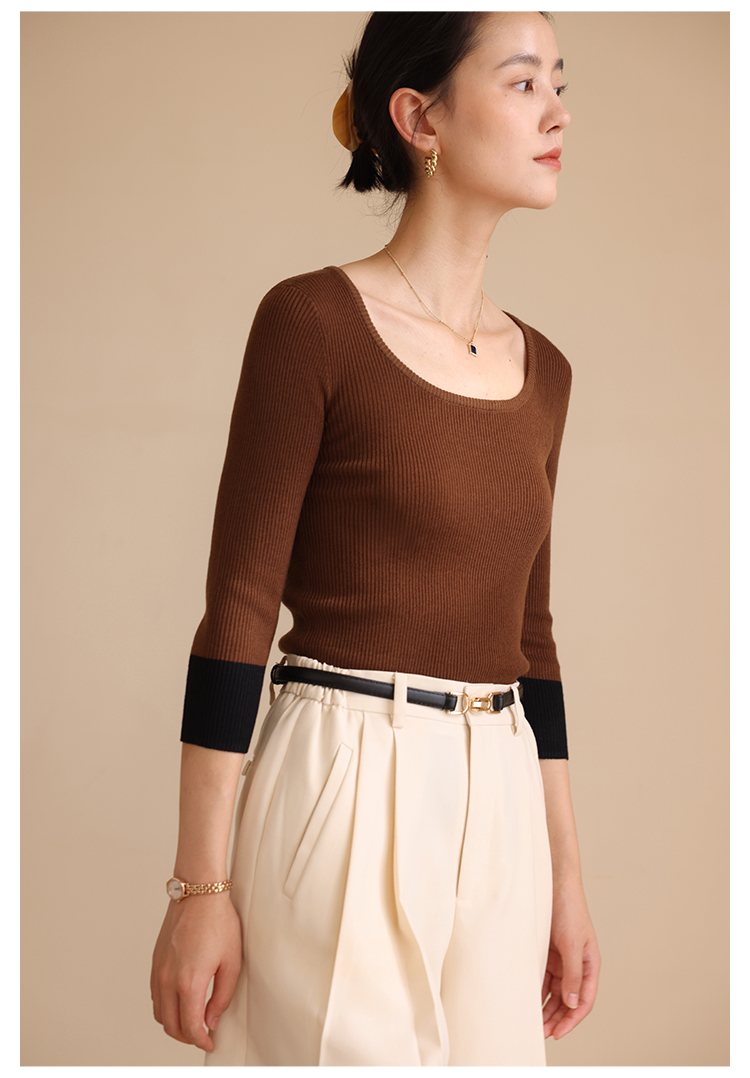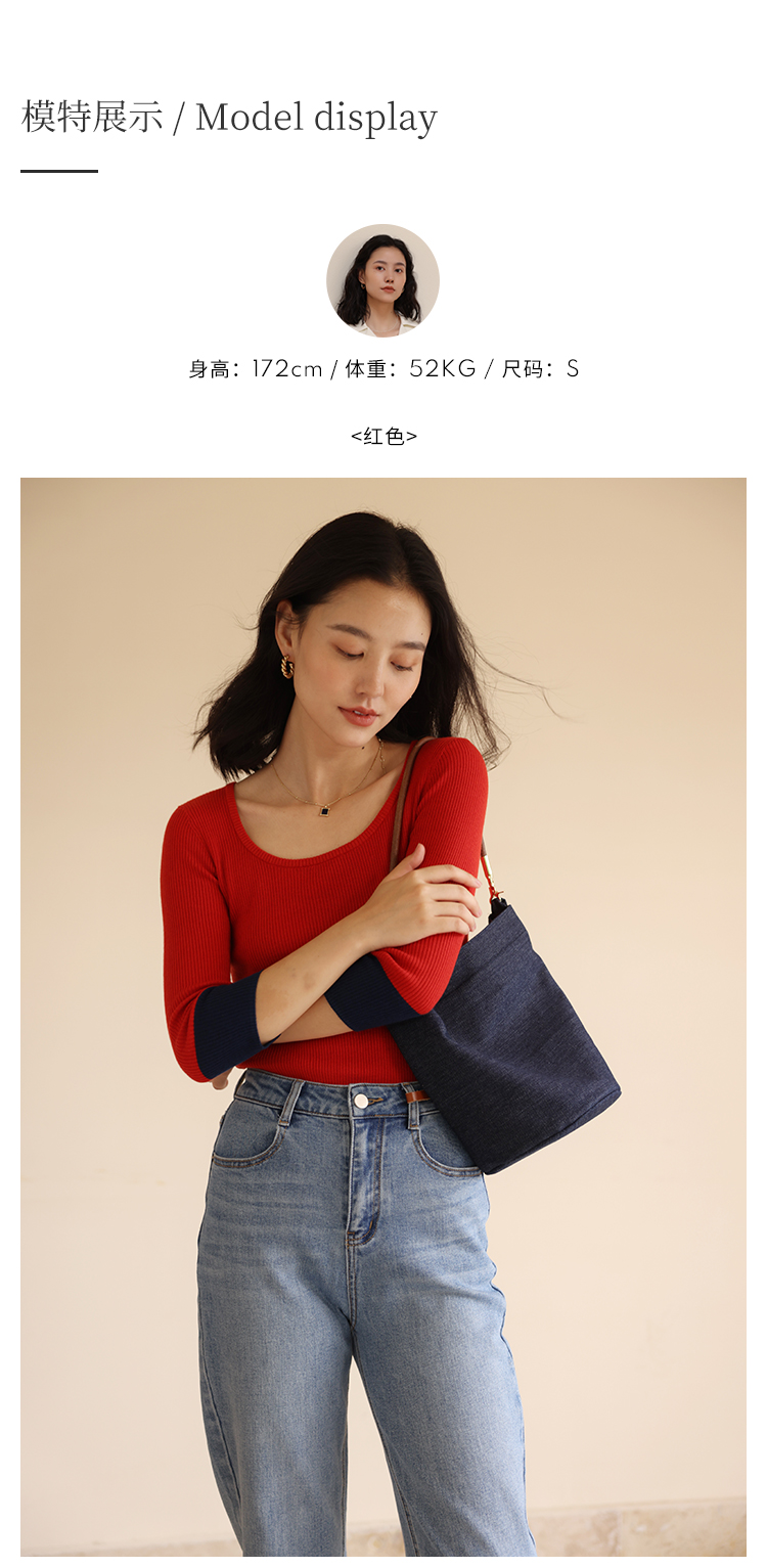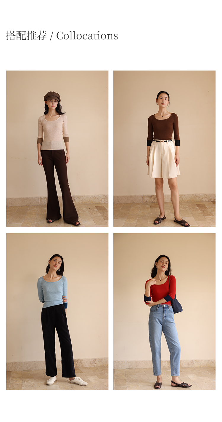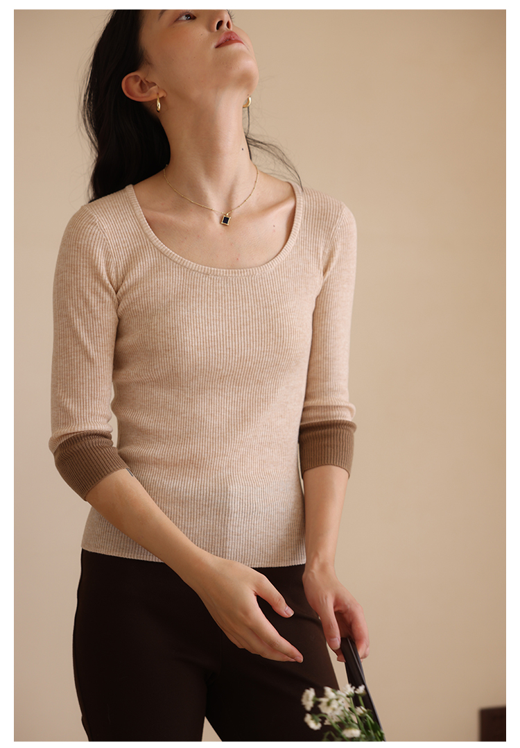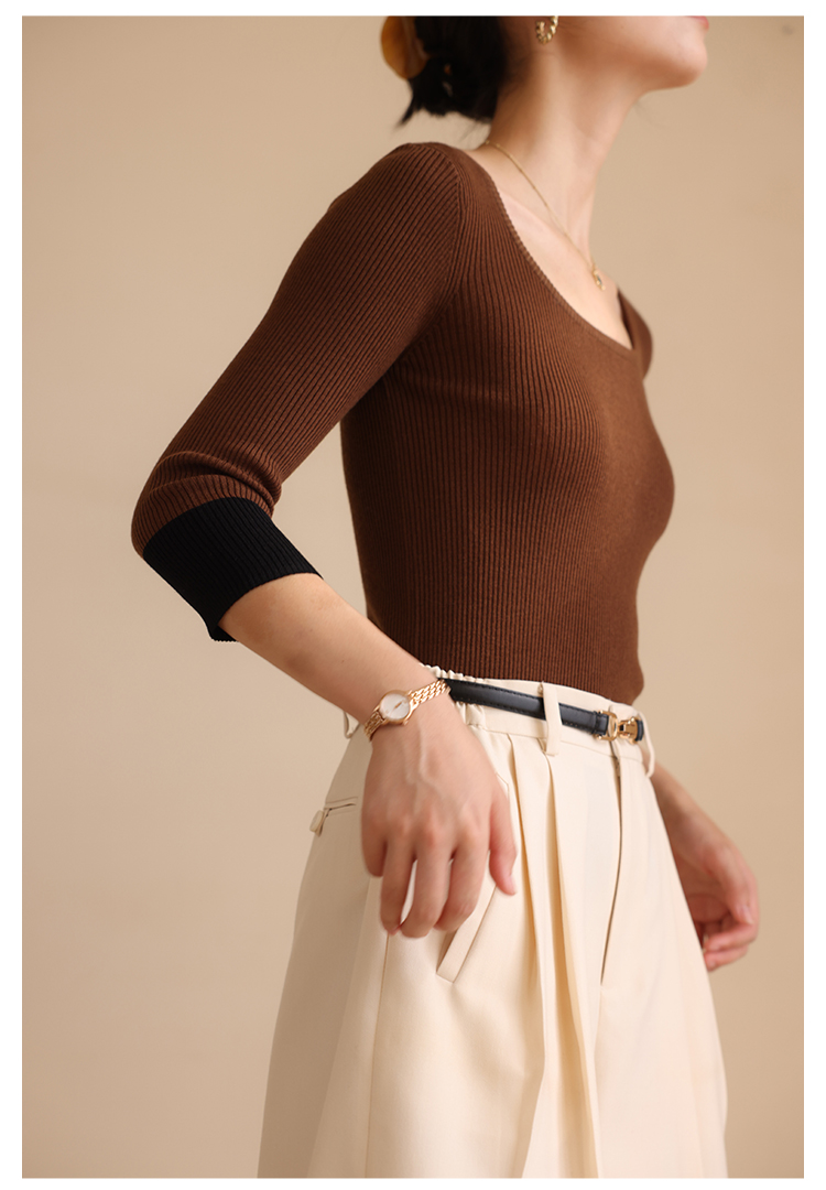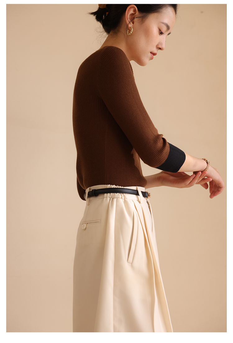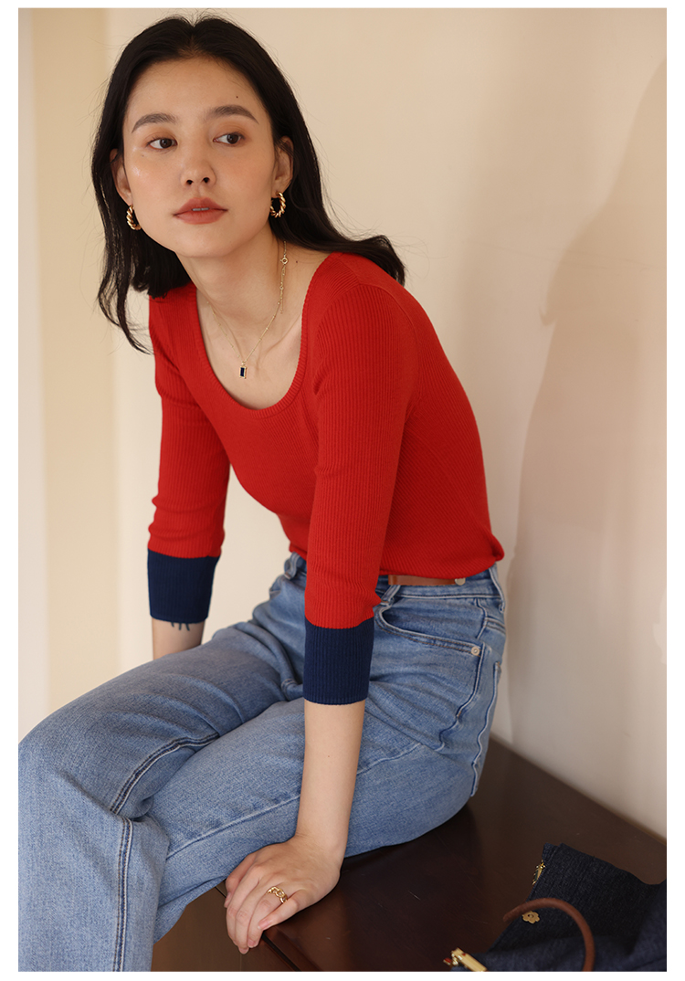 HeyDress法式圆领针织衫女秋季撞色九分袖设计打底衫修身别致上衣