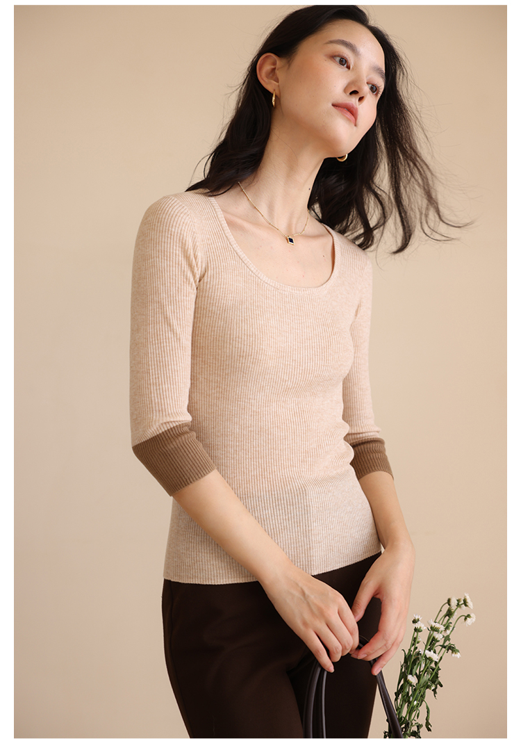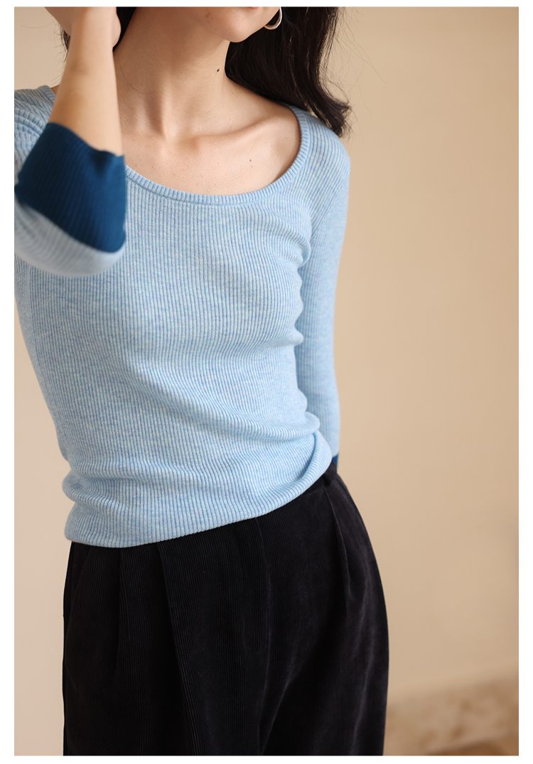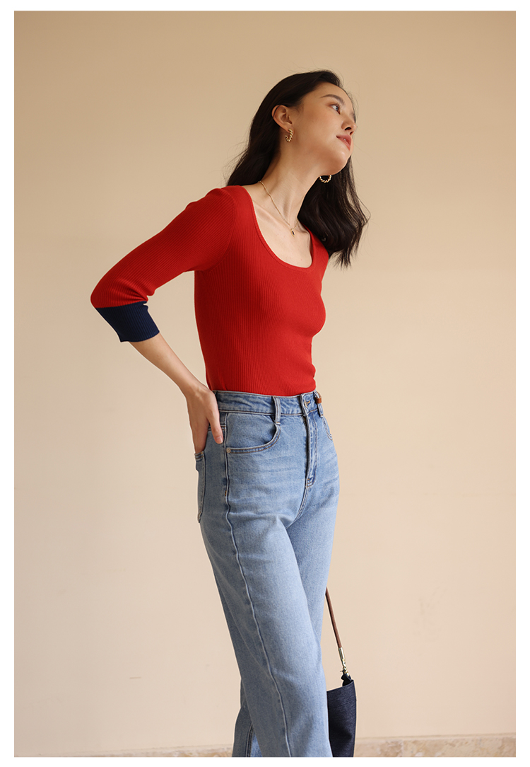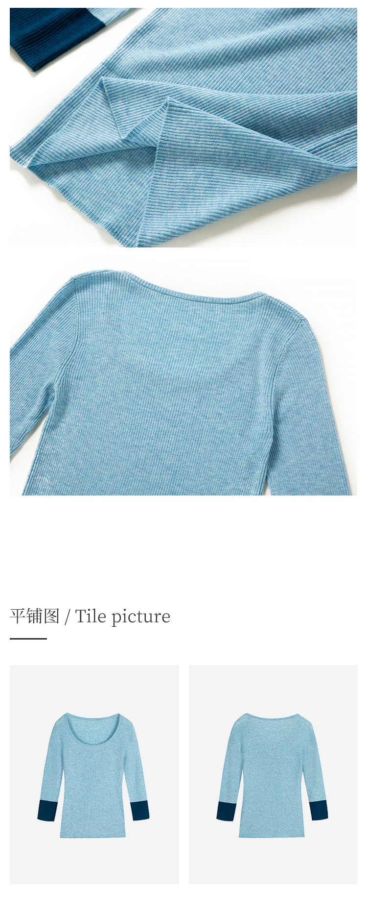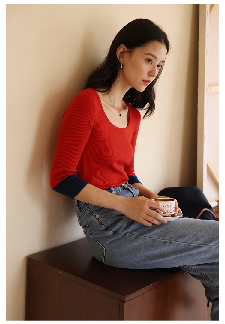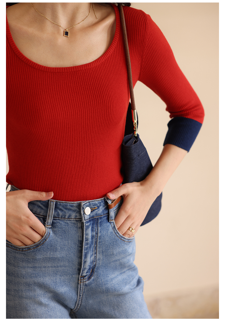 HeyDress法式圆领针织衫女秋季撞色九分袖设计打底衫修身别致上衣