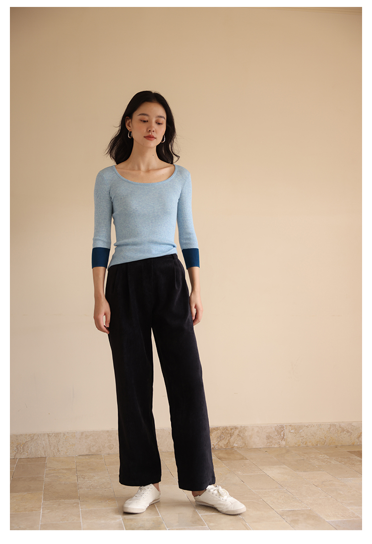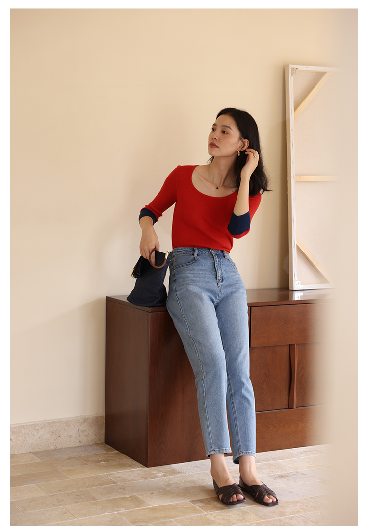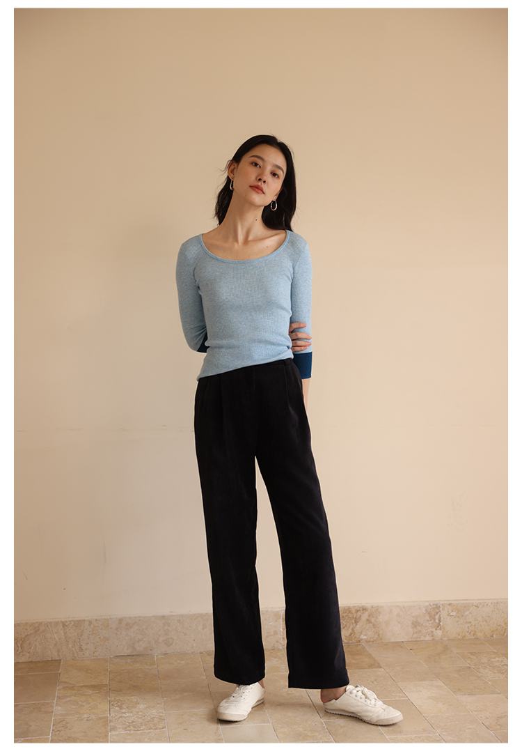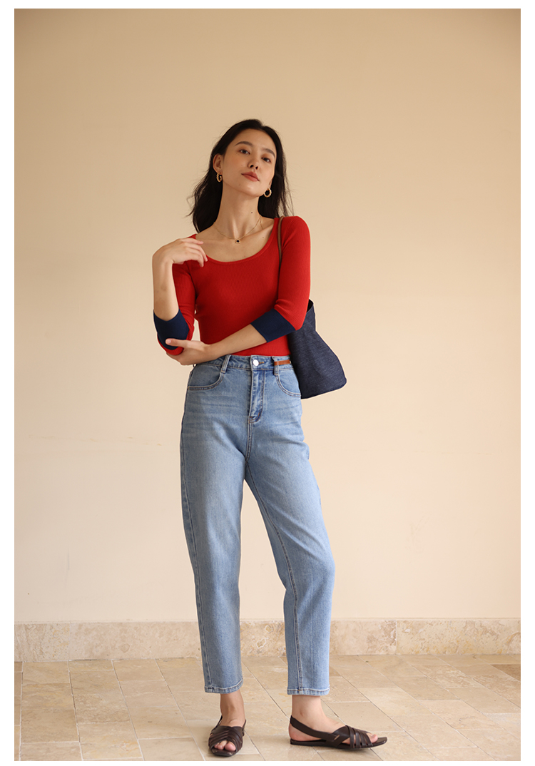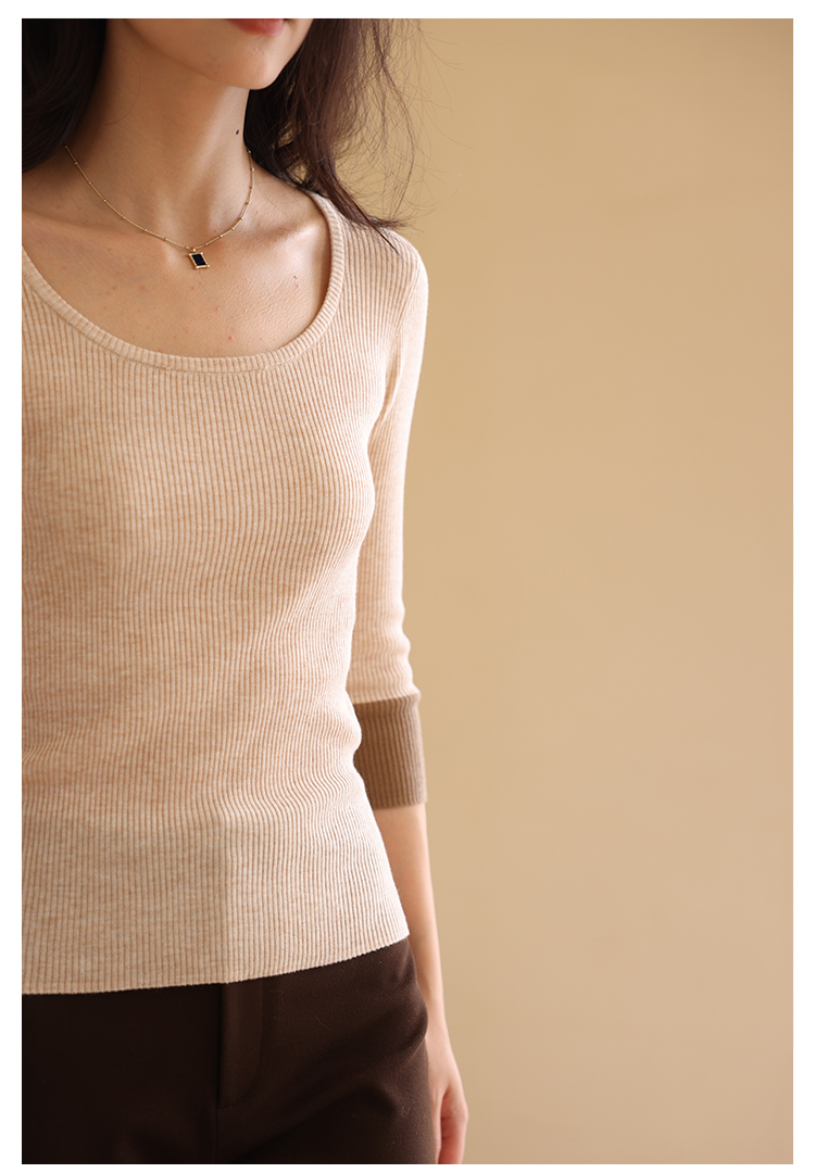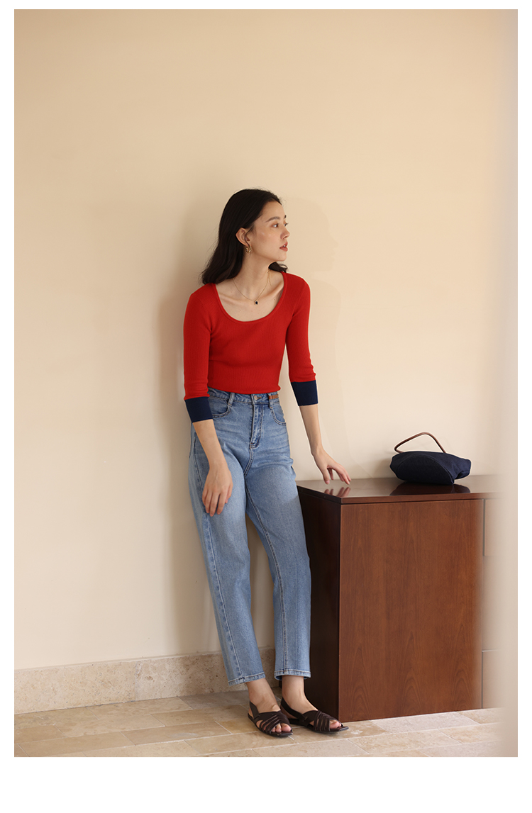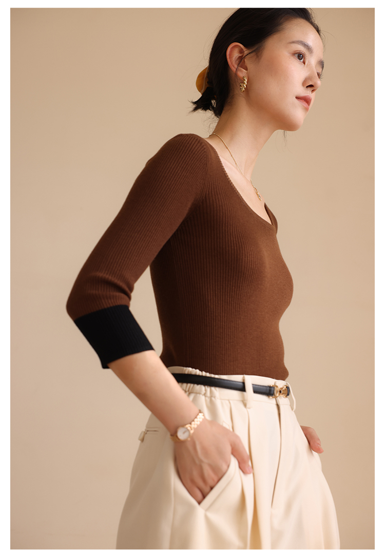 HeyDress法式圆领针织衫女秋季撞色九分袖设计打底衫修身别致上衣