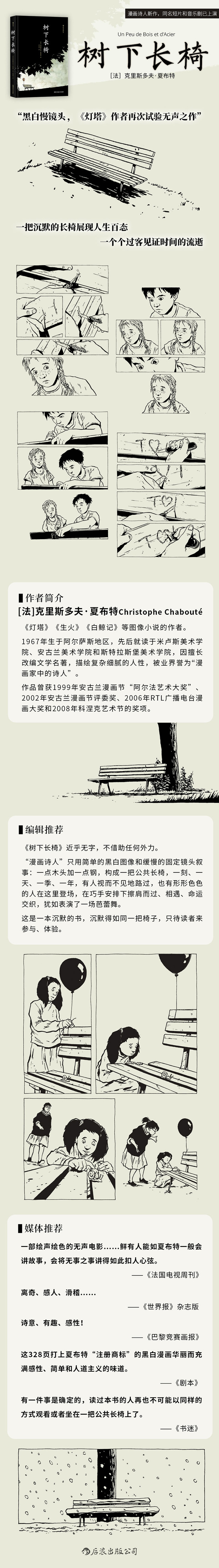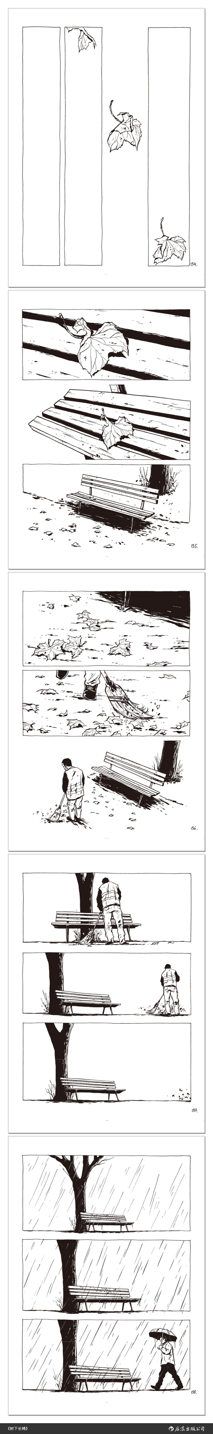 这部三百多页的图像小说讲的是一把长椅的故事。一点木头加一点钢,一棵树下的一把公共长椅,形形色色的人在这里相遇、分离、成长、转变,他们有的定期来这里小憩,有的一去不复返,有的一直在等待……