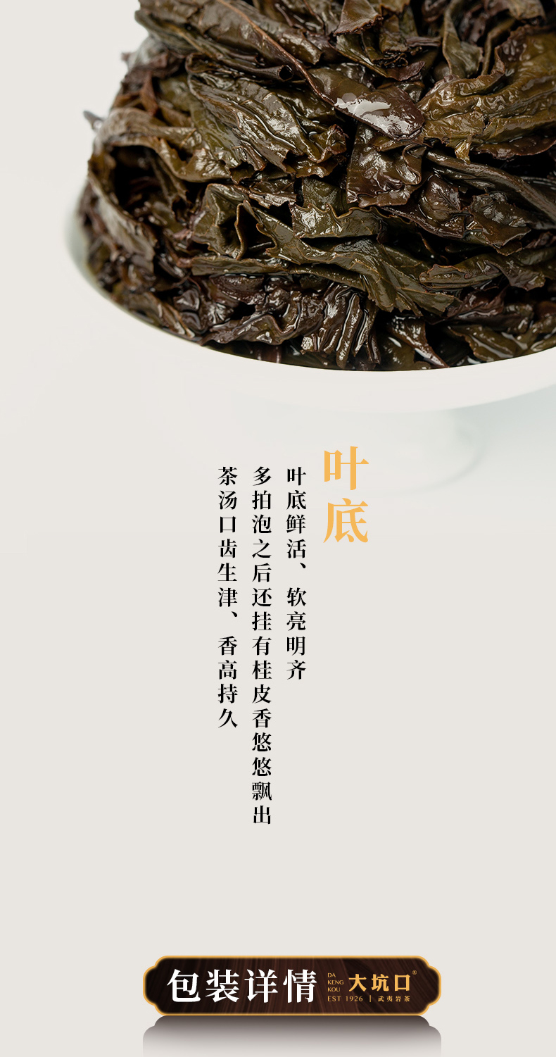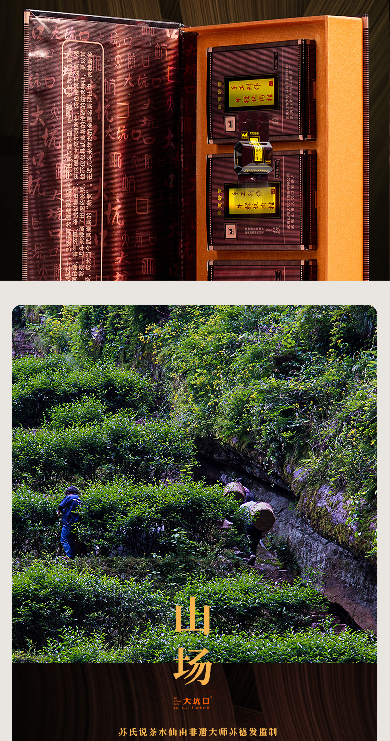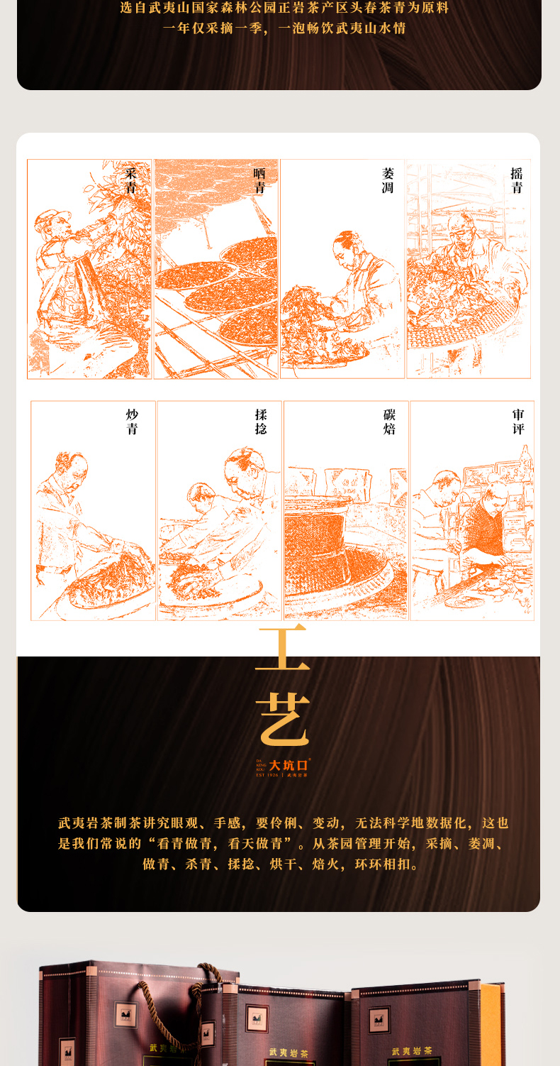 - 大坑口岩茶有限公司,位于武夷山市-天心村,茶山分布于正岩产区的“三坑、两涧”,由首批非物质文化遗产武夷岩茶制作技艺传承人:苏炳溪和第二批传承人:苏德发先生的精心手工制作,造就了大坑口岩茶的独特品质