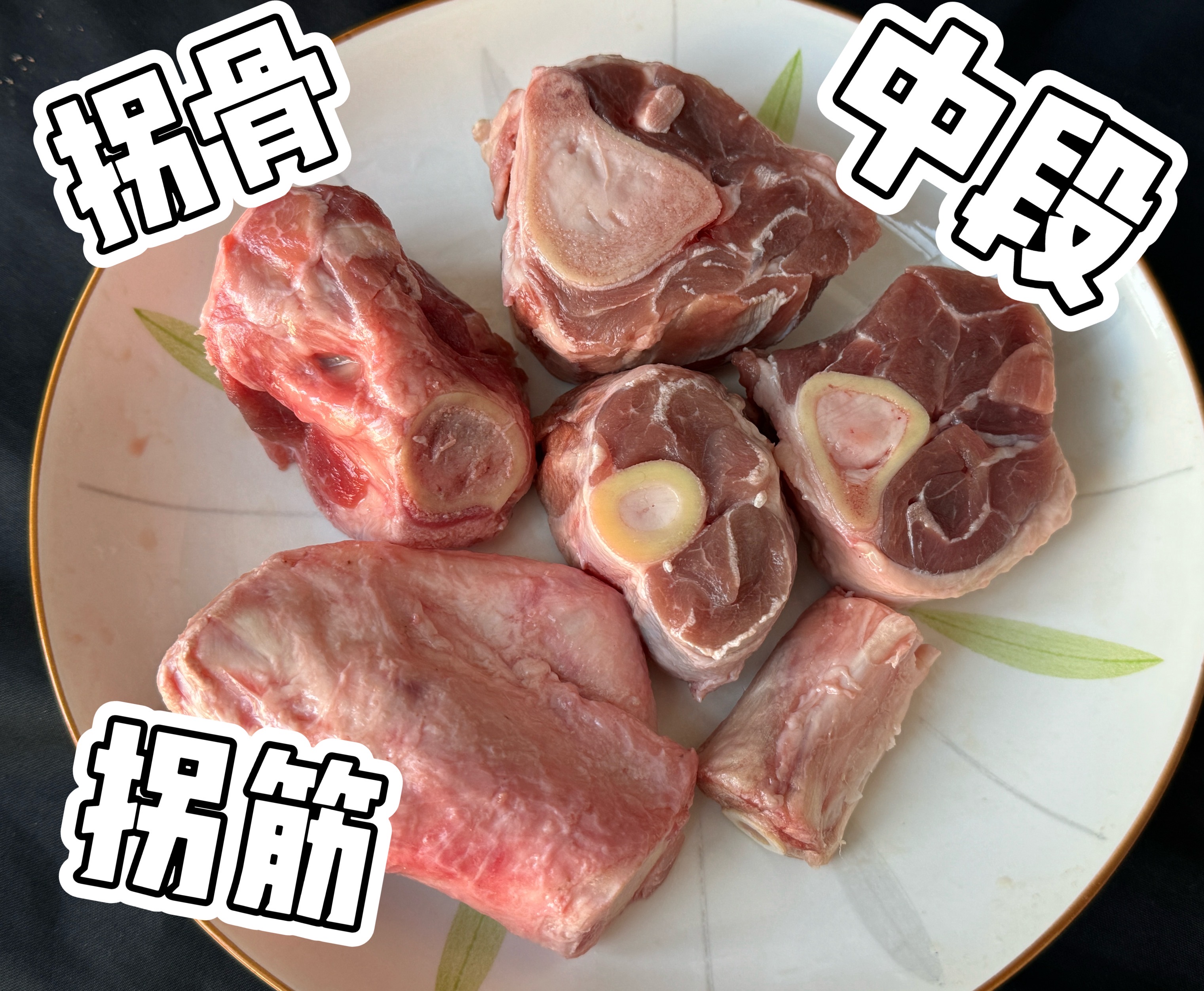 羊小腿切割后:有拐骨,中段,拐筋,装袋时我们尽量均匀装,实际发货时切割会比上图断节一些。
