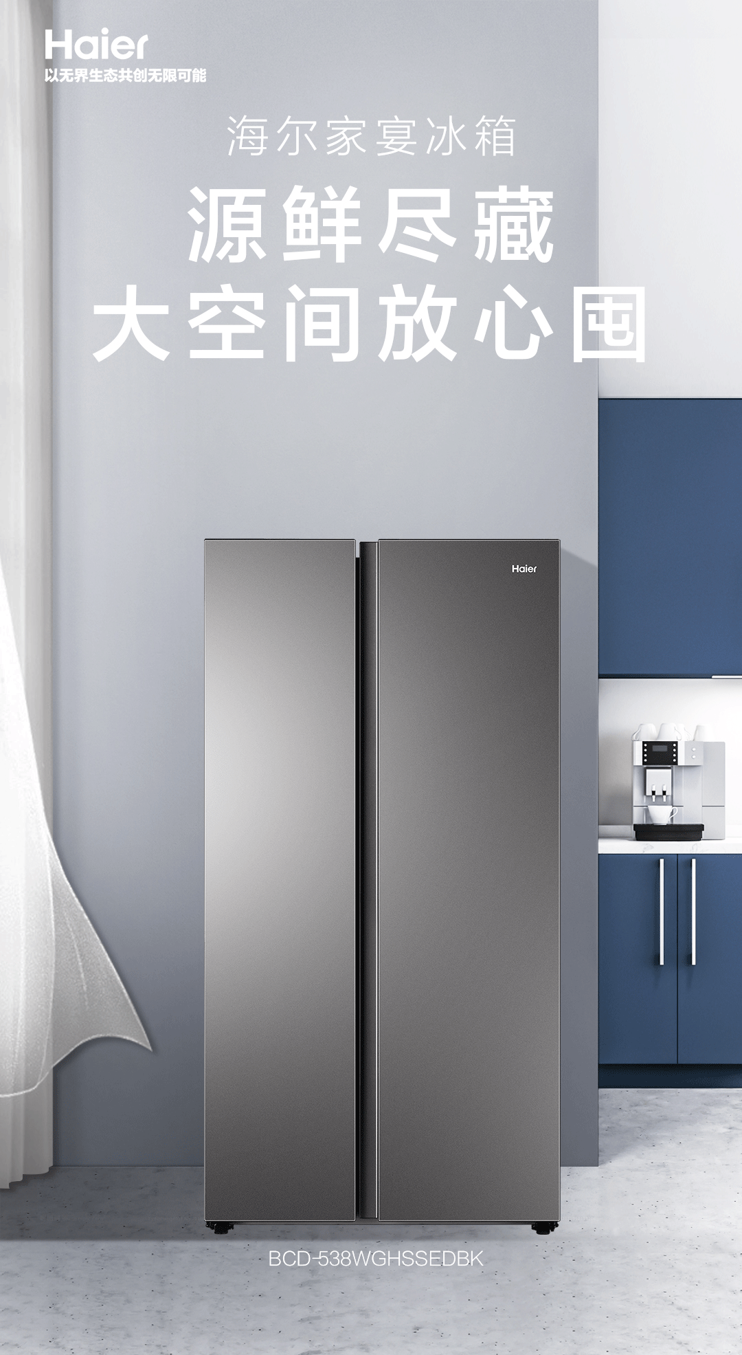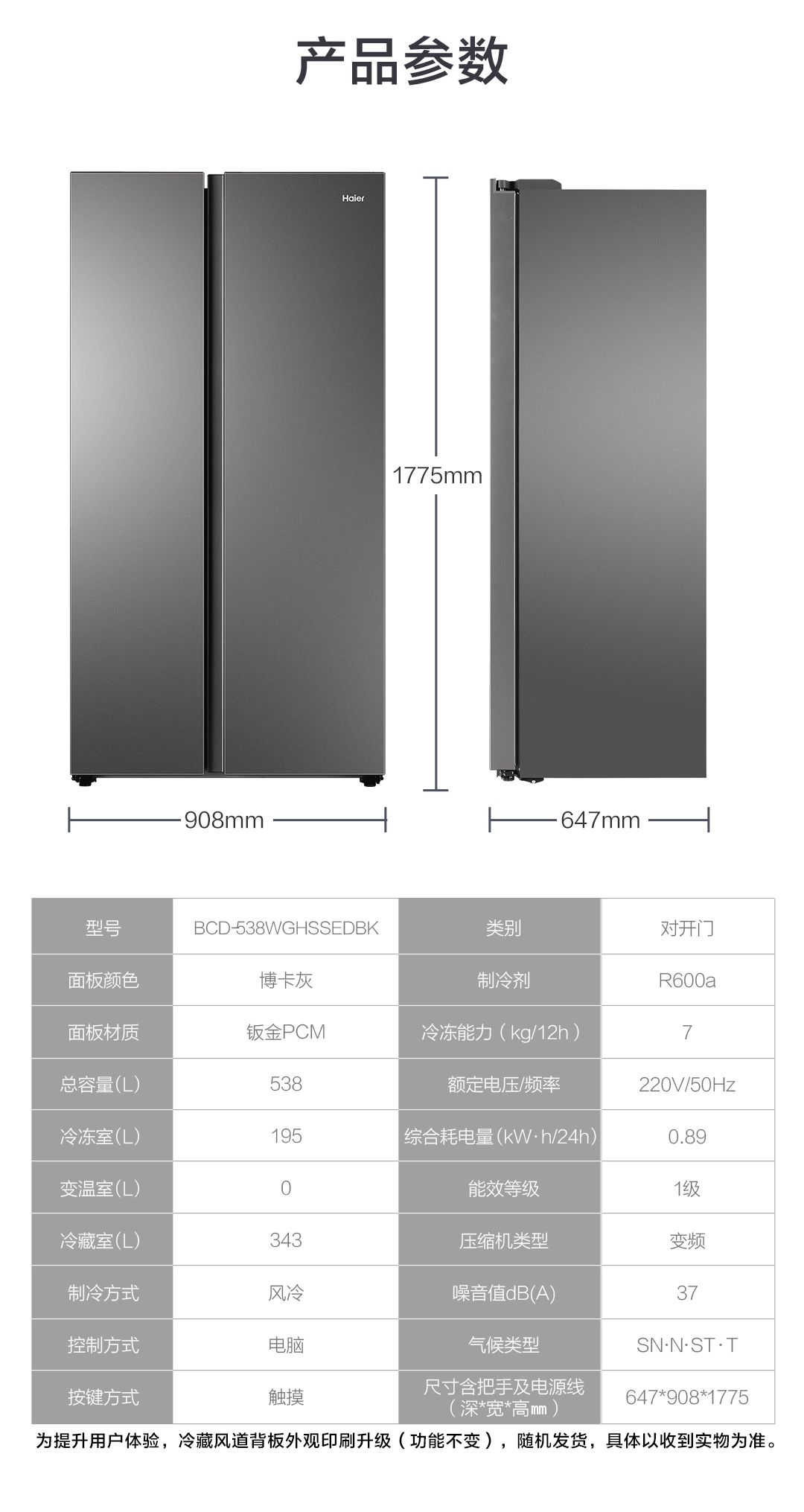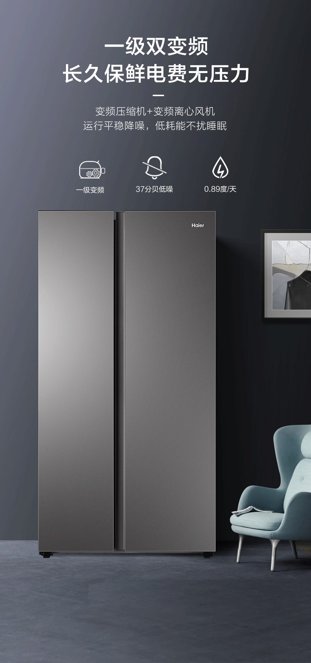 海尔(Haier)538大容量风冷无霜一级双变频黑金净化抗菌超薄整机冰箱BCD-538WGHSSEDBK