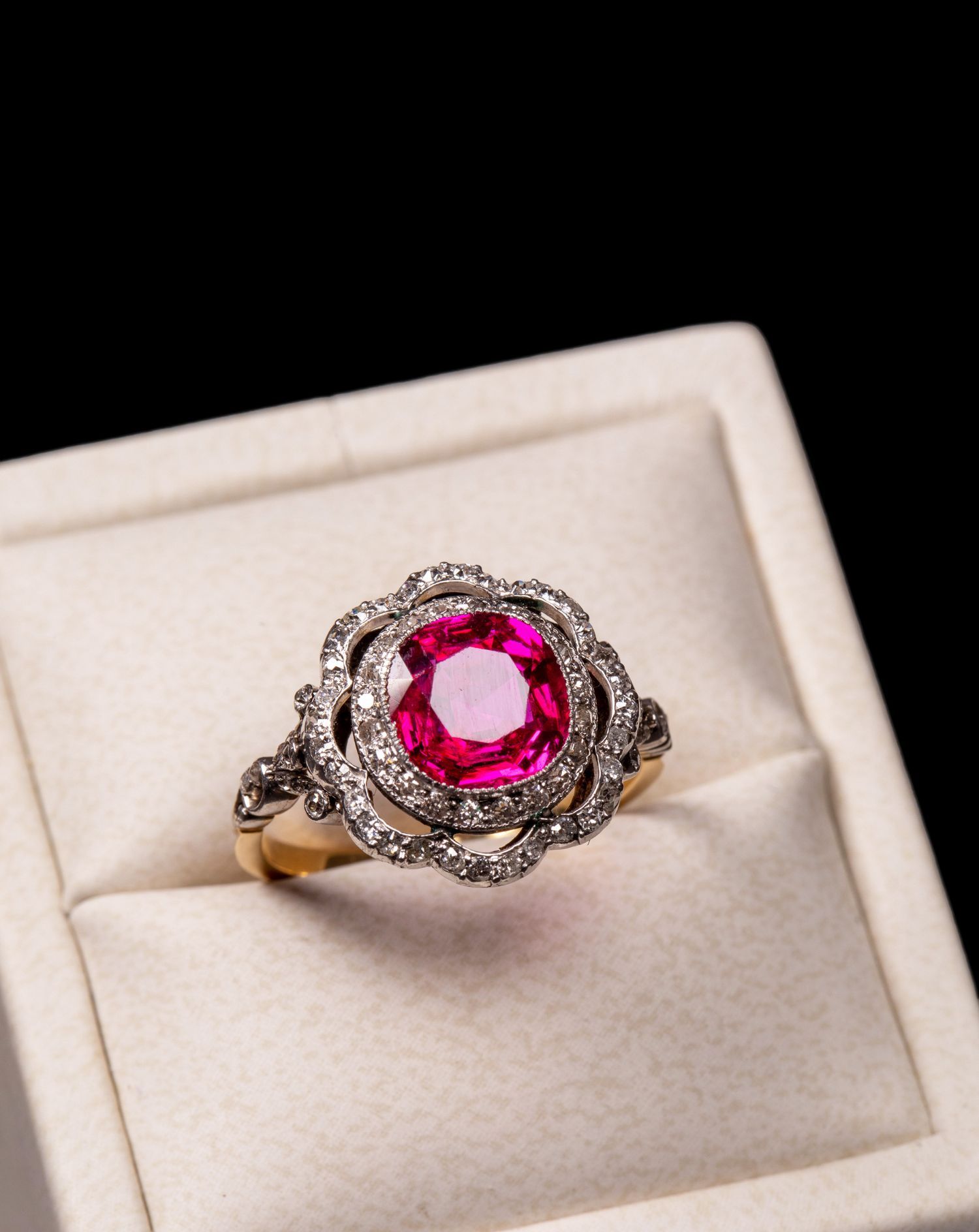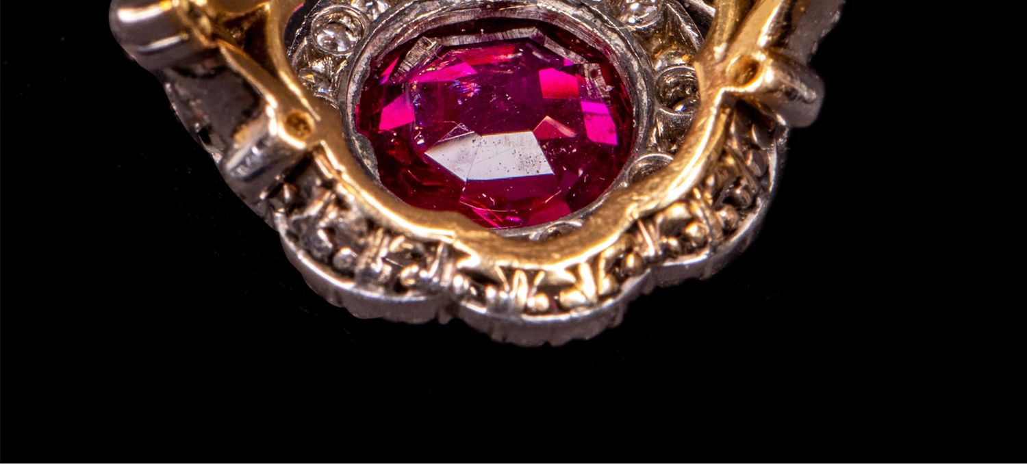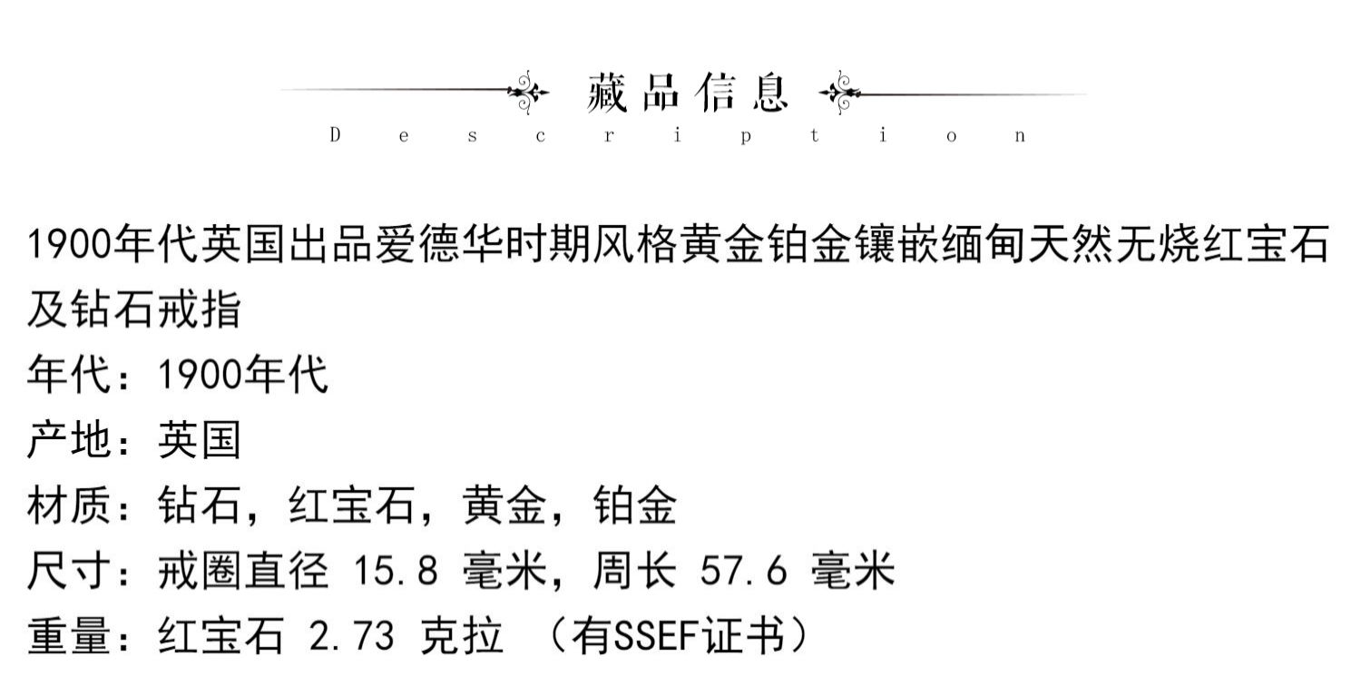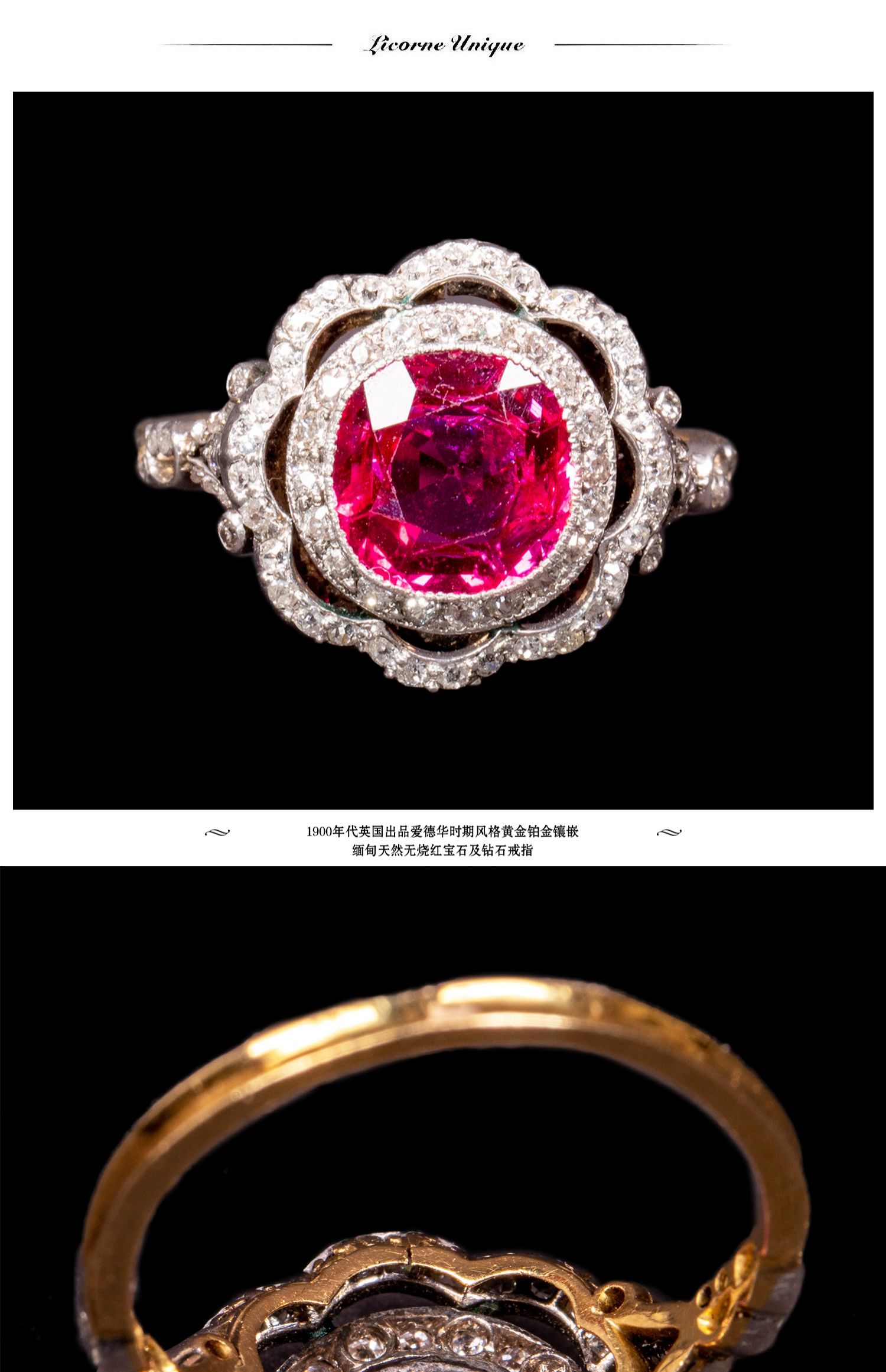 独角鹿西洋古董首饰女戒爱德华黄金铂金镶嵌缅甸红宝石钻石戒指