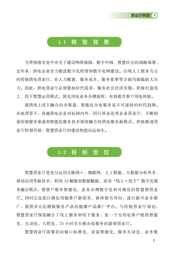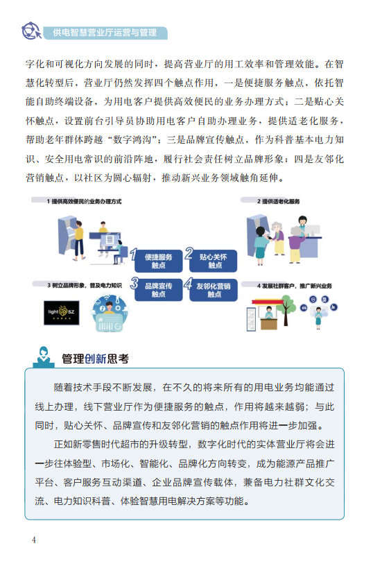 本书以 S市供电公司智慧营业厅为例,对其智慧化转型升级的运营、管理经验进行了总结,同时也对供电智慧营业厅的未来运营服务管理模式做出思考。