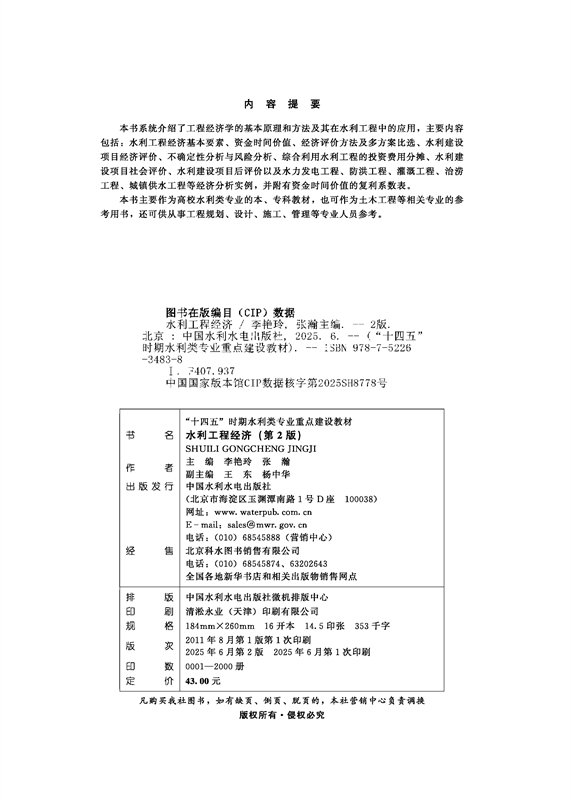 本书系统介绍了工程经济学的基本原理和方法及其在水利工程中的应用,主要内容包括:水利工程经济基本要素、资金时间价值、经济评价方法及多方案比选、水利建设项目经济评价、不确定性分析和风险分析、综合利用水利工程的投资费用分摊、水利建设项目社会评价、水利建设项目后评价、经济效益后评价以及水力发电工程、防洪工程、灌溉工程、治涝工程、城镇供水工程等经济评价实例,并附有资金时间价值的复利系数表。本书主要作为高校水利水电类专业的本、专科教材,也可作为土木工程等相关专业的参考用书,还可供从事工程规划、设计、施工、管理等专业人员参考。