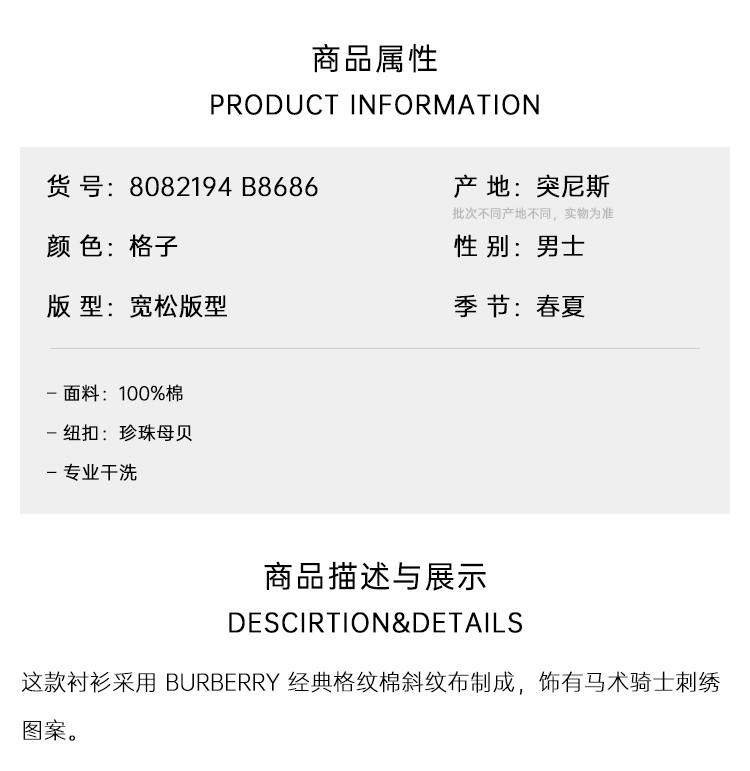 BURBERRY 巴宝莉 男士马术骑士刺绣徽标格纹棉质长袖衬衫 格子 8082194 B8686