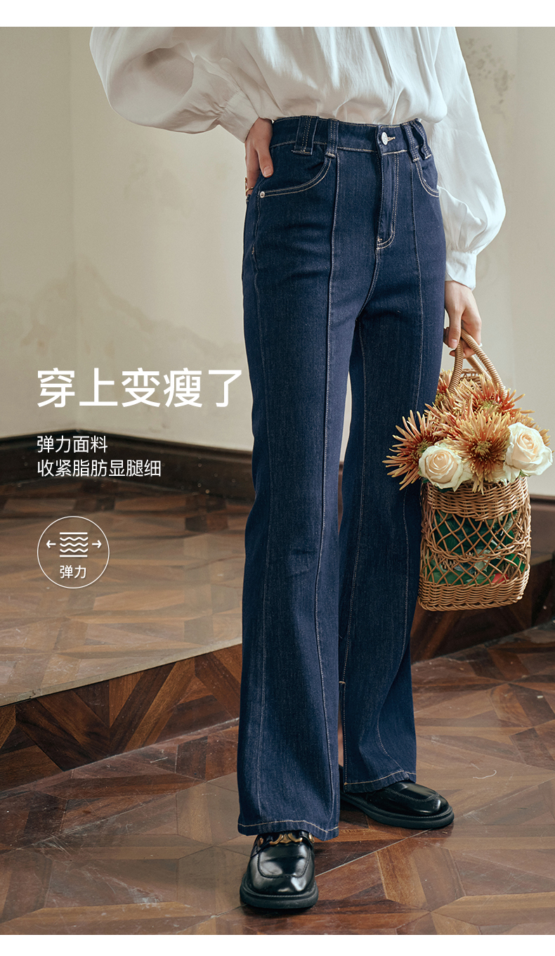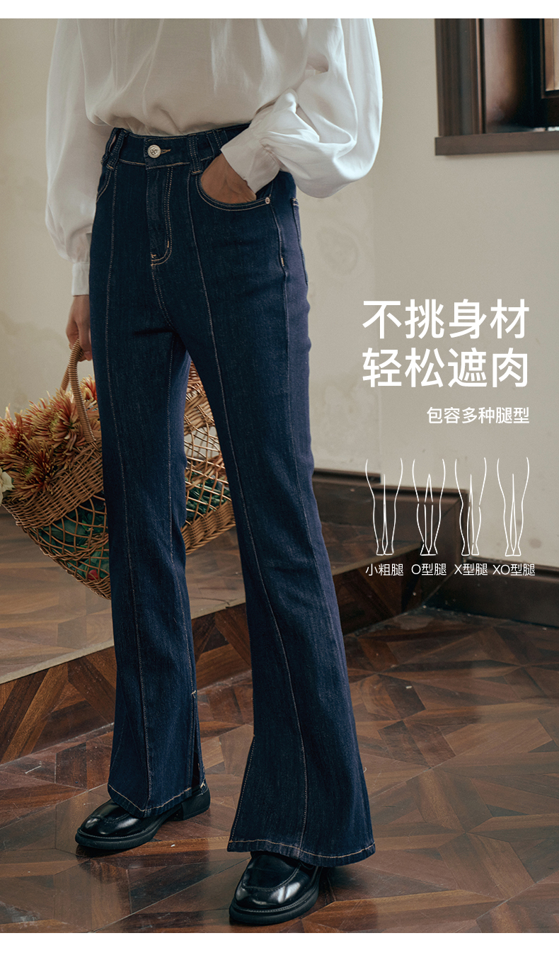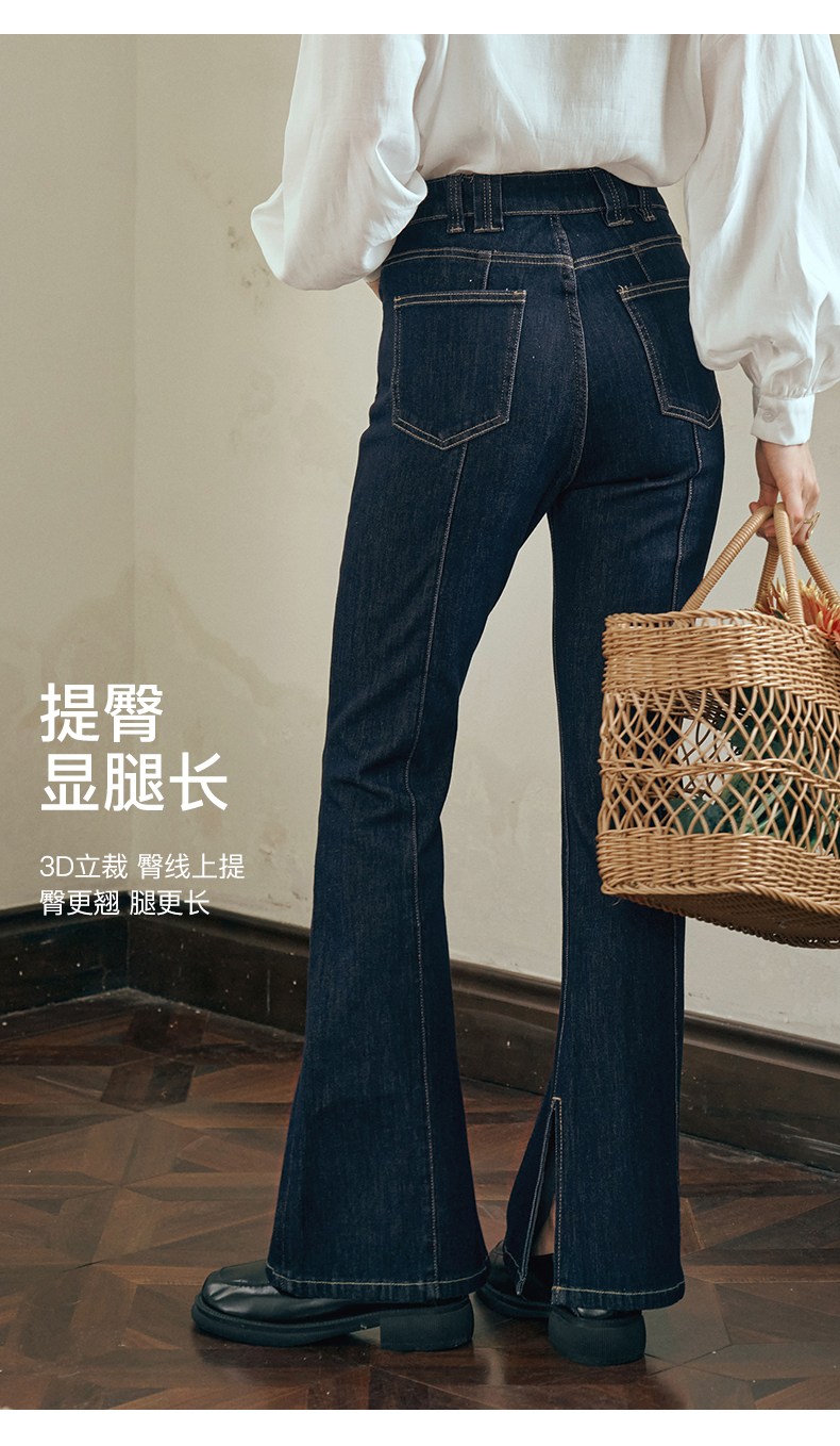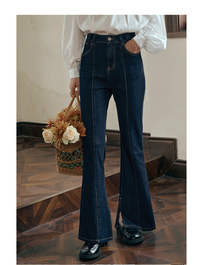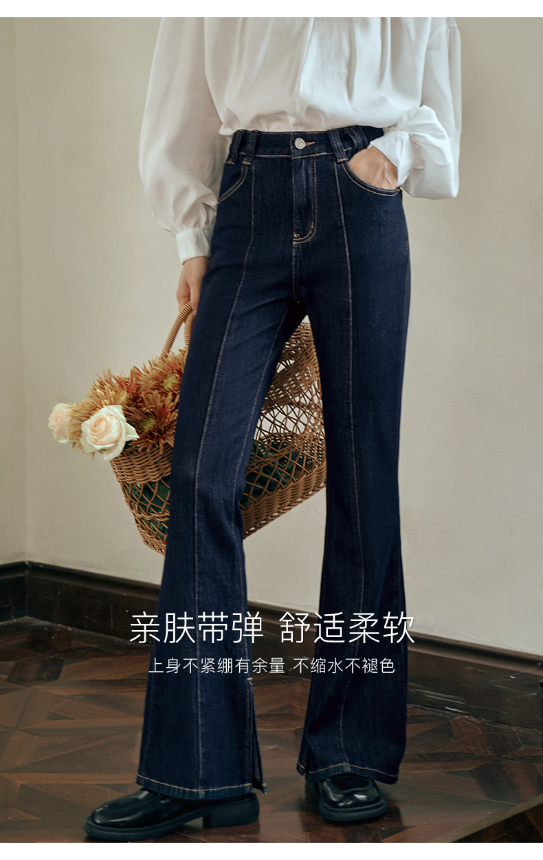 OLrain欧芮儿深色牛仔裤女初秋2023新款高腰复古弹力开叉喇叭长裤