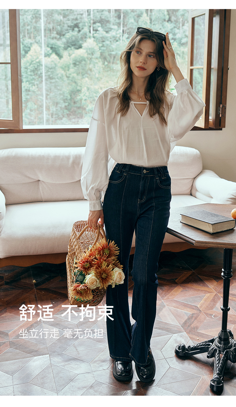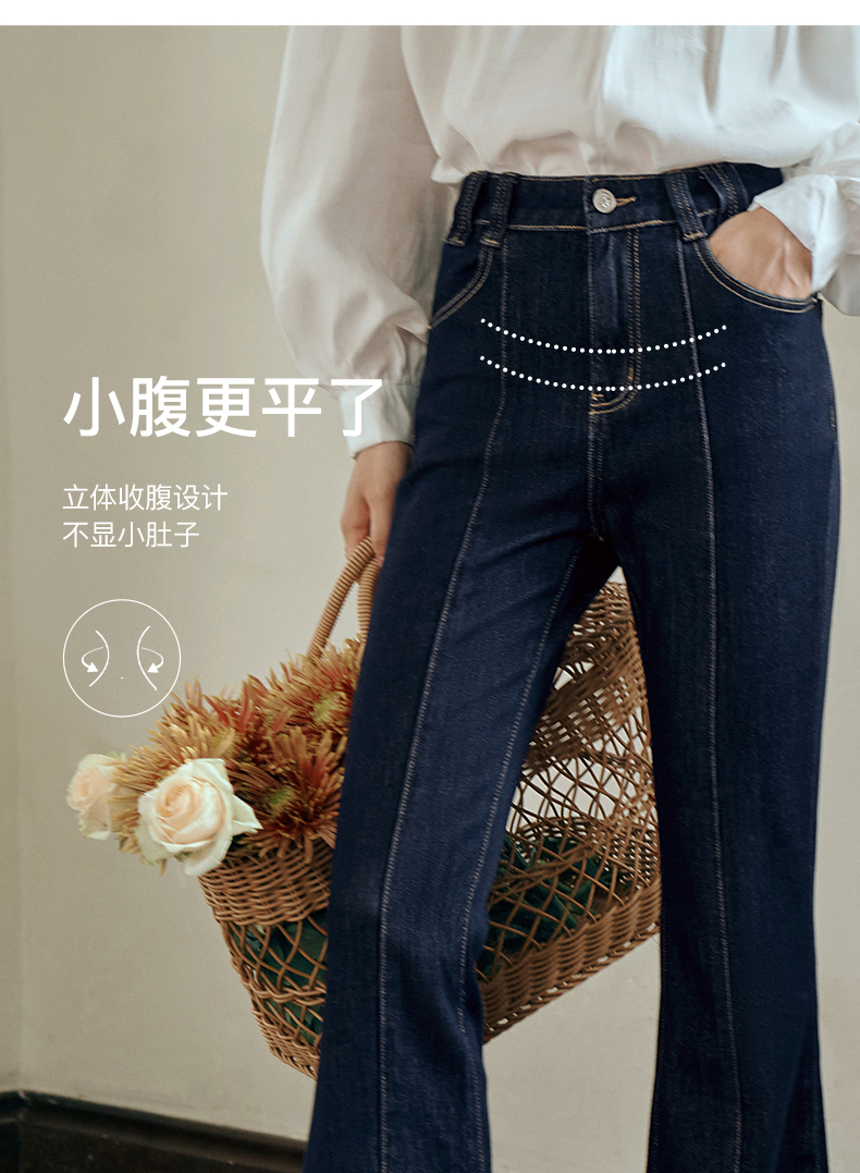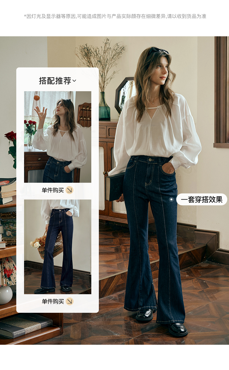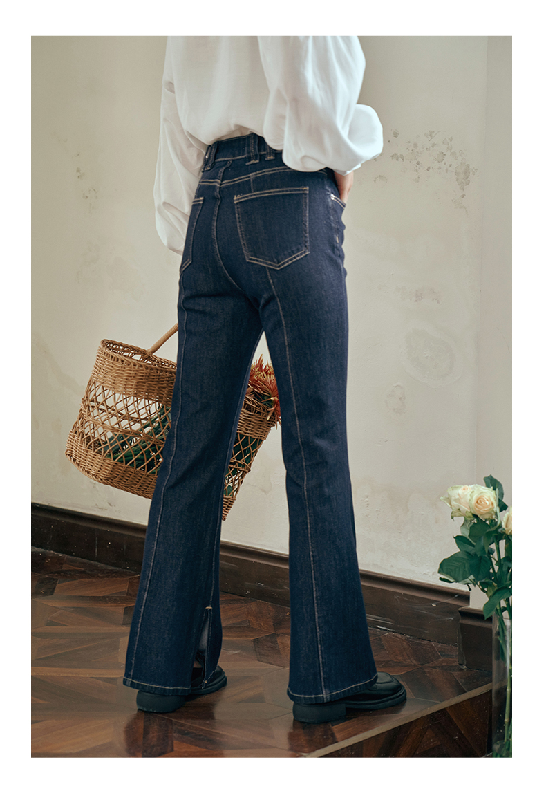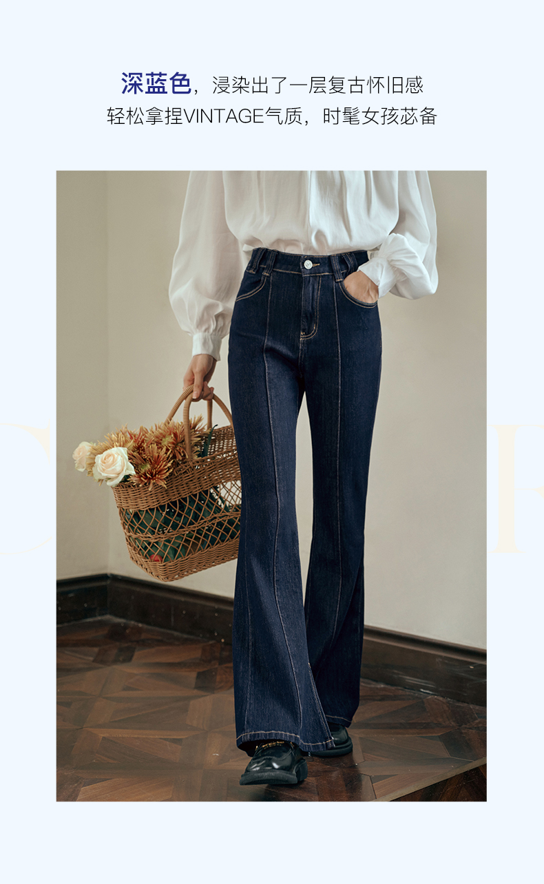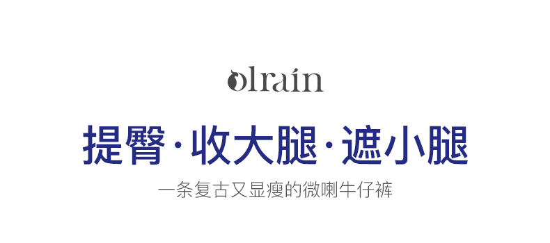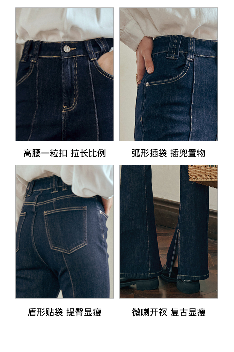 OLrain欧芮儿深色牛仔裤女初秋2023新款高腰复古弹力开叉喇叭长裤