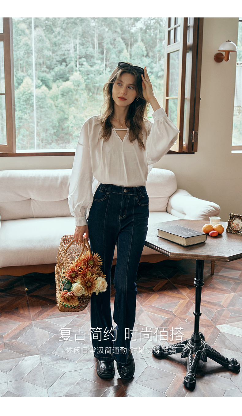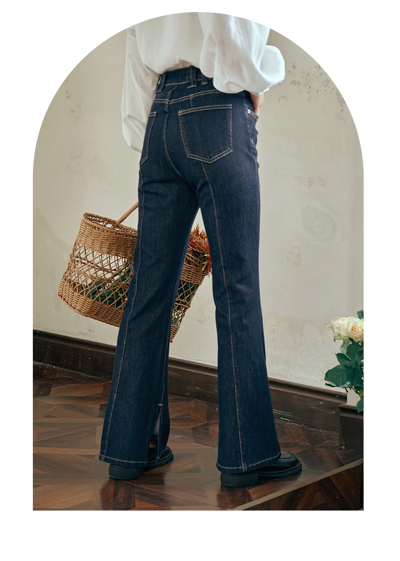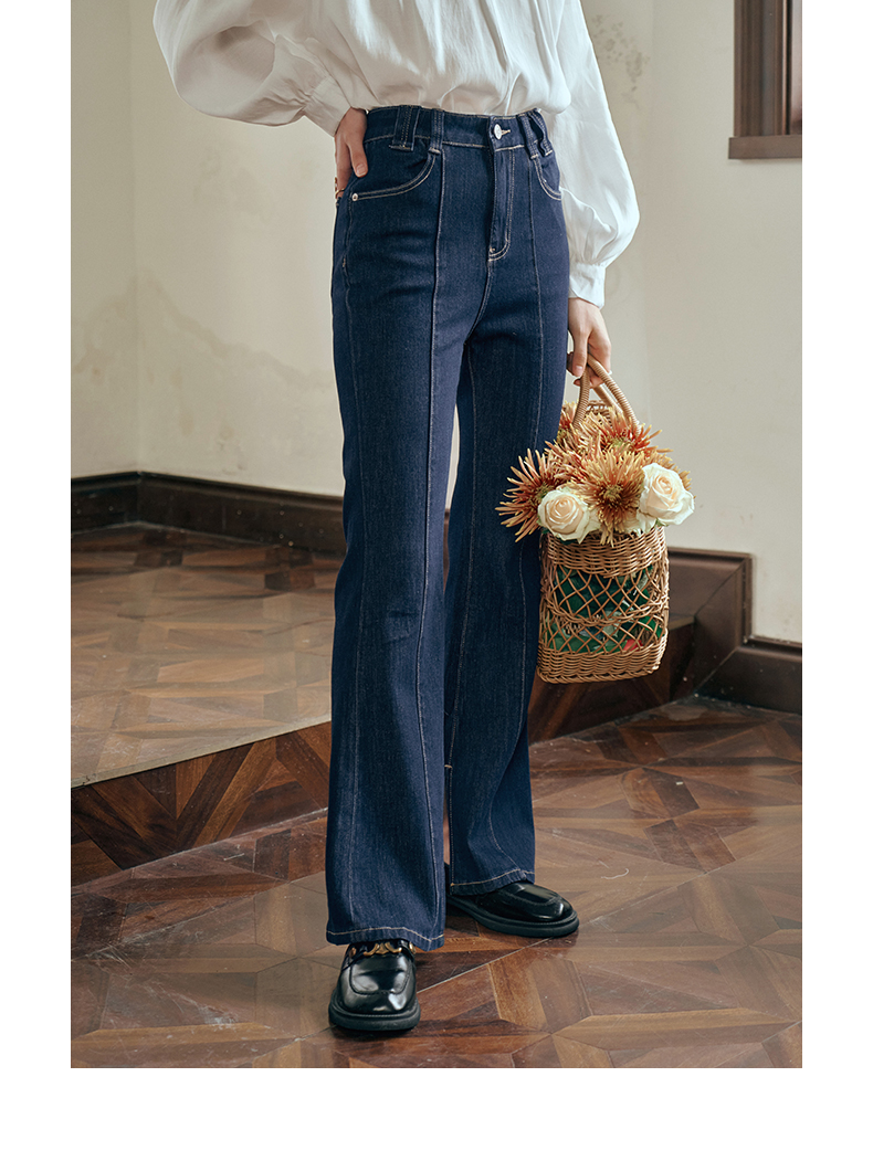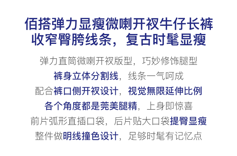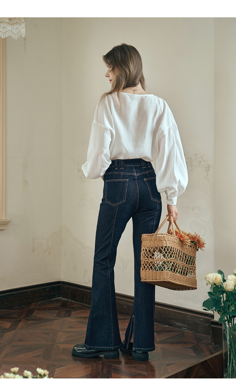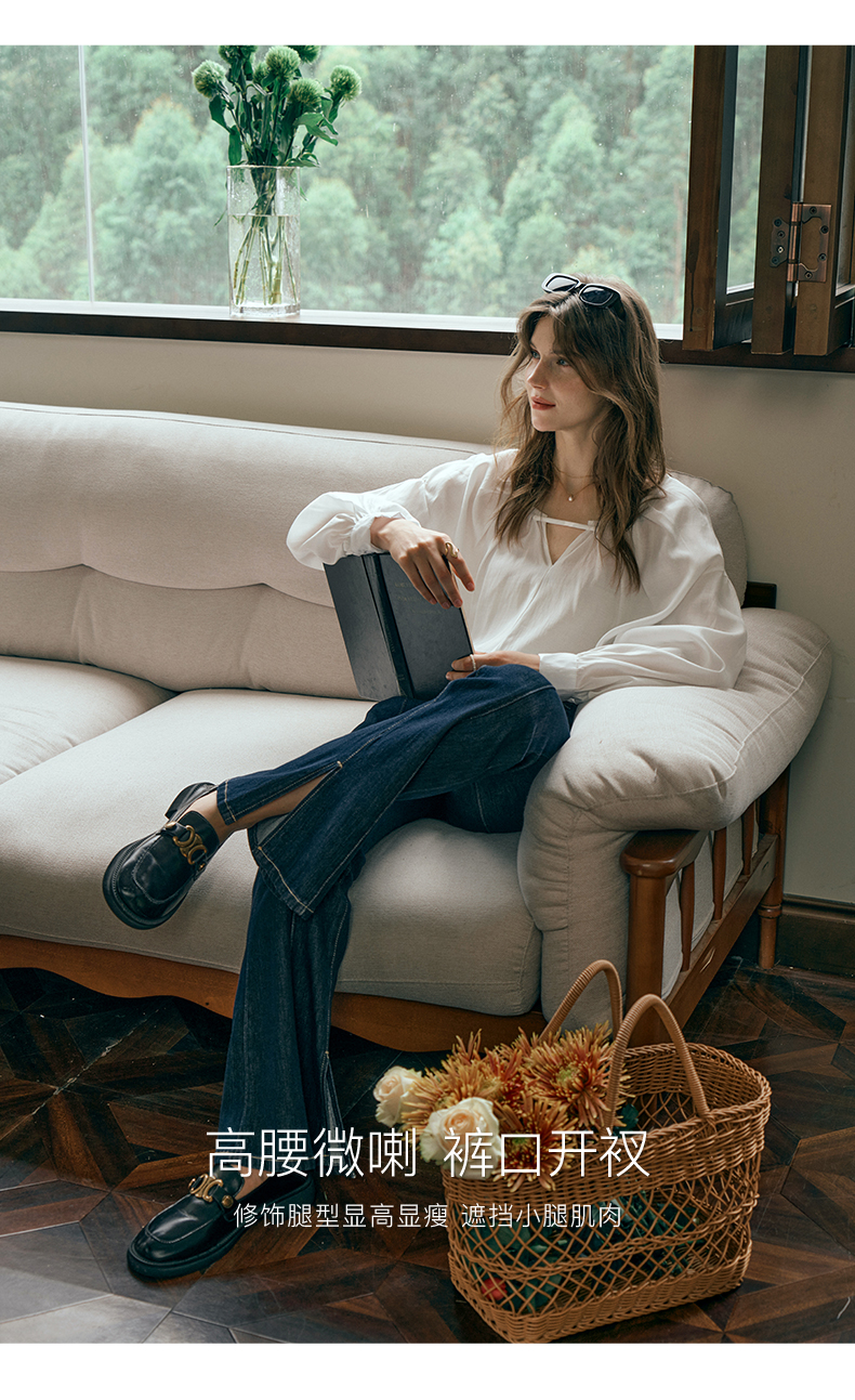 OLrain欧芮儿深色牛仔裤女初秋2023新款高腰复古弹力开叉喇叭长裤