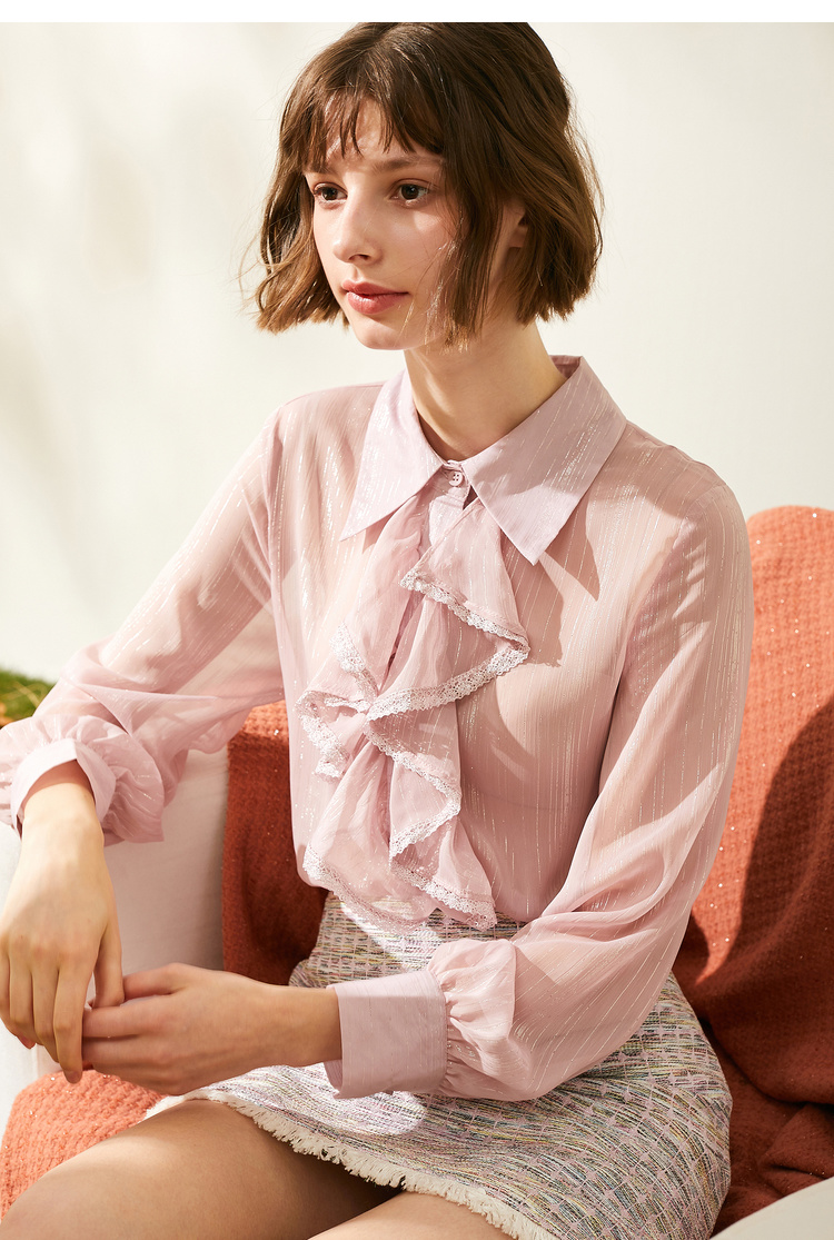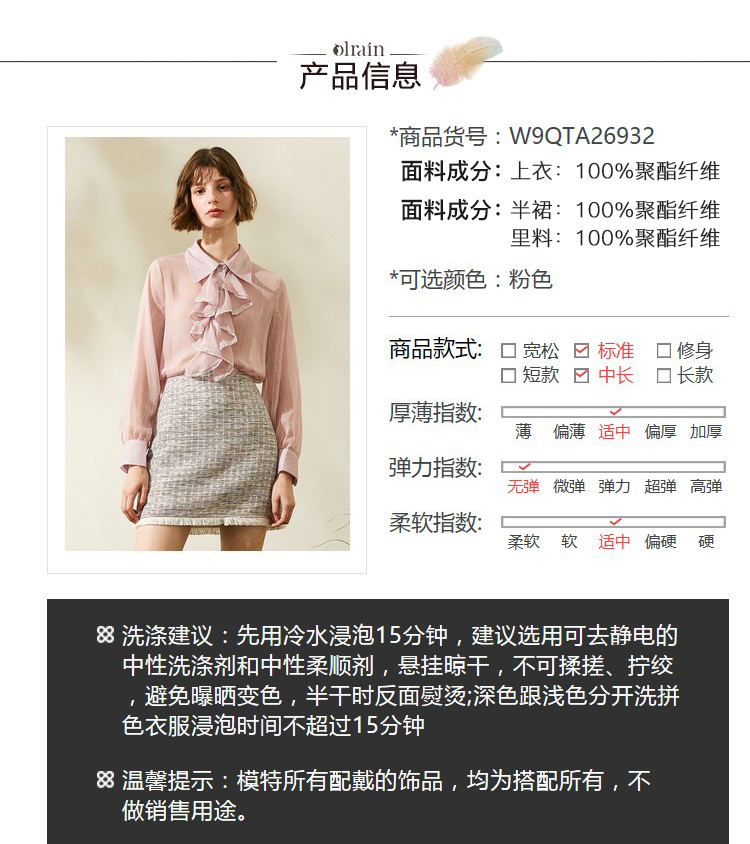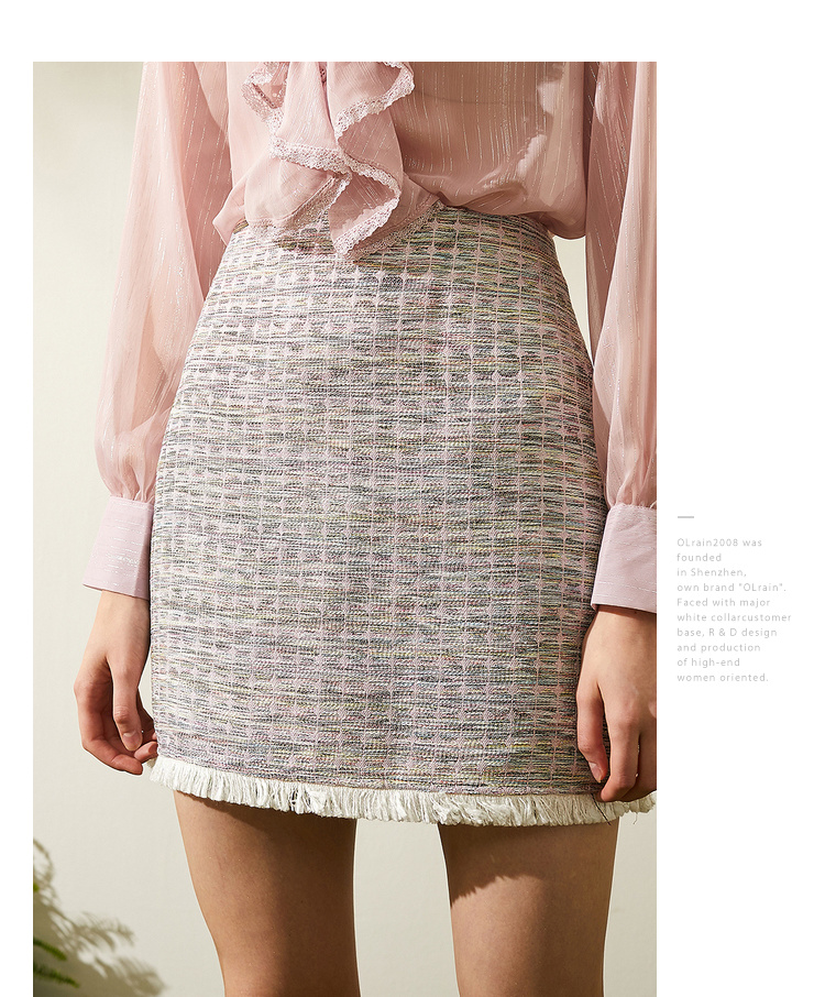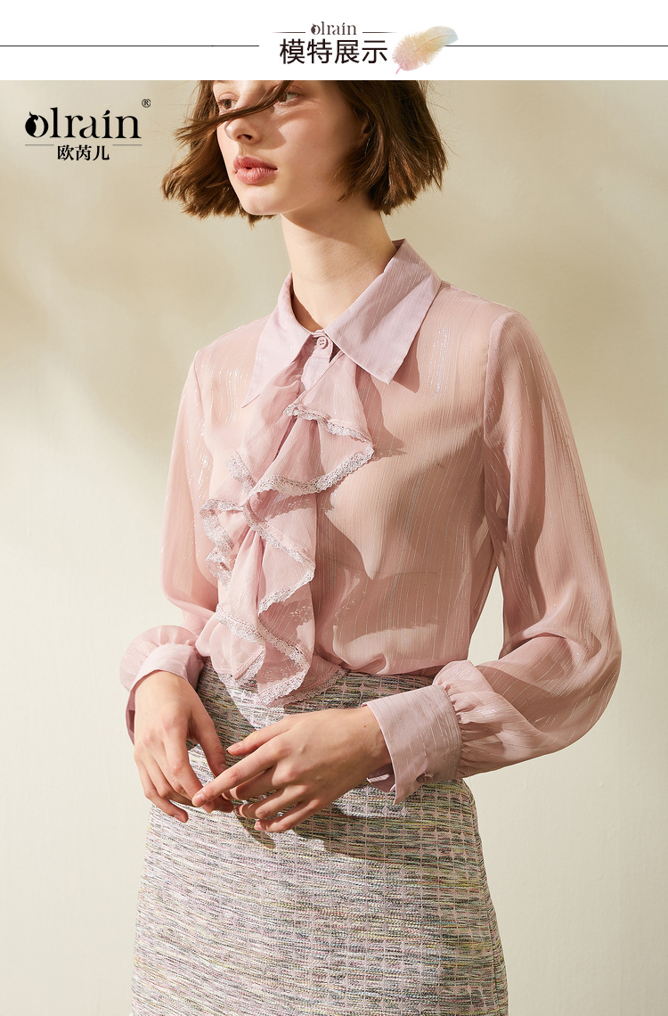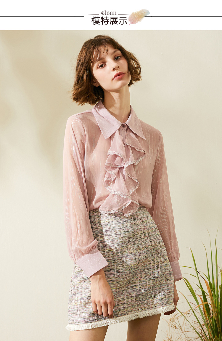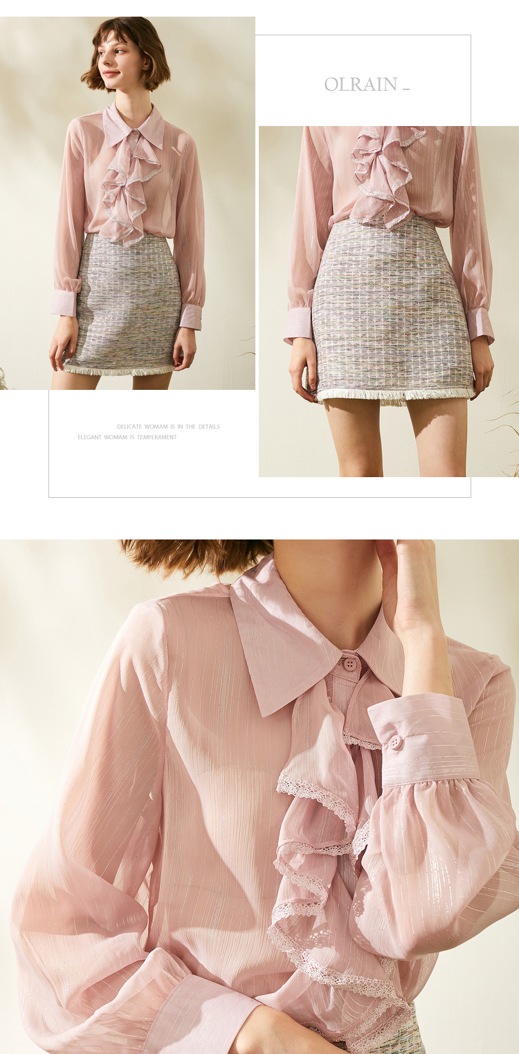欧芮儿2019秋装新品两件套长袖粉色衬衫+小香风半身裙时尚套装