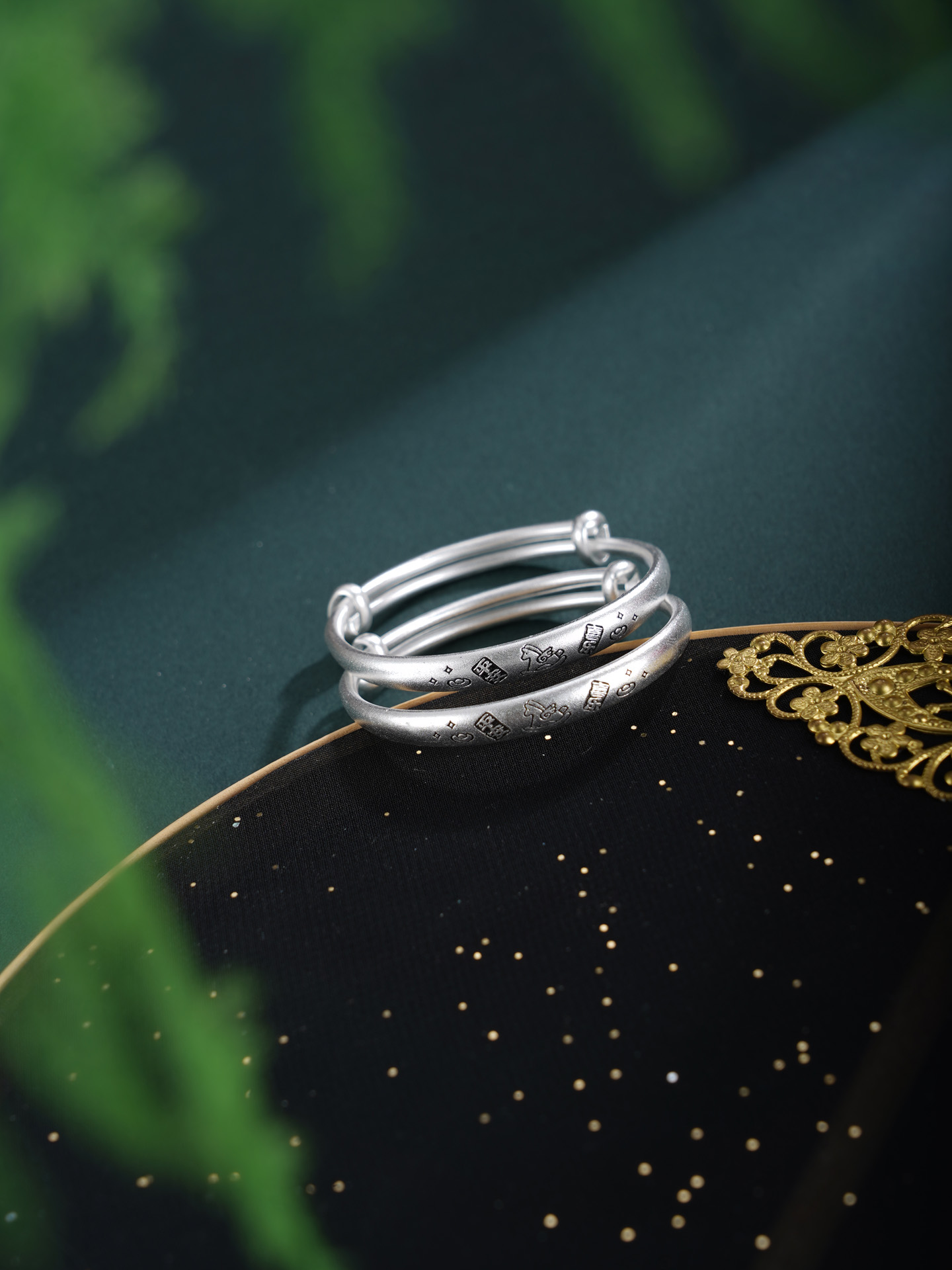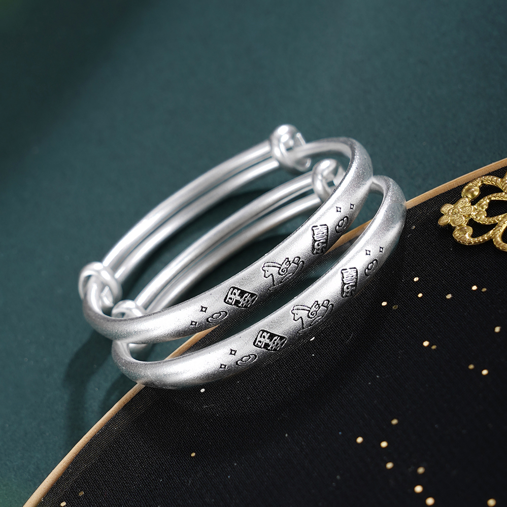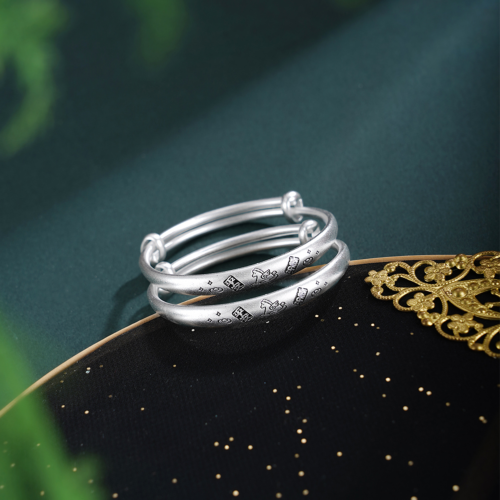 【寓意】:以纯银手镯为载体,将跃动小木马錾刻于腕间,象征活力与奔腾的福运。平安喜乐四字相伴左右,寓意福随马跃,心安喜乐。
