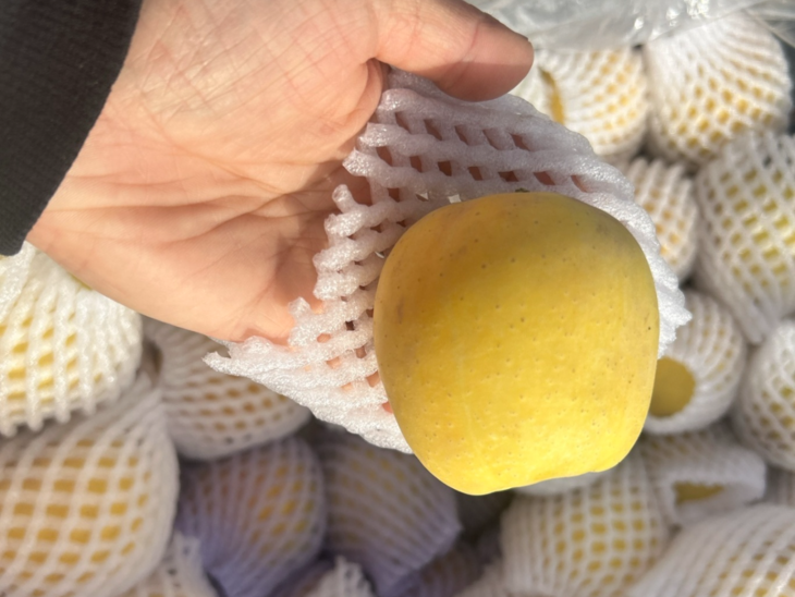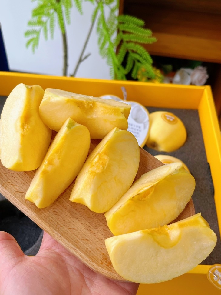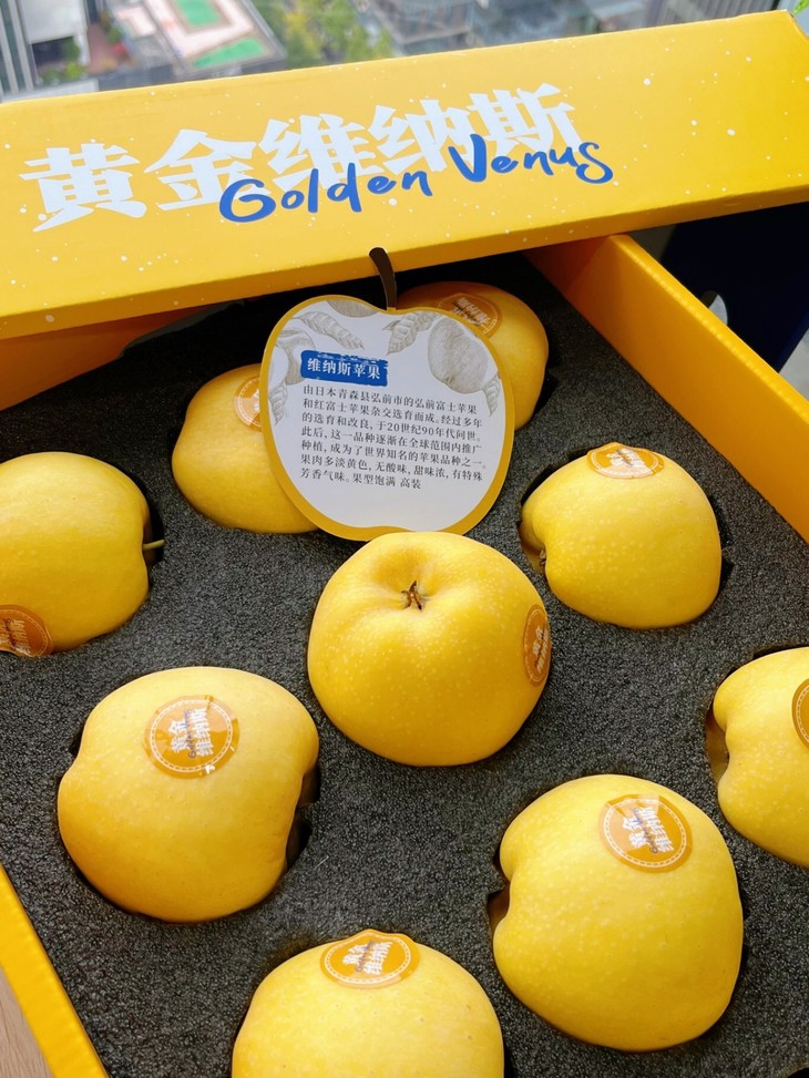 如果说红富士长相娇艳,青森王林长相“青涩”,那么黄金维纳斯的长相可以说是走“仙女路线”:通体金黄,果皮上还点缀着些许“小雀斑”。
