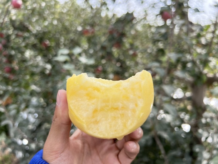 也正因为它太香太甜,在阿克苏这种极少闹虫害的地方,黄金维纳斯却必须“套袋”种植。“每年挂果后就要手工挨个套保护袋,采摘也是连着袋子摘下来,就怕被虫抢先尝了鲜。”牛艳青告诉记者,普通苹果靠近果核处会带点酸,但它几乎尝不到酸味,果核小、果肉厚,咬下去“咔嚓”一声,蜜甜爽脆,特别受年轻人追捧。