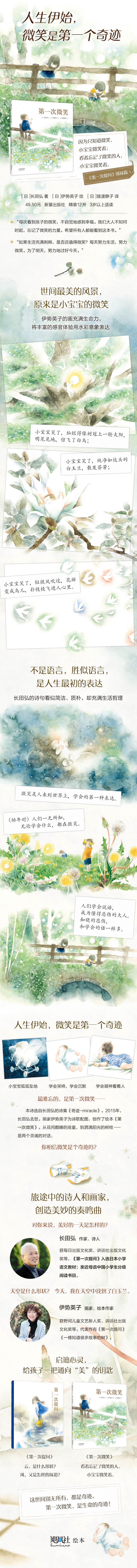 本书选自长田弘的诗集《奇迹-miracle》。2015年,诗人去世。画家伊势英子为完成与诗人生前的约定,创作了绘本《第一次微笑》。