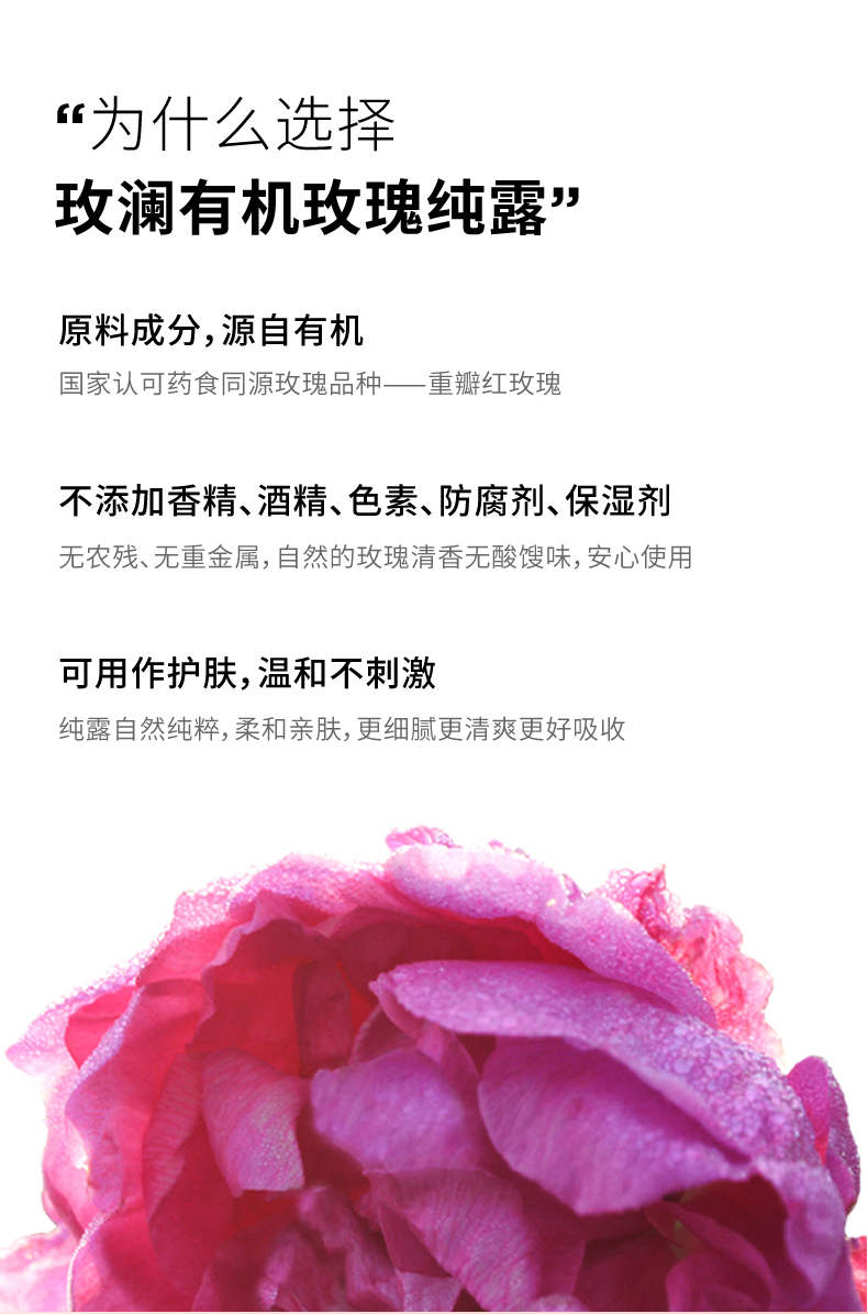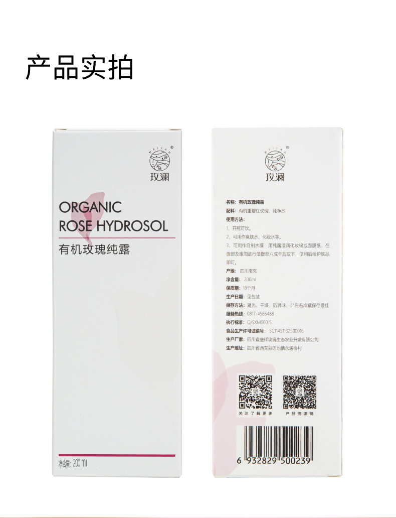 【产品品名】玫澜有机玫瑰纯露 【配料】有机重瓣玫瑰、纯净水 【产地】四川·西充 【规格】200毫升 【生产标准】有机认证,无添加 |