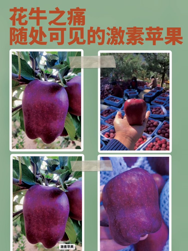 为什么要打激素?花牛苹果,又被称为中国蛇果。是因为花牛苹果的口感,与美国蛇果的口感极为相像,长相上而言,美国蛇果会更为细长,高桩。于是多年来,花牛苹果追着赶着模仿美国蛇果,进而鱼目混珠,以蛇果的身份出现在大众视野中,出现在各大商超中。怎样才能长的像蛇果呢:一种叫做拉长剂的激素应运而生,多年来,被应用到花牛苹果的种植中。