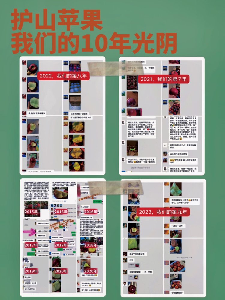 十年,从对标准一无所知,到建立自己的花牛苹果标准【建立护山苹果的标准化】十年,从随波逐流的生采生摘,到坚持树上熟采摘【建立护山苹果的采摘标准】十年,从一箱苹果裸体发货,到加厚双层网套➕定制泡沫托【建立护山情的打包标准】十年,从青到发涩不知稳定性为何物,到99%的香甜率【建立护山情的口感标准】十年,从不关注农药残留,到坚持0农残0除草剂0激素【建立护山情的健康标准】十年,从已经消失的国通快递,到顺丰快递的精进,【建立护山情的物流标准】十年,从无知者无畏,成长为受人之托忠人之事。
