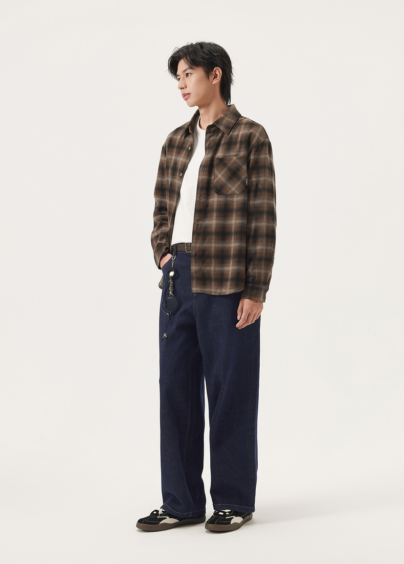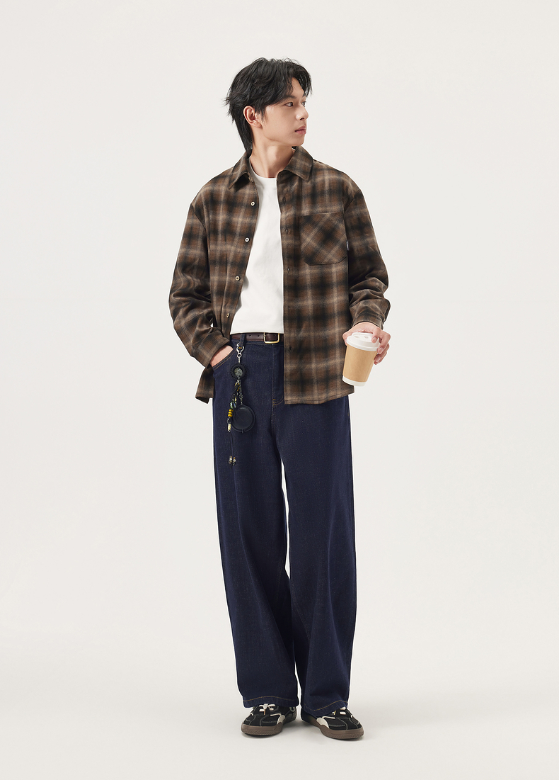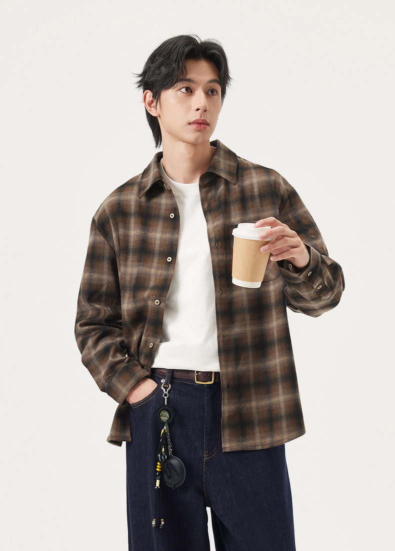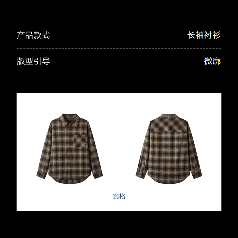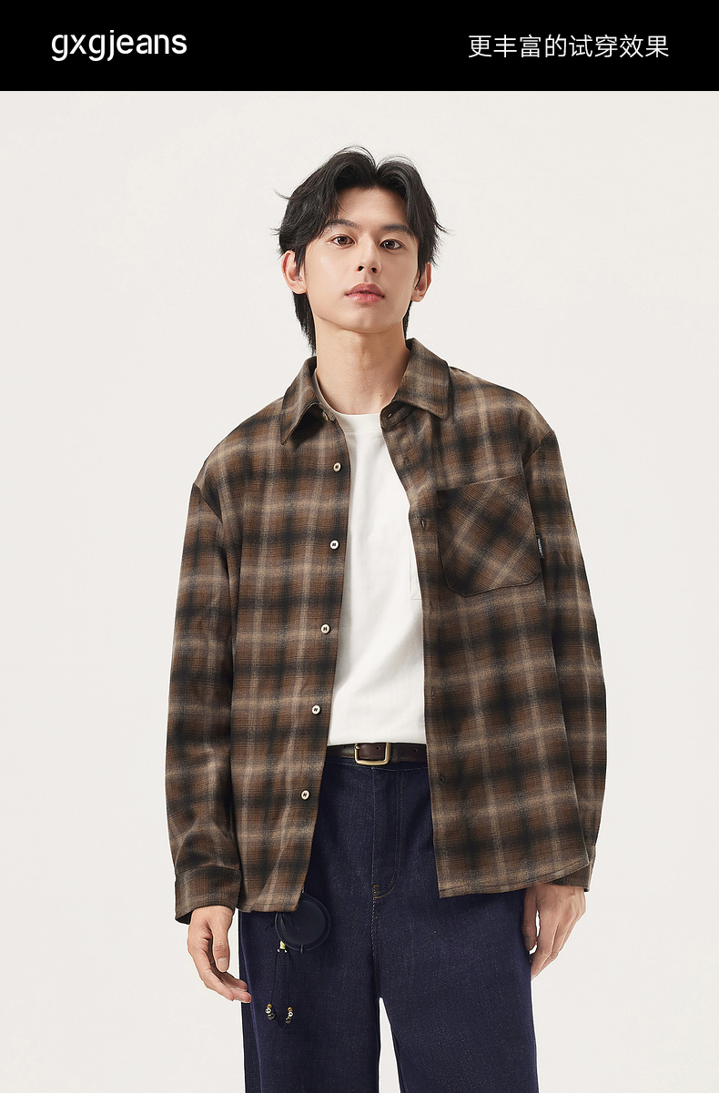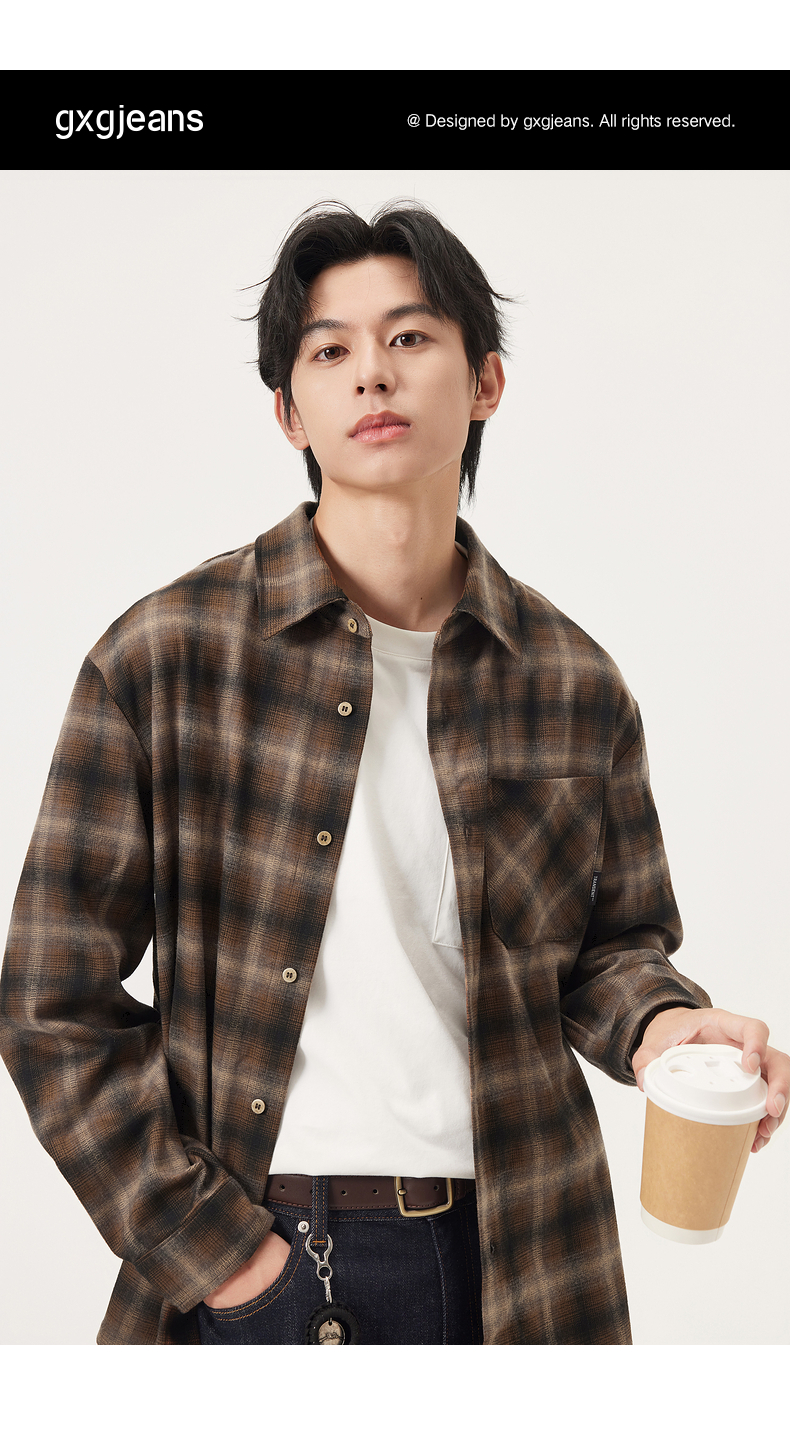 gxg.jeans男装 咖色格纹美式复古宽松长袖衬衫外套男 25年秋热卖
