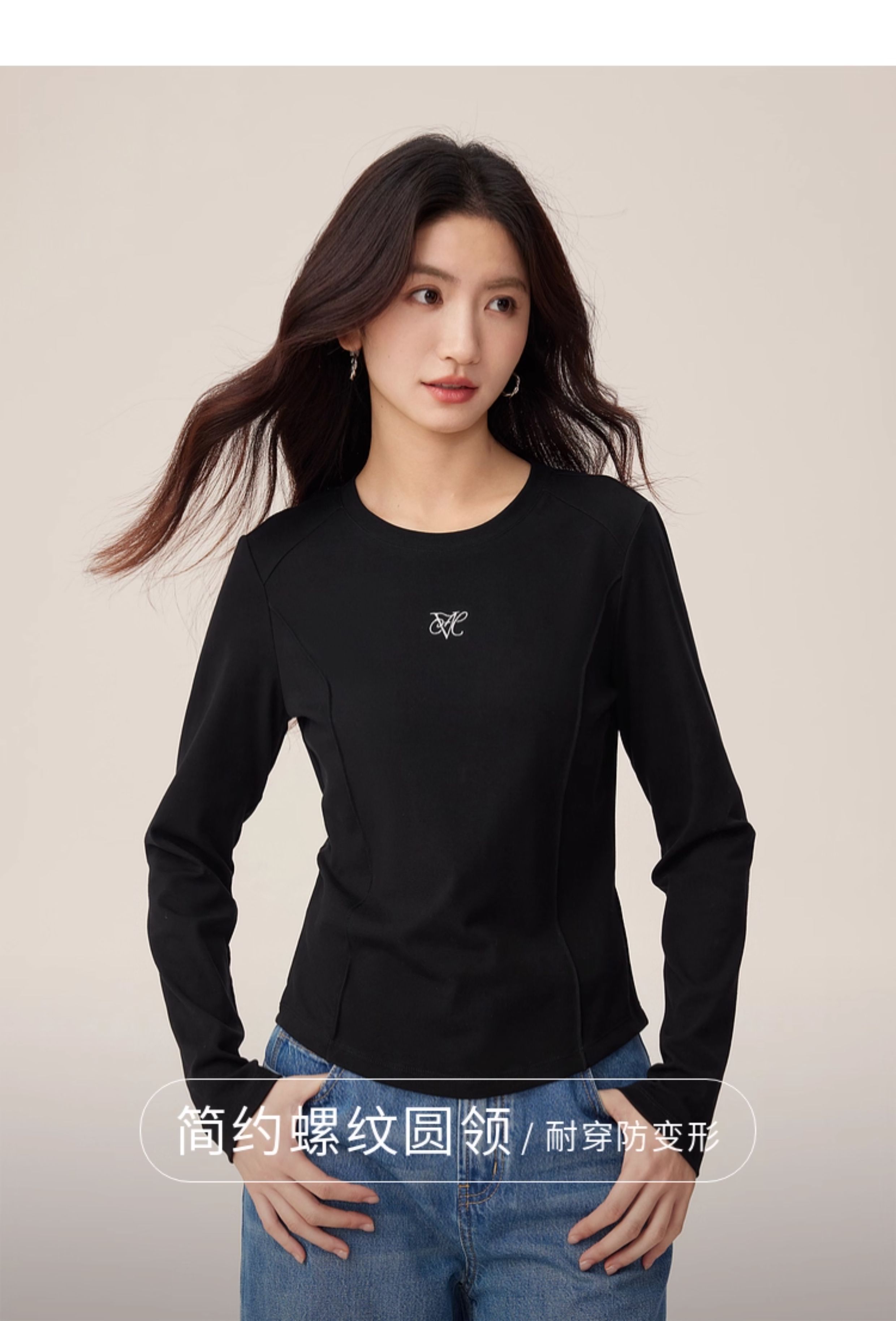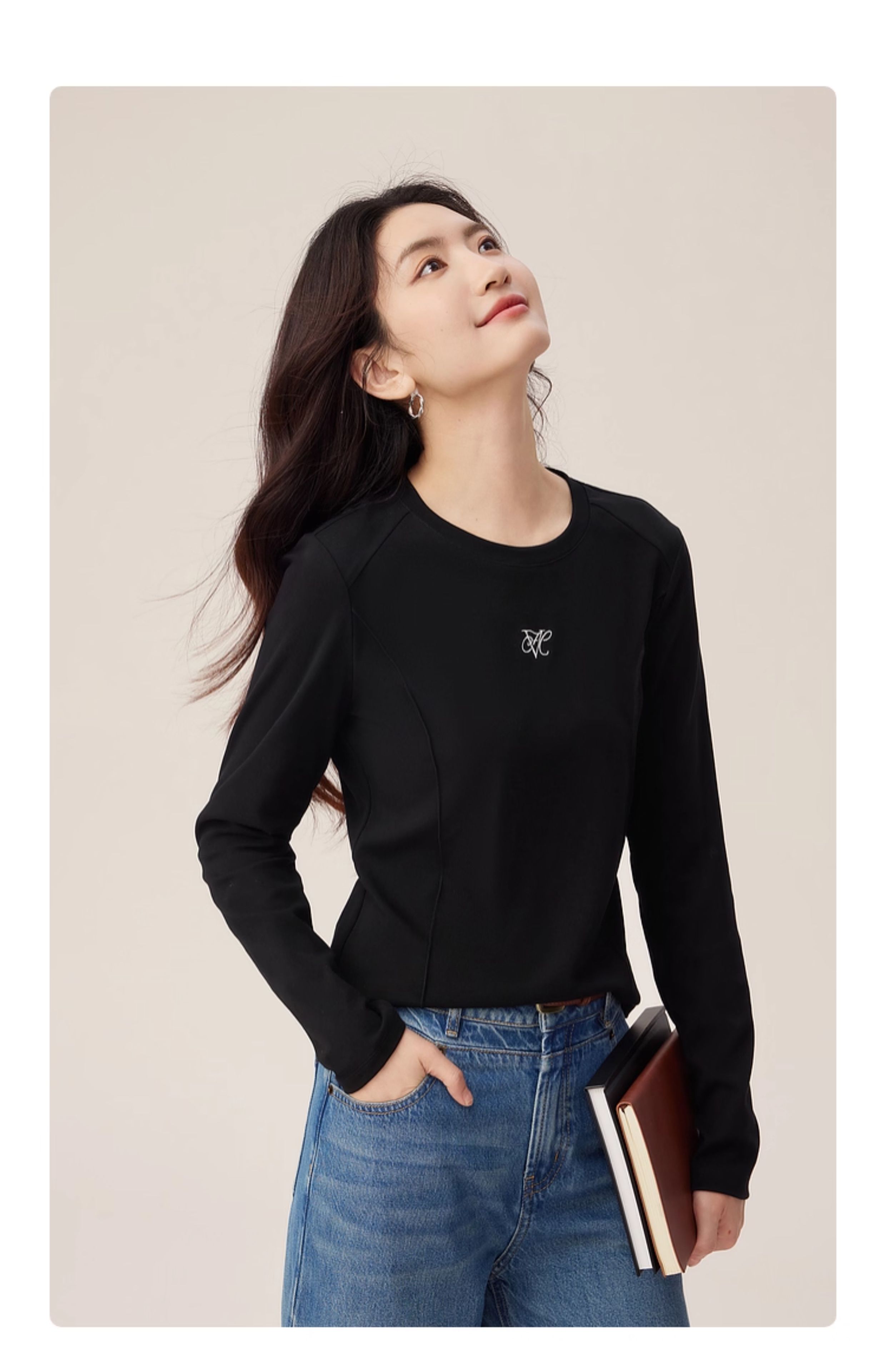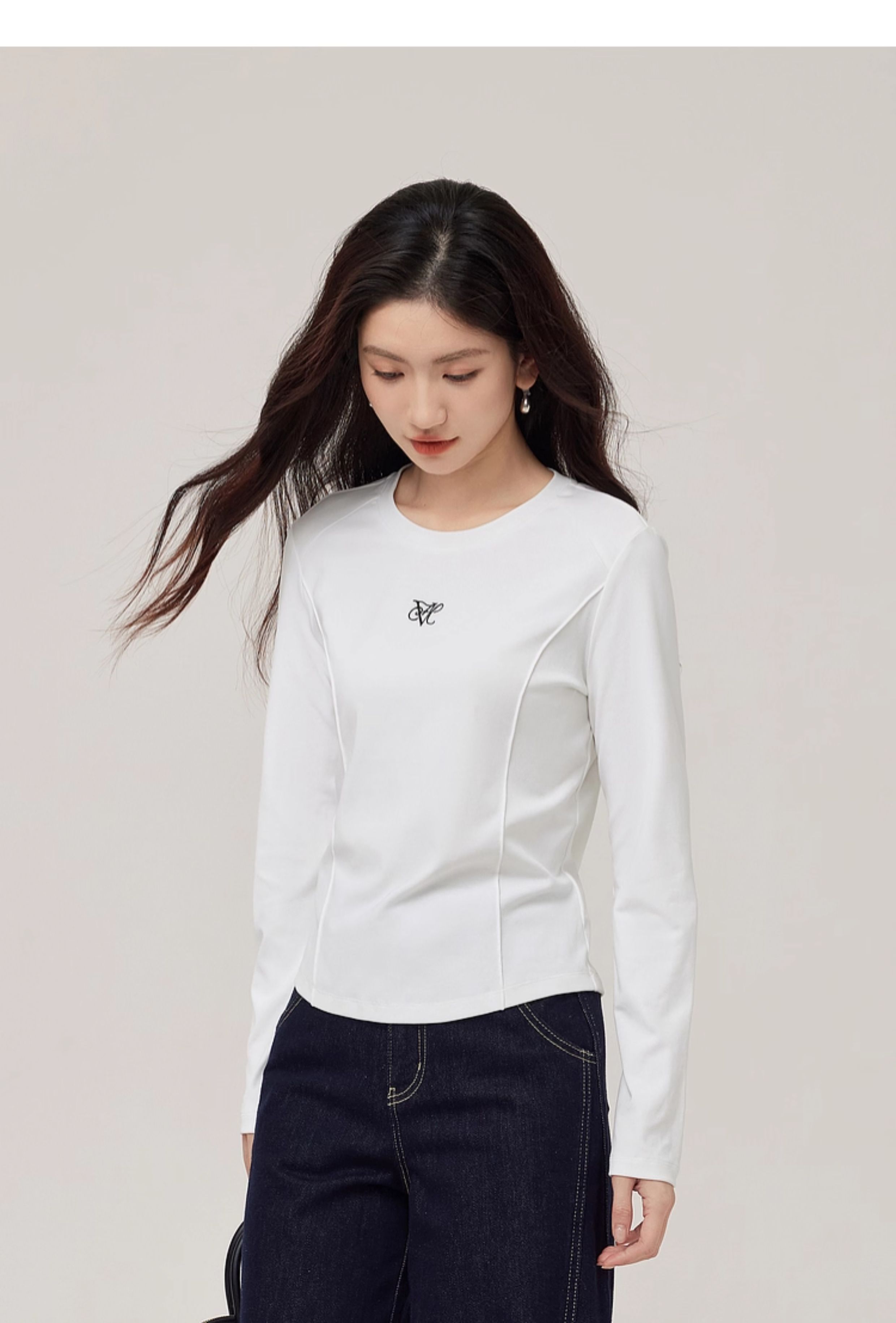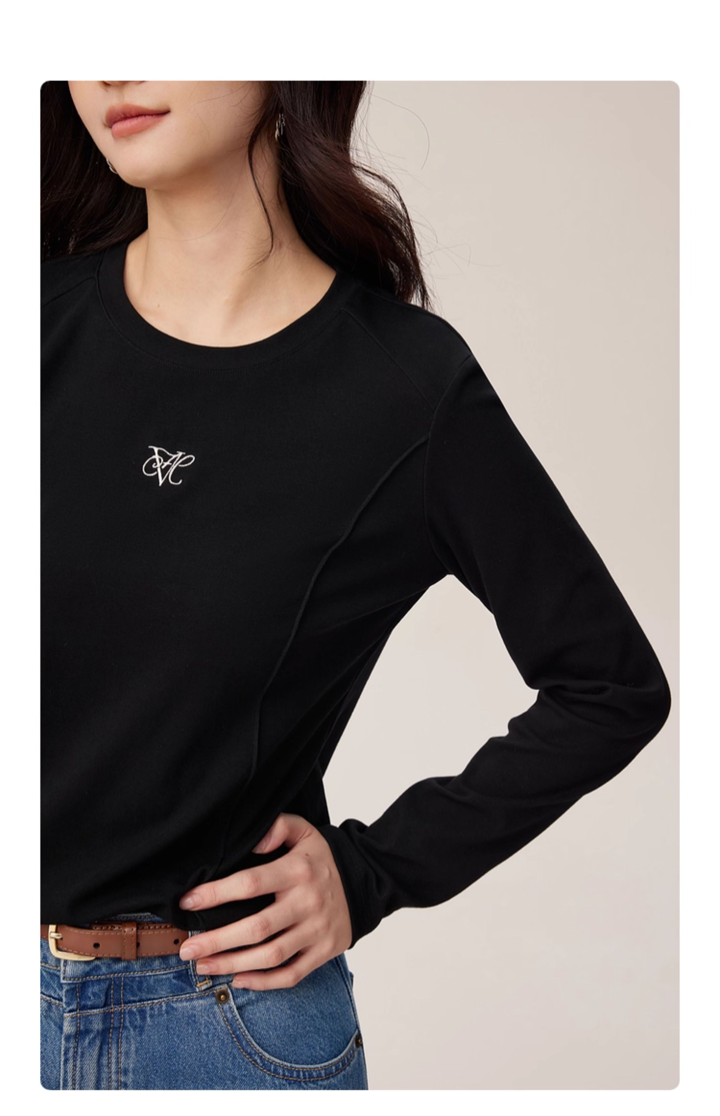 【08/27新品】熙世界鱼骨线收腰T恤长袖女2025秋季新款刺绣修身显瘦打底衫上衣