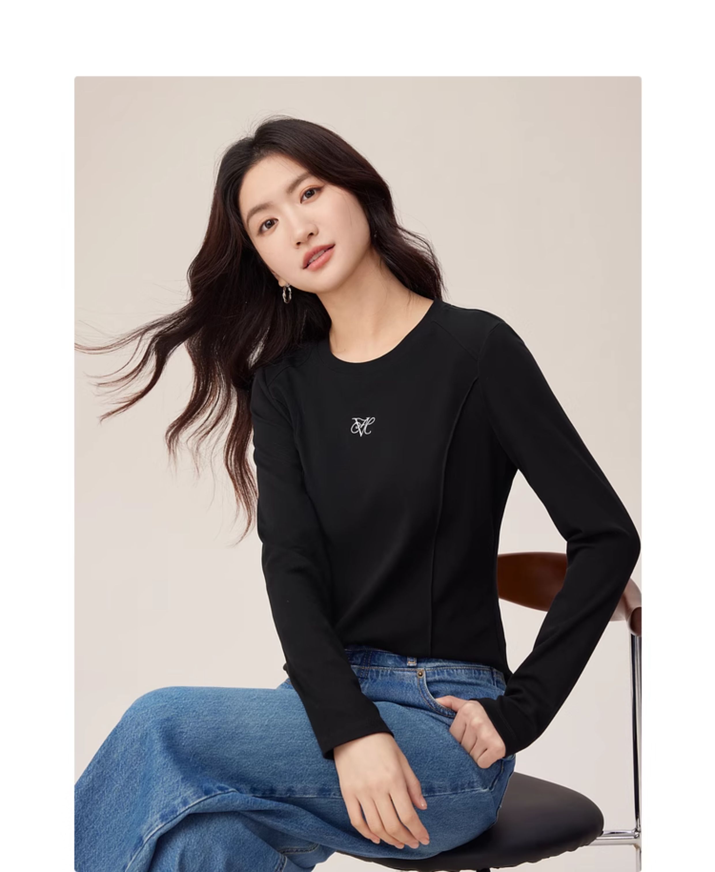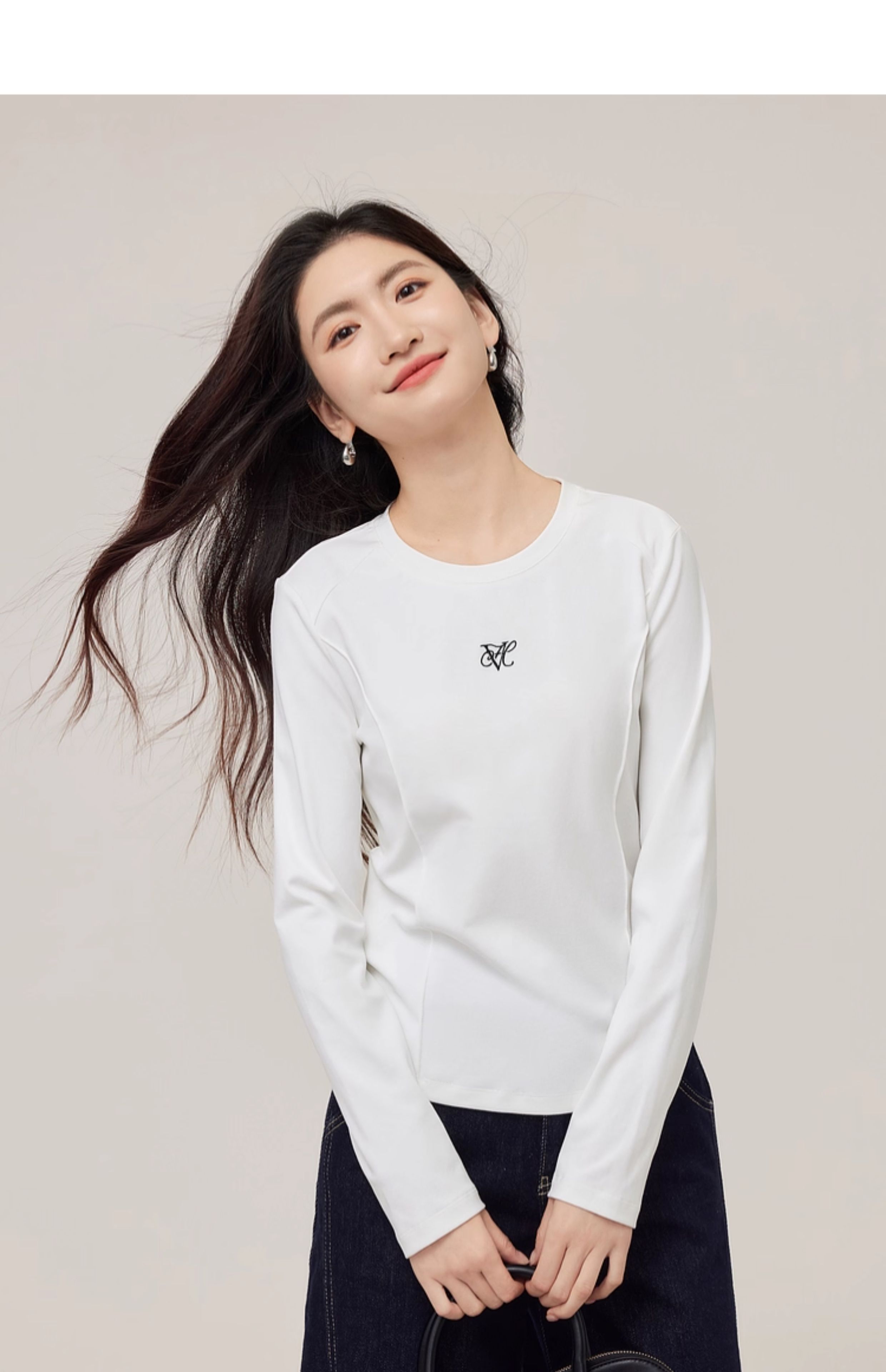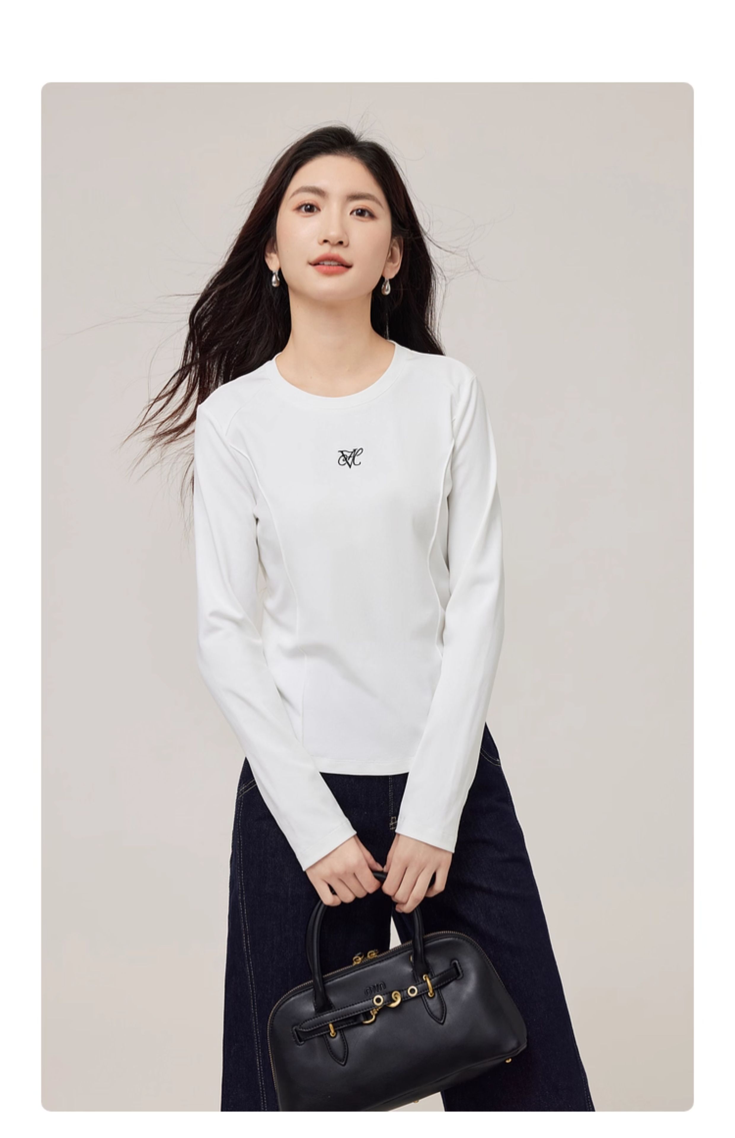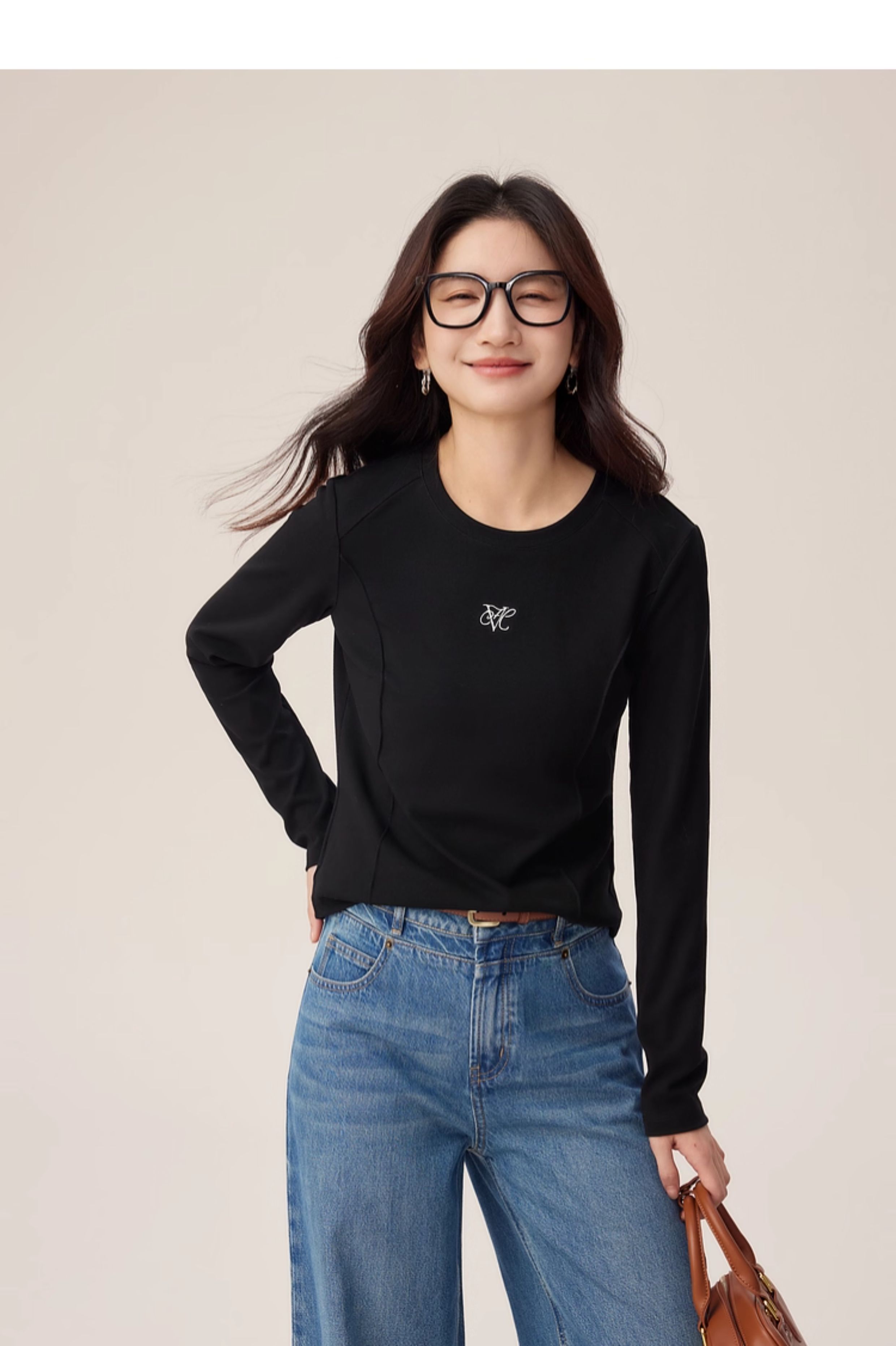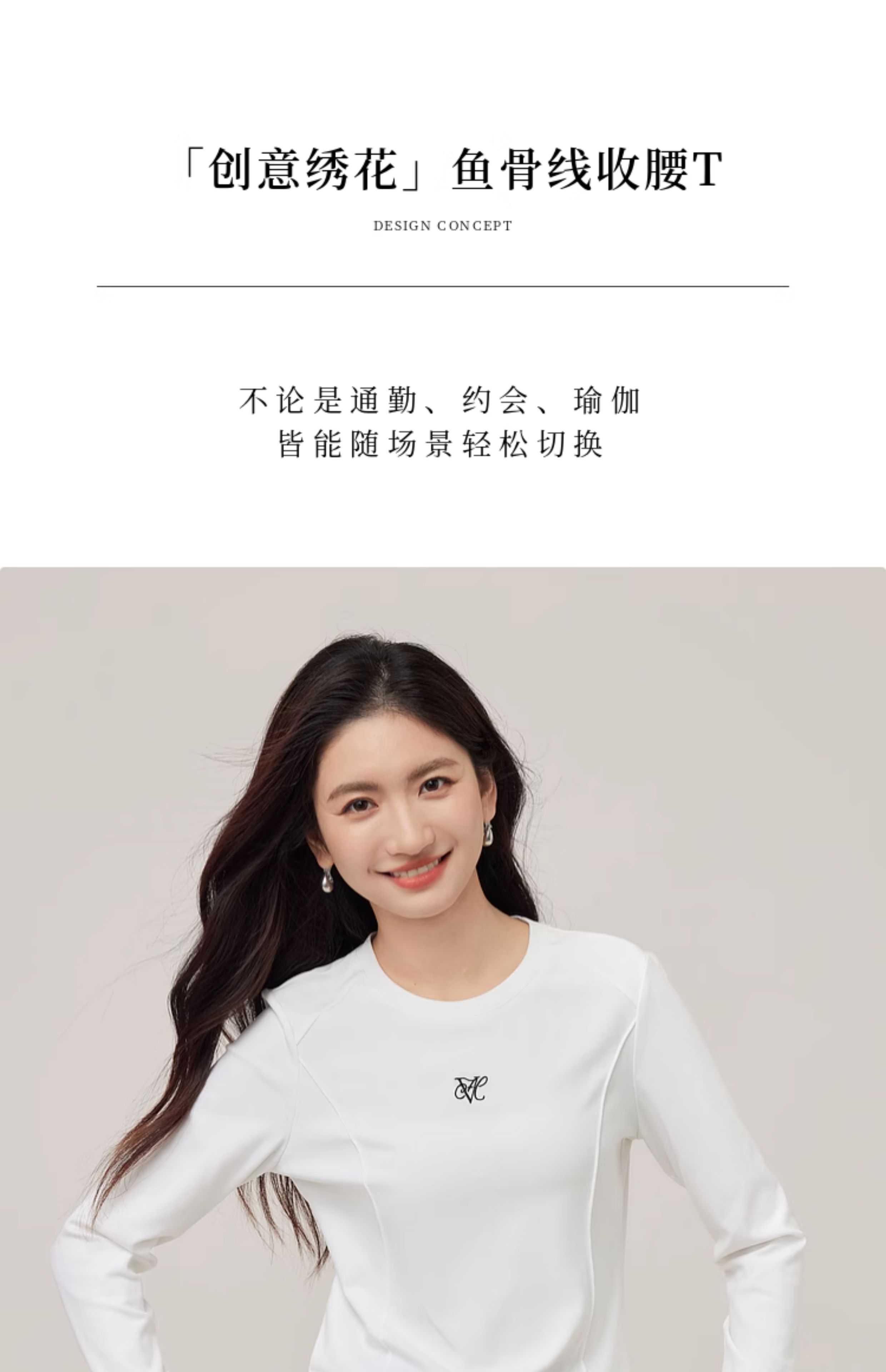 【08/27新品】熙世界鱼骨线收腰T恤长袖女2025秋季新款刺绣修身显瘦打底衫上衣