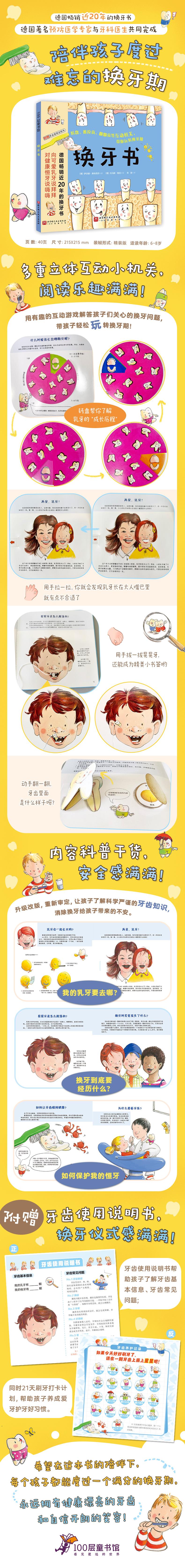 在这个日益注重外貌的时代,你认为C位出道的钥匙只有颜值爆表?错!孩子的牙齿也是隐藏的品牌。一口洁白健康的牙齿不仅会让孩子吃嘛嘛香,还会给孩子们带来健康的体魄、周正的面容,最重要的是给予孩子自信的心态。很多家长都认为,既然乳牙早晚会脱落,那么也不需要太重视,孩子长出恒牙来自然就好了。这当然是个错误的看法。乳牙的健康状况也会影响恒牙的萌出和生长。龋齿在口腔内造成的细菌环境会使新长出来的恒牙遭受侵害。所以从孩子们长出第一颗牙齿开始,一场爱牙护牙的大作战便打响了!我想德国经典科普绘本《换牙书》可以同家长和孩子好好聊聊换牙期的那些事儿!这本在德国畅销近20年的换牙书通过有趣可爱的互动机关设计,让孩子在扭动转盘,翻翻牙根内外结构,做做有趣小实验的过程中,收获更多关于牙齿的专业知识。这个过程将复杂、难以理解的知识以轻松、有趣的方式表现出来,可以让孩子在不知不觉之间消除对换牙期的迷茫与无措。五六岁时,孩子的心理会非常敏感,牙齿摇晃、脱落会不会影响美观,他们也许嘴上不问,心里却很在乎。此时,家长更应该多与孩子沟通,了解他们的想法,告诉他们有关换牙的知识,消除他们对未知的恐惧。而这本德国经典《换牙书》是由德国预防医学专家和牙科医生共同制作完成的,书中详细解答了孩子关于换牙期的各种疑问并告诉了他们爱护牙齿的重要性和注意事项,带孩子们度过满分换牙期。最后,我们此次还为孩子们准备了牙齿使用说明书,里面包含乳牙恒牙的基本信息,牙齿常见问题和21天认真刷牙打卡计划。帮助孩子在换牙期收获一套新的“牙齿”装备后,更好地认识它,了解它,维护它。这样才能更大地发挥它的作用。漂亮的牙齿,健康的身体,自信的笑容,是每一个家长对于孩子共同的心愿。在爱牙日这一天,希望所有爸爸妈妈们都可以和孩子们一起聊一聊牙齿健康的重要性,消除孩子对换牙期未知的恐惧,像这本《换牙书》中所讲的那样,认真清洁,细心呵护,保护每一颗牙齿,守卫住孩子们幸福的笑容,让他们健康快乐地成长!