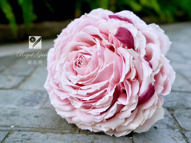 花艺选材:该花精选了10~12朵德国进口永生花玫瑰制成一朵超巨型永生玫瑰手捧花 。