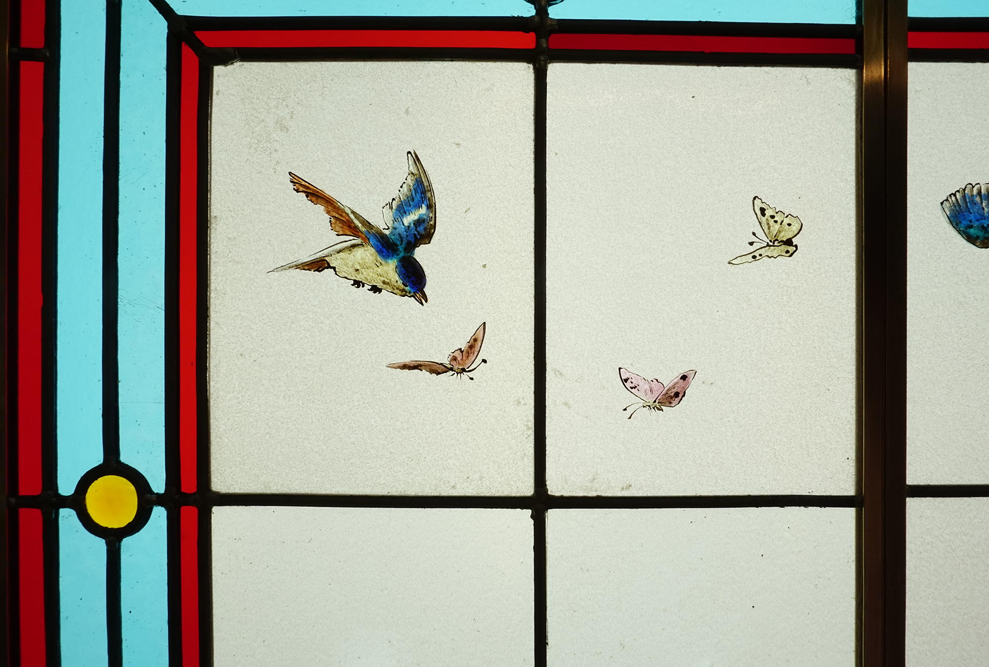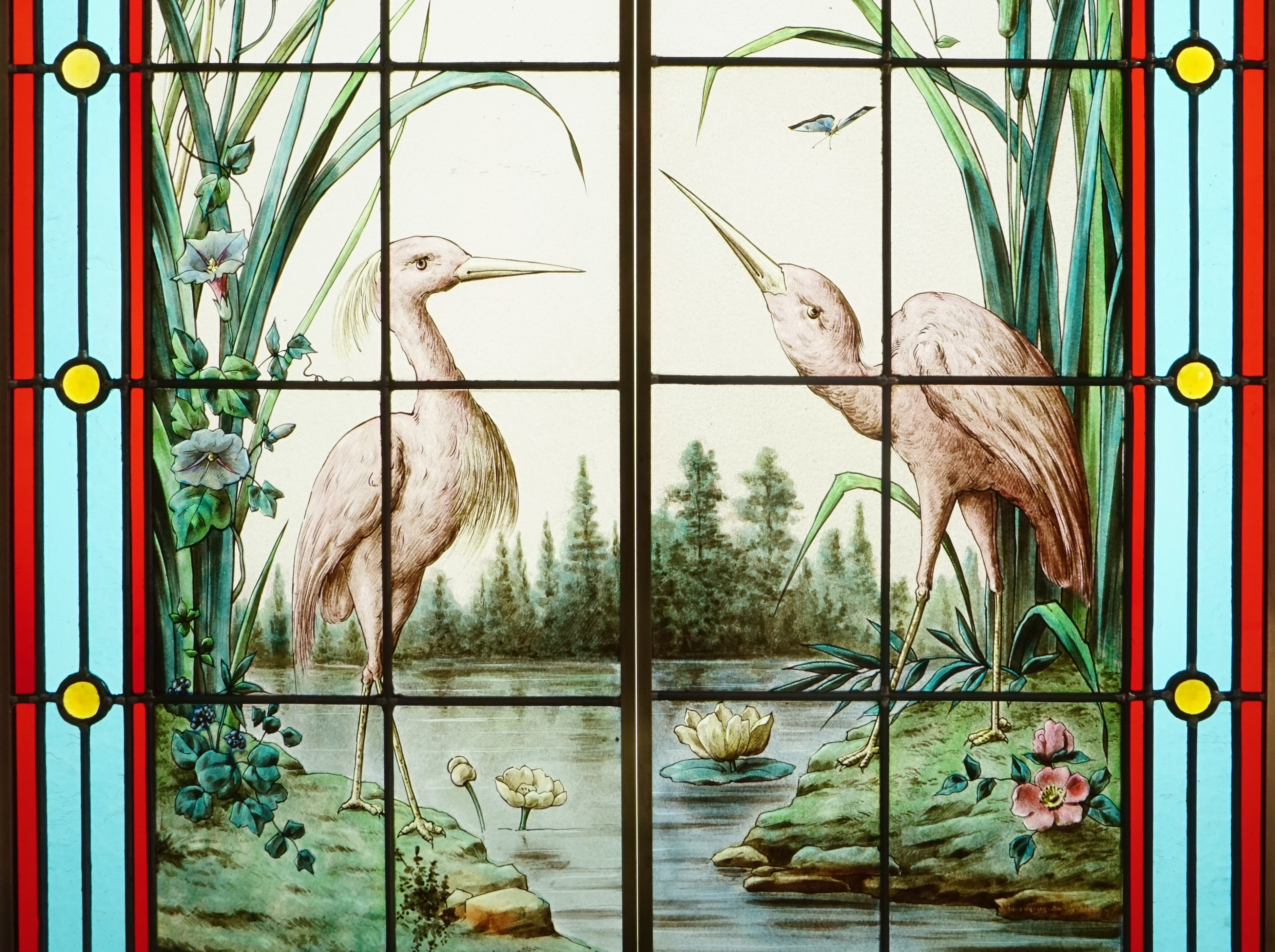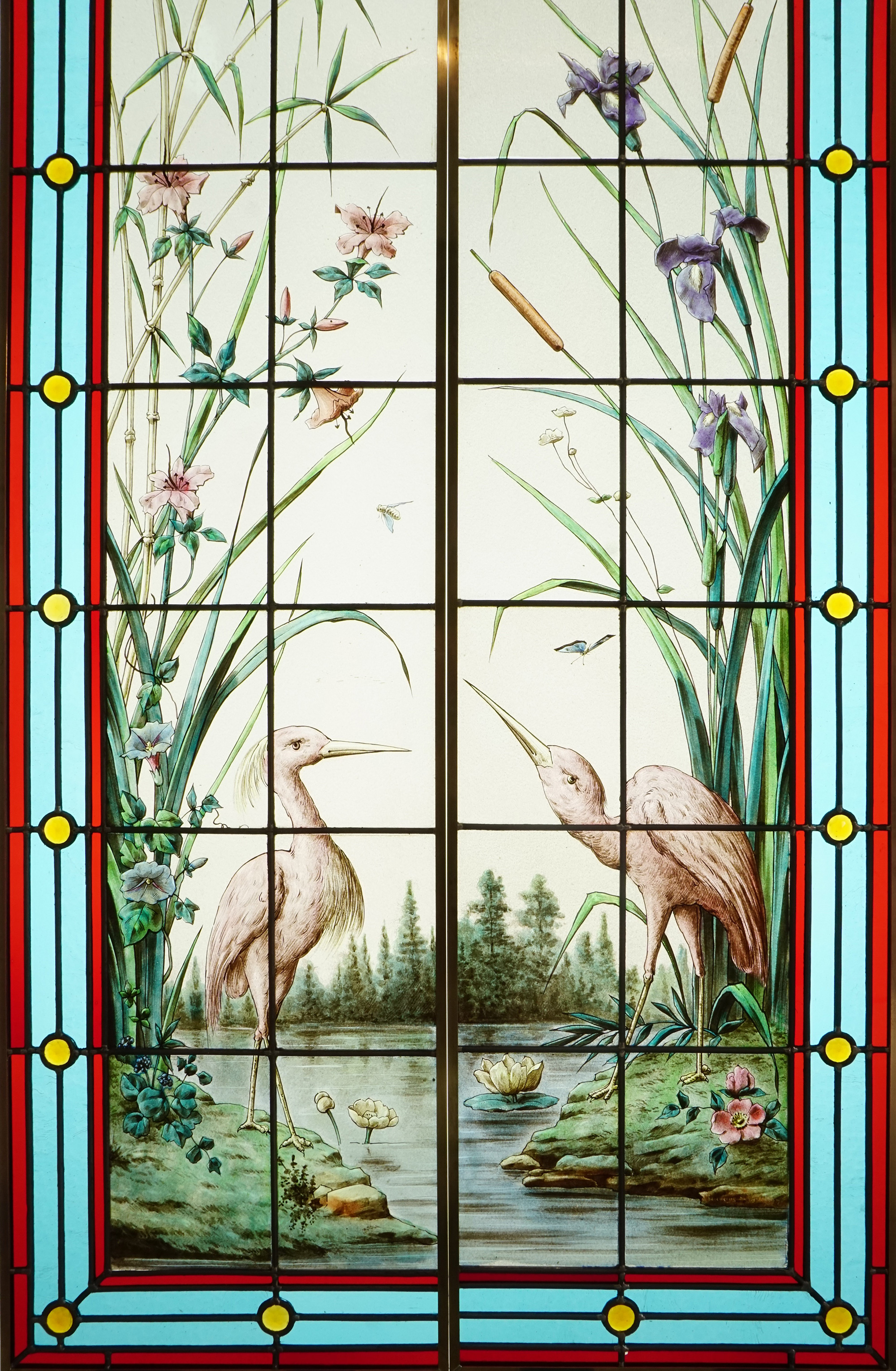 独角鹿西洋古董20世纪初法国新艺术风格时期著名画师Henri Curcier签名出品水岸风光主题彩绘玻璃花窗一对