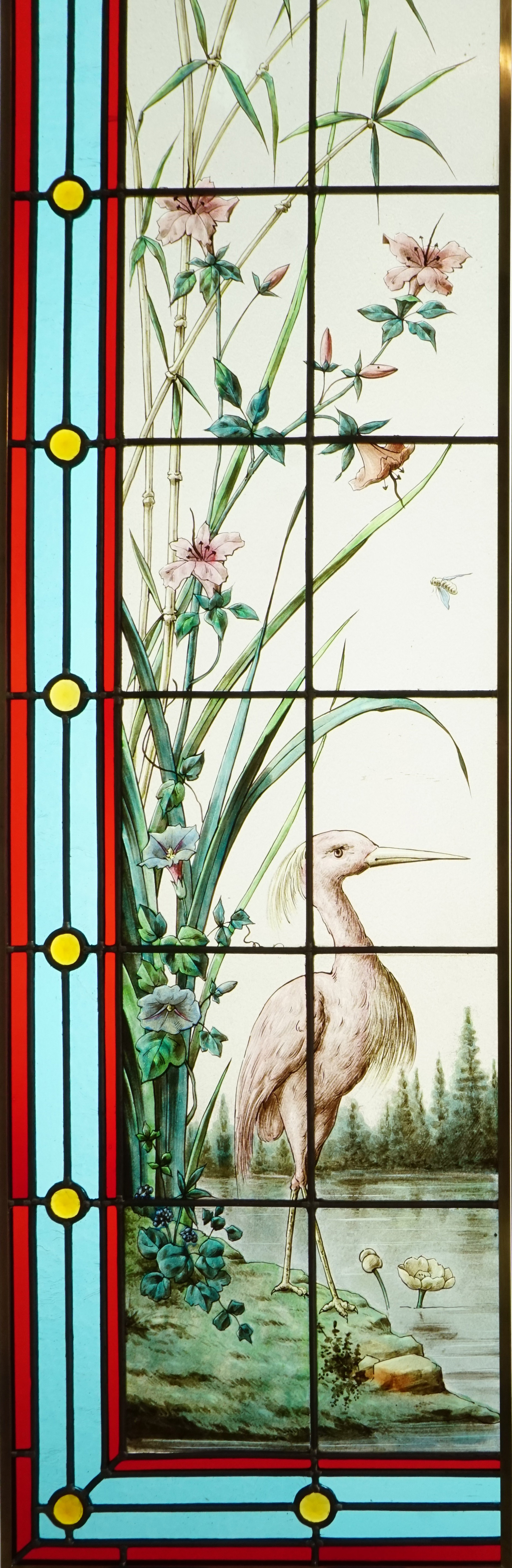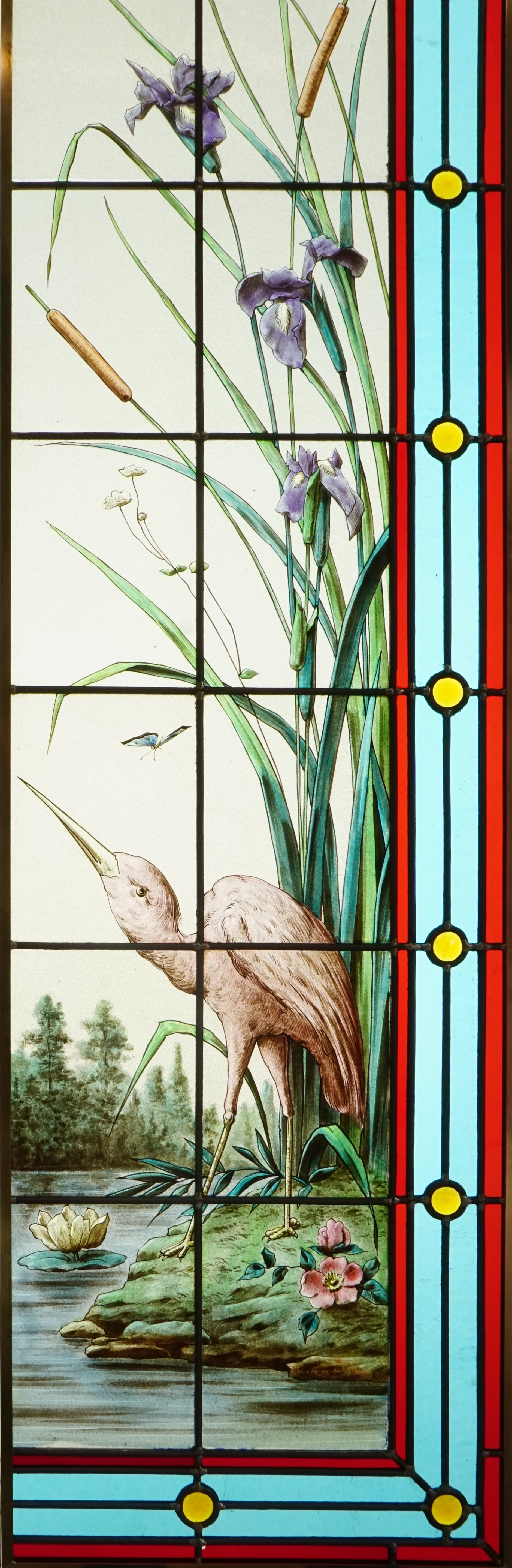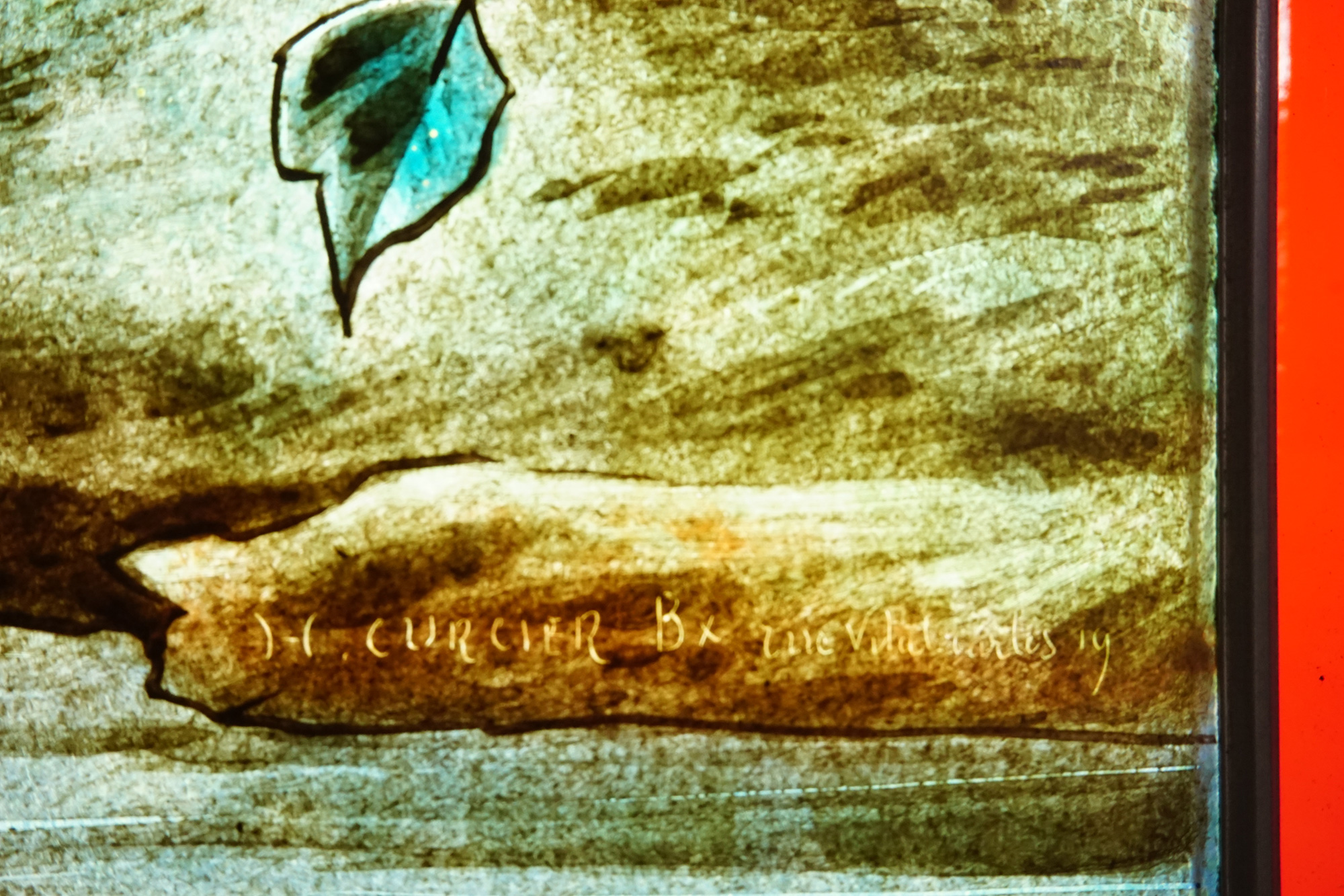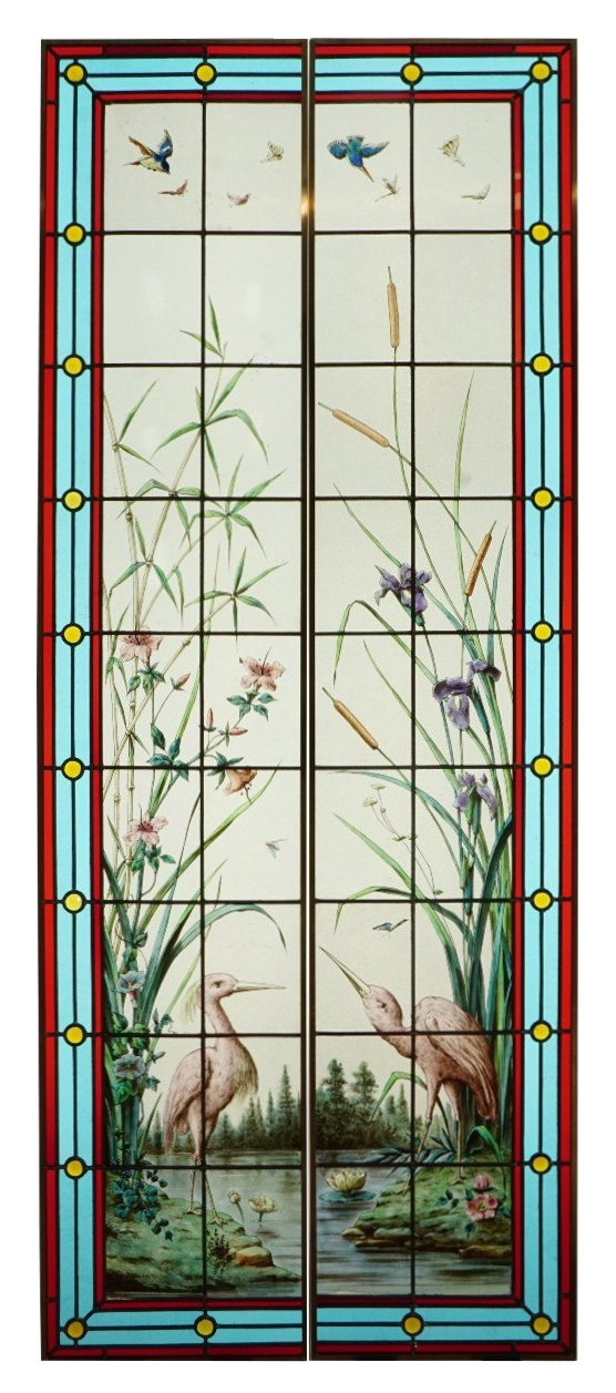 20世纪初法国新艺术风格时期著名画师Henri Curcier签名出品水岸风光主题彩绘玻璃花窗一对