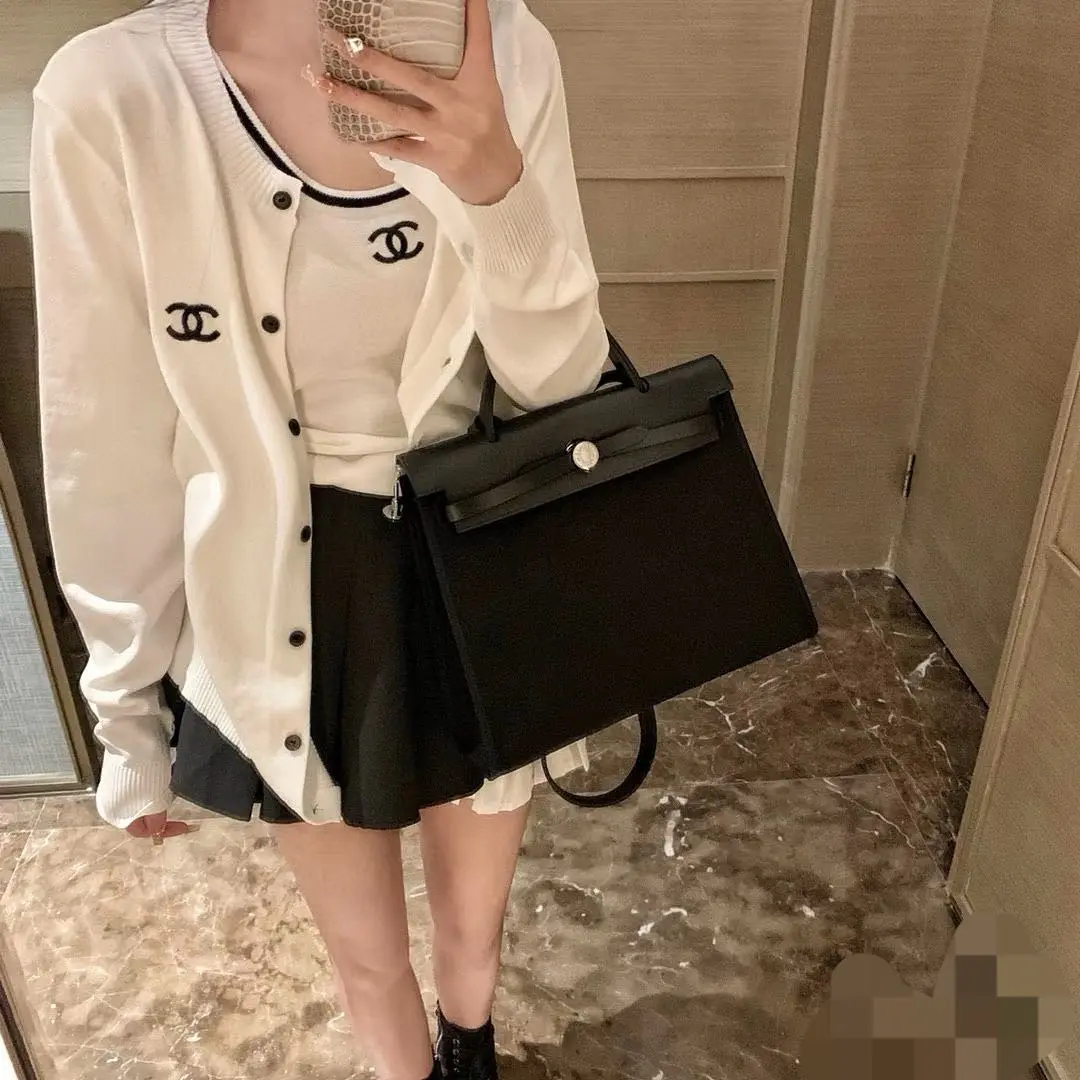 爱马仕 herbag 黑白 防水布 斜挎包