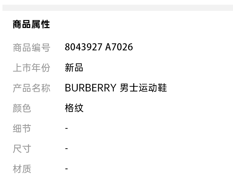 BURBERRY 巴宝莉 男士 Vintage 格纹和皮革系带休闲运动鞋 格子 8043927 A7026